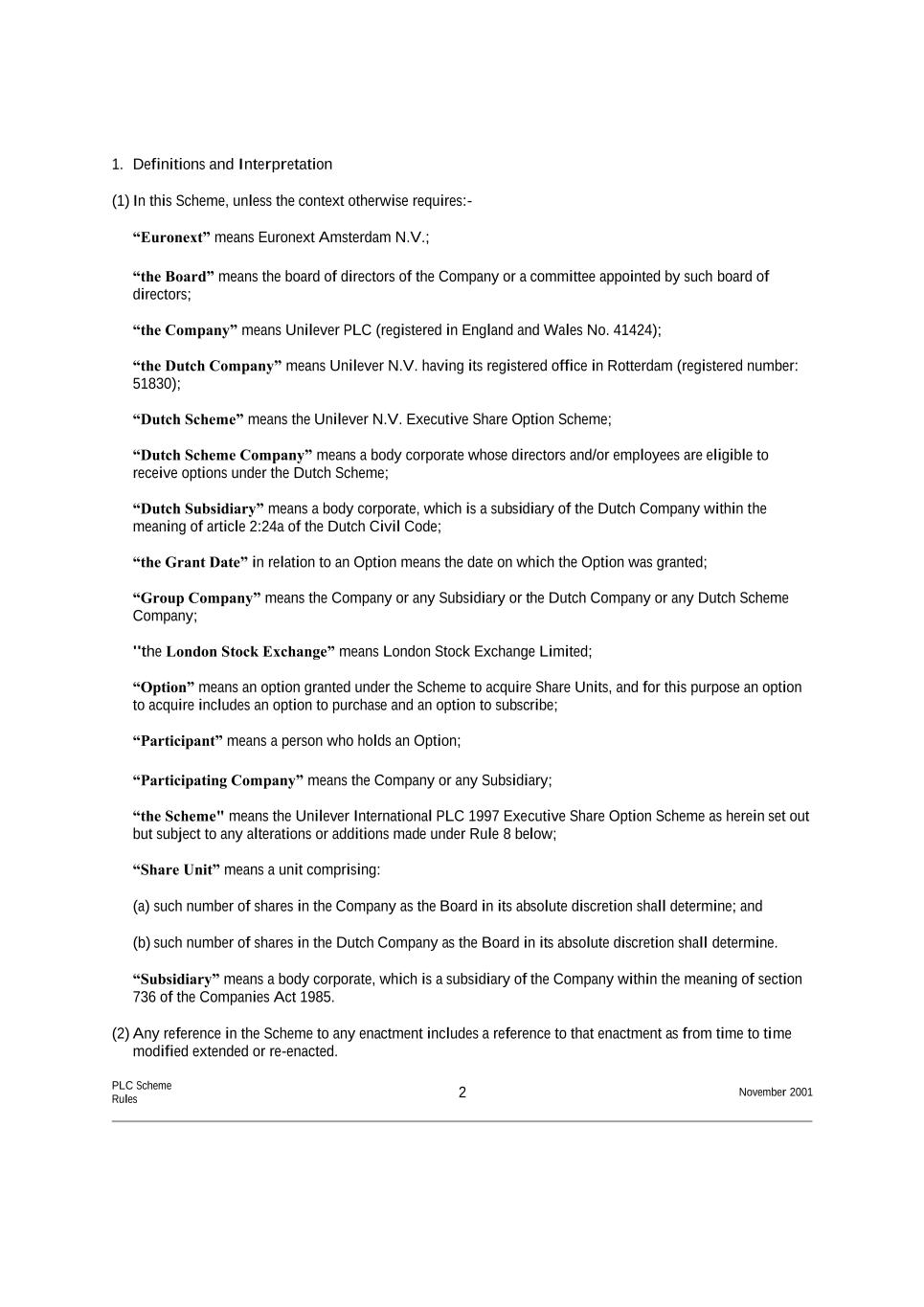 1. Definitions and Interpretation (1) In this Scheme, unless the context otherwise requires:- “Euronext” means Euronext Amsterdam N.V.; “the Board” means the board of directors of the Company or a committee appointed by such board of directors; “the Company” means Unilever PLC (registered in England and Wales No. 41424); “the Dutch Company” means Unilever N.V. having its registered office in Rotterdam (registered number: 51830); “Dutch Scheme” means the Unilever N.V. Executive Share Option Scheme; “Dutch Scheme Company” means a body corporate whose directors and/or employees are eligible to receive options under the Dutch Scheme; “Dutch Subsidiary” means a body corporate, which is a subsidiary of the Dutch Company within the meaning of article 2:24a of the Dutch Civil Code; “the Grant Date” in relation to an Option means the date on which the Option was granted; “Group Company” means the Company or any Subsidiary or the Dutch Company or any Dutch Scheme Company; "the London Stock Exchange” means London Stock Exchange Limited; “Option” means an option granted under the Scheme to acquire Share Units, and for this purpose an option to acquire includes an option to purchase and an option to subscribe; “Participant” means a person who holds an Option; “Participating Company” means the Company or any Subsidiary; “the Scheme" means the Unilever International PLC 1997 Executive Share Option Scheme as herein set out but subject to any alterations or additions made under Rule 8 below; “Share Unit” means a unit comprising: (a) such number of shares in the Company as the Board in its absolute discretion shall determine; and (b) such number of shares in the Dutch Company as the Board in its absolute discretion shall determine. “Subsidiary” means a body corporate, which is a subsidiary of the Company within the meaning of section 736 of the Companies Act 1985. (2) Any reference in the Scheme to any enactment includes a reference to that enactment as from time to time modified extended or re-enacted. PLC Scheme Rules 2 November 2001