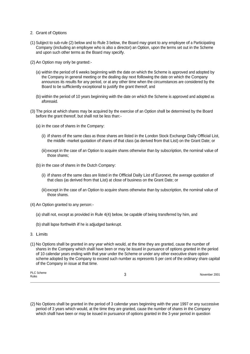 2. Grant of Options (1) Subject to sub-rule (2) below and to Rule 3 below, the Board may grant to any employee of a Participating Company (including an employee who is also a director) an Option, upon the terms set out in the Scheme and upon such other terms as the Board may specify. (2) An Option may only be granted:- (a) within the period of 6 weeks beginning with the date on which the Scheme is approved and adopted by the Company in general meeting or the dealing day next following the date on which the Company announces its results for any period, or at any other time when the circumstances are considered by the Board to be sufficiently exceptional to justify the grant thereof; and (b) within the period of 10 years beginning with the date on which the Scheme is approved and adopted as aforesaid. (3) The price at which shares may be acquired by the exercise of an Option shall be determined by the Board before the grant thereof, but shall not be less than:- (a) in the case of shares in the Company: (i) if shares of the same class as those shares are listed in the London Stock Exchange Daily Official List, the middle -market quotation of shares of that class (as derived from that List) on the Grant Date; or (ii) except in the case of an Option to acquire shares otherwise than by subscription, the nominal value of those shares; (b) in the case of shares in the Dutch Company: (i) if shares of the same class are listed in the Official Daily List of Euronext, the average quotation of that class (as derived from that List) at close of business on the Grant Date; or (ii) except in the case of an Option to acquire shares otherwise than by subscription, the nominal value of those shares. (4) An Option granted to any person:- (a) shall not, except as provided in Rule 4(4) below, be capable of being transferred by him, and (b) shall lapse forthwith if he is adjudged bankrupt. 3. Limits (1) No Options shall be granted in any year which would, at the time they are granted, cause the number of shares in the Company which shall have been or may be issued in pursuance of options granted in the period of 10 calendar years ending with that year under the Scheme or under any other executive share option scheme adopted by the Company to exceed such number as represents 5 per cent of the ordinary share capital of the Company in issue at that time. PLC Scheme Rules 3 November 2001 (2) No Options shall be granted in the period of 3 calendar years beginning with the year 1997 or any successive period of 3 years which would, at the time they are granted, cause the number of shares in the Company which shall have been or may be issued in pursuance of options granted in the 3-year period in question