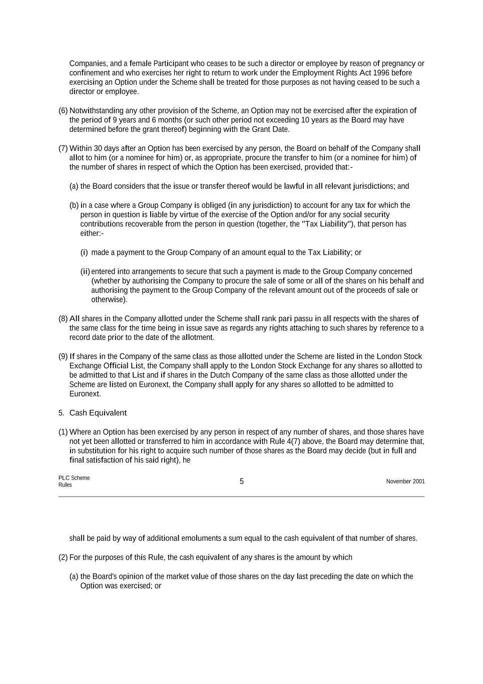 Companies, and a female Participant who ceases to be such a director or employee by reason of pregnancy or confinement and who exercises her right to return to work under the Employment Rights Act 1996 before exercising an Option under the Scheme shall be treated for those purposes as not having ceased to be such a director or employee. (6) Notwithstanding any other provision of the Scheme, an Option may not be exercised after the expiration of the period of 9 years and 6 months (or such other period not exceeding 10 years as the Board may have determined before the grant thereof) beginning with the Grant Date. (7) Within 30 days after an Option has been exercised by any person, the Board on behalf of the Company shall allot to him (or a nominee for him) or, as appropriate, procure the transfer to him (or a nominee for him) of the number of shares in respect of which the Option has been exercised, provided that:- (a) the Board considers that the issue or transfer thereof would be lawful in all relevant jurisdictions; and (b) in a case where a Group Company is obliged (in any jurisdiction) to account for any tax for which the person in question is liable by virtue of the exercise of the Option and/or for any social security contributions recoverable from the person in question (together, the "Tax Liability"), that person has either:- (i) made a payment to the Group Company of an amount equal to the Tax Liability; or (ii) entered into arrangements to secure that such a payment is made to the Group Company concerned (whether by authorising the Company to procure the sale of some or all of the shares on his behalf and authorising the payment to the Group Company of the relevant amount out of the proceeds of sale or otherwise). (8) All shares in the Company allotted under the Scheme shall rank pari passu in all respects with the shares of the same class for the time being in issue save as regards any rights attaching to such shares by reference to a record date prior to the date of the allotment. (9) If shares in the Company of the same class as those allotted under the Scheme are listed in the London Stock Exchange Official List, the Company shall apply to the London Stock Exchange for any shares so allotted to be admitted to that List and if shares in the Dutch Company of the same class as those allotted under the Scheme are listed on Euronext, the Company shall apply for any shares so allotted to be admitted to Euronext. 5. Cash Equivalent (1) Where an Option has been exercised by any person in respect of any number of shares, and those shares have not yet been allotted or transferred to him in accordance with Rule 4(7) above, the Board may determine that, in substitution for his right to acquire such number of those shares as the Board may decide (but in full and final satisfaction of his said right), he PLC Scheme Rules 5 November 2001 shall be paid by way of additional emoluments a sum equal to the cash equivalent of that number of shares. (2) For the purposes of this Rule, the cash equivalent of any shares is the amount by which (a) the Board's opinion of the market value of those shares on the day last preceding the date on which the Option was exercised; or