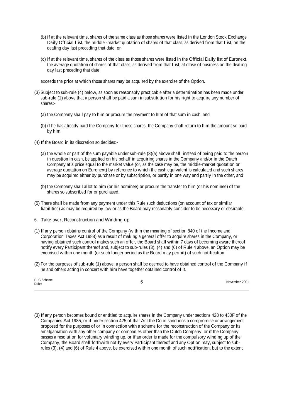 (b) if at the relevant time, shares of the same class as those shares were listed in the London Stock Exchange Daily Official List, the middle -market quotation of shares of that class, as derived from that List, on the dealing day last preceding that date; or (c) if at the relevant time, shares of the class as those shares were listed in the Official Daily list of Euronext, the average quotation of shares of that class, as derived from that List, at close of business on the dealing day last preceding that date exceeds the price at which those shares may be acquired by the exercise of the Option. (3) Subject to sub-rule (4) below, as soon as reasonably practicable after a determination has been made under sub-rule (1) above that a person shall be paid a sum in substitution for his right to acquire any number of shares:- (a) the Company shall pay to him or procure the payment to him of that sum in cash, and (b) if he has already paid the Company for those shares, the Company shall return to him the amount so paid by him. (4) If the Board in its discretion so decides:- (a) the whole or part of the sum payable under sub-rule (3)(a) above shall, instead of being paid to the person in question in cash, be applied on his behalf in acquiring shares in the Company and/or in the Dutch Company at a price equal to the market value (or, as the case may be, the middle-market quotation or average quotation on Euronext) by reference to which the cash equivalent is calculated and such shares may be acquired either by purchase or by subscription, or partly in one way and partly in the other, and (b) the Company shall allot to him (or his nominee) or procure the transfer to him (or his nominee) of the shares so subscribed for or purchased. (5) There shall be made from any payment under this Rule such deductions (on account of tax or similar liabilities) as may be required by law or as the Board may reasonably consider to be necessary or desirable. 6. Take-over, Reconstruction and Winding-up (1) If any person obtains control of the Company (within the meaning of section 840 of the Income and Corporation Taxes Act 1988) as a result of making a general offer to acquire shares in the Company, or having obtained such control makes such an offer, the Board shall within 7 days of becoming aware thereof notify every Participant thereof and, subject to sub-rules (3), (4) and (6) of Rule 4 above, an Option may be exercised within one month (or such longer period as the Board may permit) of such notification. (2) For the purposes of sub-rule (1) above, a person shall be deemed to have obtained control of the Company if he and others acting in concert with him have together obtained control of it. PLC Scheme Rules 6 November 2001 (3) If any person becomes bound or entitled to acquire shares in the Company under sections 428 to 430F of the Companies Act 1985, or if under section 425 of that Act the Court sanctions a compromise or arrangement proposed for the purposes of or in connection with a scheme for the reconstruction of the Company or its amalgamation with any other company or companies other than the Dutch Company, or if the Company passes a resolution for voluntary winding up, or if an order is made for the compulsory winding up of the Company, the Board shall forthwith notify every Participant thereof and any Option may, subject to sub- rules (3), (4) and (6) of Rule 4 above, be exercised within one month of such notification, but to the extent