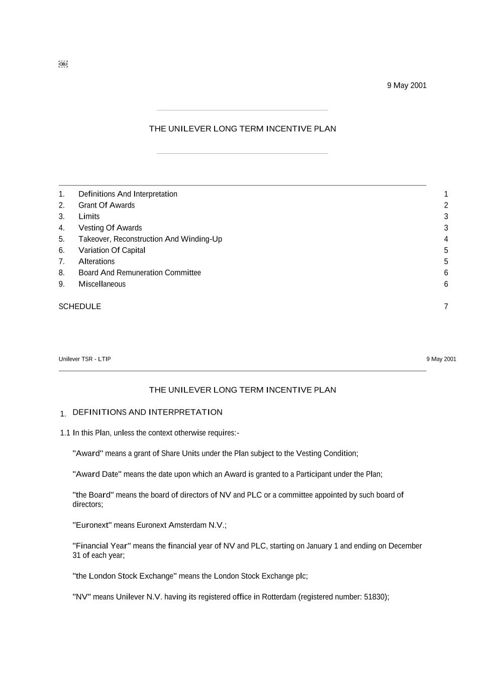 9 May 2001 THE UNILEVER LONG TERM INCENTIVE PLAN 1. Definitions And Interpretation 1 2. Grant Of Awards 2 3. Limits 3 4. Vesting Of Awards 3 5. Takeover, Reconstruction And Winding-Up 4 6. Variation Of Capital 5 7. Alterations 5 8. Board And Remuneration Committee 6 9. Miscellaneous 6 SCHEDULE 7 Unilever TSR - LTIP 9 May 2001 THE UNILEVER LONG TERM INCENTIVE PLAN 1. DEFINITIONS AND INTERPRETATION 1.1 In this Plan, unless the context otherwise requires:- "Award" means a grant of Share Units under the Plan subject to the Vesting Condition; "Award Date" means the date upon which an Award is granted to a Participant under the Plan; "the Board" means the board of directors of NV and PLC or a committee appointed by such board of directors; "Euronext" means Euronext Amsterdam N.V.; "Financial Year" means the financial year of NV and PLC, starting on January 1 and ending on December 31 of each year; "the London Stock Exchange" means the London Stock Exchange plc; "NV" means Unilever N.V. having its registered office in Rotterdam (registered number: 51830);