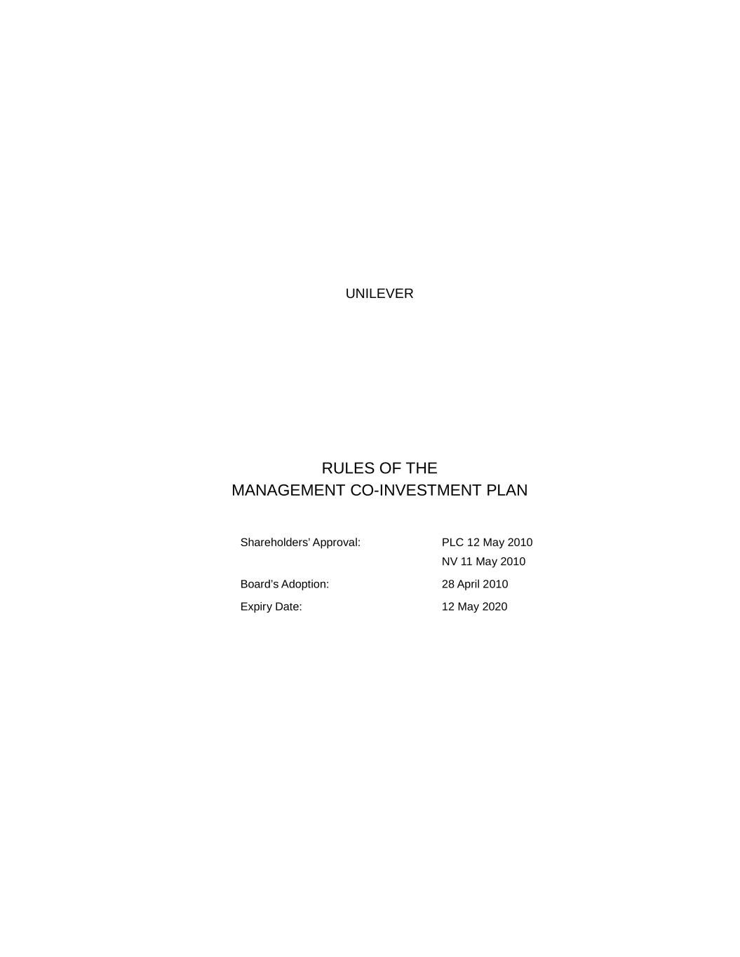 UNILEVER RULES OF THE MANAGEMENT CO-INVESTMENT PLAN Shareholders’ Approval: PLC 12 May 2010 NV 11 May 2010 Board’s Adoption: 28 April 2010 Expiry Date: 12 May 2020