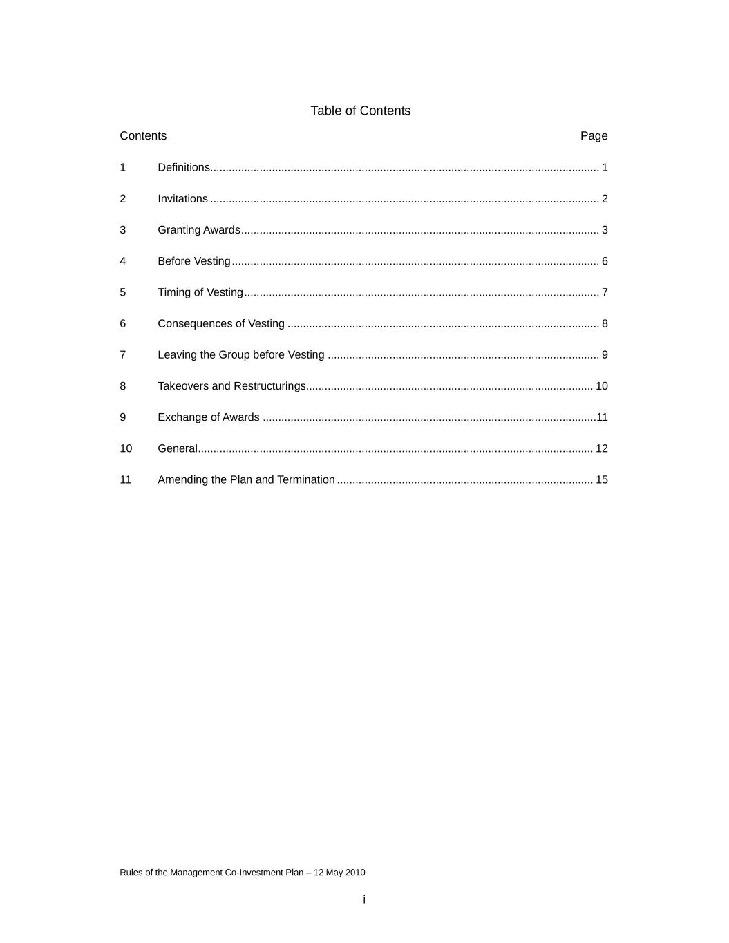 Rules of the Management Co-Investment Plan – 12 May 2010 i Table of Contents Contents Page 1 Definitions.............................................................................................................................. 1 2 Invitations .............................................................................................................................. 2 3 Granting Awards.................................................................................................................... 3 4 Before Vesting....................................................................................................................... 6 5 Timing of Vesting................................................................................................................... 7 6 Consequences of Vesting ..................................................................................................... 8 7 Leaving the Group before Vesting ........................................................................................ 9 8 Takeovers and Restructurings............................................................................................. 10 9 Exchange of Awards ............................................................................................................11 10 General................................................................................................................................ 12 11 Amending the Plan and Termination ................................................................................... 15