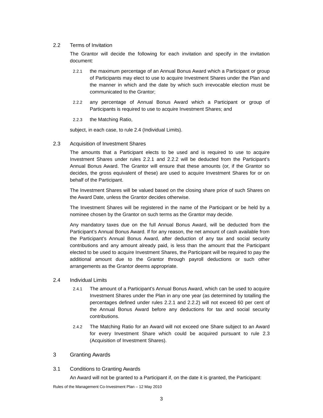 Rules of the Management Co-Investment Plan – 12 May 2010 3 2.2 Terms of Invitation The Grantor will decide the following for each invitation and specify in the invitation document: 2.2.1 the maximum percentage of an Annual Bonus Award which a Participant or group of Participants may elect to use to acquire Investment Shares under the Plan and the manner in which and the date by which such irrevocable election must be communicated to the Grantor; 2.2.2 any percentage of Annual Bonus Award which a Participant or group of Participants is required to use to acquire Investment Shares; and 2.2.3 the Matching Ratio, subject, in each case, to rule 2.4 (Individual Limits). 2.3 Acquisition of Investment Shares The amounts that a Participant elects to be used and is required to use to acquire Investment Shares under rules 2.2.1 and 2.2.2 will be deducted from the Participant’s Annual Bonus Award. The Grantor will ensure that these amounts (or, if the Grantor so decides, the gross equivalent of these) are used to acquire Investment Shares for or on behalf of the Participant. The Investment Shares will be valued based on the closing share price of such Shares on the Award Date, unless the Grantor decides otherwise. The Investment Shares will be registered in the name of the Participant or be held by a nominee chosen by the Grantor on such terms as the Grantor may decide. Any mandatory taxes due on the full Annual Bonus Award, will be deducted from the Participant’s Annual Bonus Award. If for any reason, the net amount of cash available from the Participant’s Annual Bonus Award, after deduction of any tax and social security contributions and any amount already paid, is less than the amount that the Participant elected to be used to acquire Investment Shares, the Participant will be required to pay the additional amount due to the Grantor through payroll deductions or such other arrangements as the Grantor deems appropriate. 2.4 Individual Limits 2.4.1 The amount of a Participant’s Annual Bonus Award, which can be used to acquire Investment Shares under the Plan in any one year (as determined by totalling the percentages defined under rules 2.2.1 and 2.2.2) will not exceed 60 per cent of the Annual Bonus Award before any deductions for tax and social security contributions. 2.4.2 The Matching Ratio for an Award will not exceed one Share subject to an Award for every Investment Share which could be acquired pursuant to rule 2.3 (Acquisition of Investment Shares). 3 Granting Awards 3.1 Conditions to Granting Awards An Award will not be granted to a Participant if, on the date it is granted, the Participant: