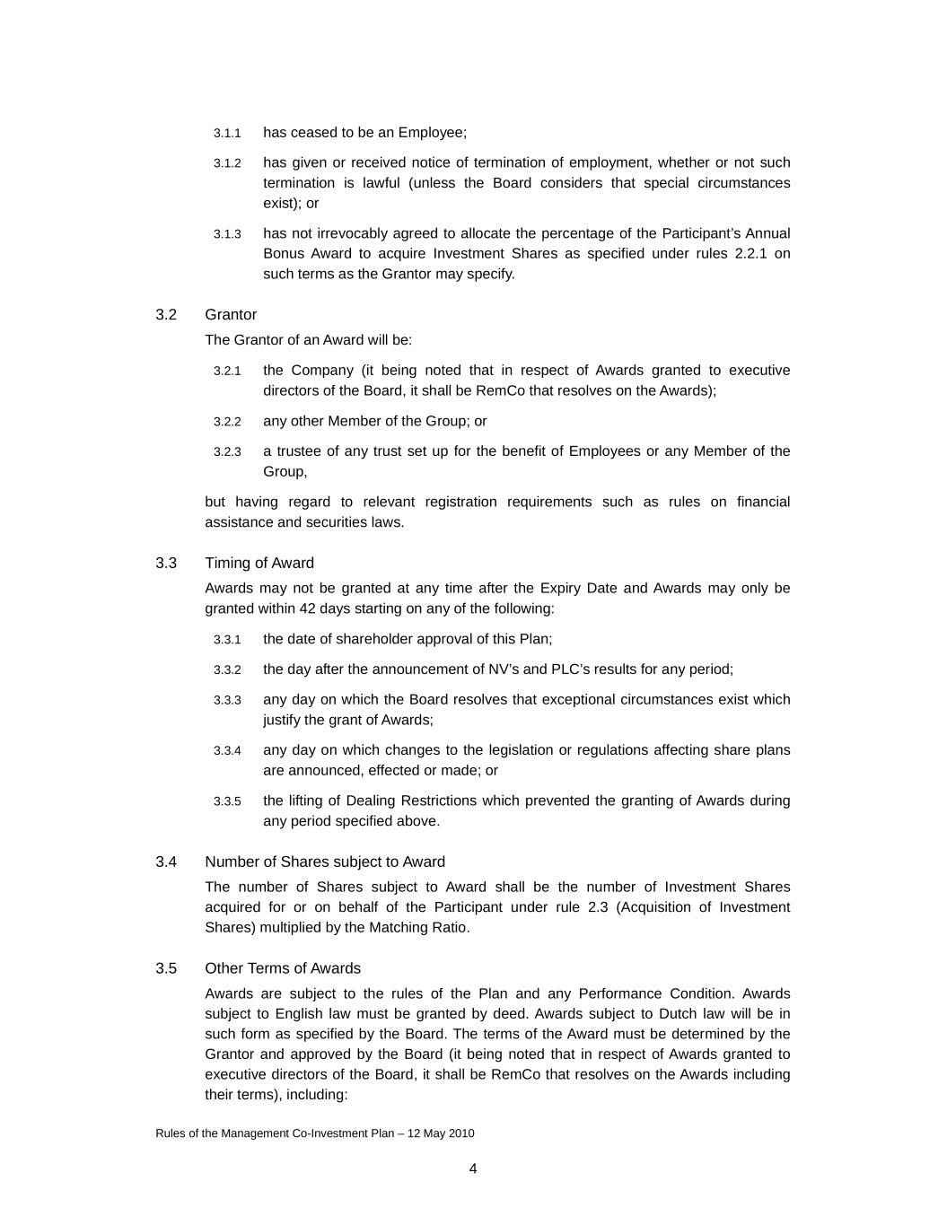 Rules of the Management Co-Investment Plan – 12 May 2010 4 3.1.1 has ceased to be an Employee; 3.1.2 has given or received notice of termination of employment, whether or not such termination is lawful (unless the Board considers that special circumstances exist); or 3.1.3 has not irrevocably agreed to allocate the percentage of the Participant’s Annual Bonus Award to acquire Investment Shares as specified under rules 2.2.1 on such terms as the Grantor may specify. 3.2 Grantor The Grantor of an Award will be: 3.2.1 the Company (it being noted that in respect of Awards granted to executive directors of the Board, it shall be RemCo that resolves on the Awards); 3.2.2 any other Member of the Group; or 3.2.3 a trustee of any trust set up for the benefit of Employees or any Member of the Group, but having regard to relevant registration requirements such as rules on financial assistance and securities laws. 3.3 Timing of Award Awards may not be granted at any time after the Expiry Date and Awards may only be granted within 42 days starting on any of the following: 3.3.1 the date of shareholder approval of this Plan; 3.3.2 the day after the announcement of NV’s and PLC’s results for any period; 3.3.3 any day on which the Board resolves that exceptional circumstances exist which justify the grant of Awards; 3.3.4 any day on which changes to the legislation or regulations affecting share plans are announced, effected or made; or 3.3.5 the lifting of Dealing Restrictions which prevented the granting of Awards during any period specified above. 3.4 Number of Shares subject to Award The number of Shares subject to Award shall be the number of Investment Shares acquired for or on behalf of the Participant under rule 2.3 (Acquisition of Investment Shares) multiplied by the Matching Ratio. 3.5 Other Terms of Awards Awards are subject to the rules of the Plan and any Performance Condition. Awards subject to English law must be granted by deed. Awards subject to Dutch law will be in such form as specified by the Board. The terms of the Award must be determined by the Grantor and approved by the Board (it being noted that in respect of Awards granted to executive directors of the Board, it shall be RemCo that resolves on the Awards including their terms), including: