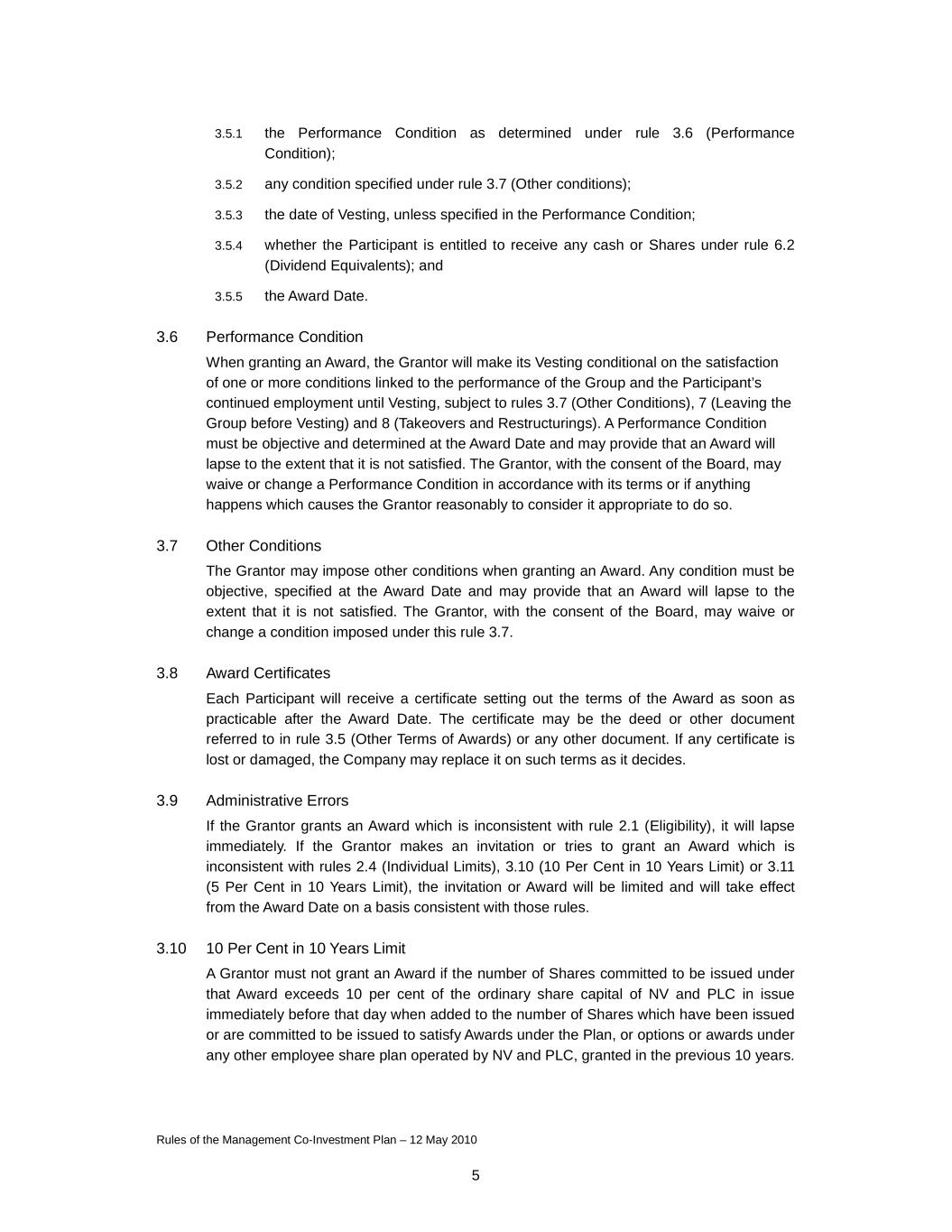 Rules of the Management Co-Investment Plan – 12 May 2010 5 3.5.1 the Performance Condition as determined under rule 3.6 (Performance Condition); 3.5.2 any condition specified under rule 3.7 (Other conditions); 3.5.3 the date of Vesting, unless specified in the Performance Condition; 3.5.4 whether the Participant is entitled to receive any cash or Shares under rule 6.2 (Dividend Equivalents); and 3.5.5 the Award Date. 3.6 Performance Condition When granting an Award, the Grantor will make its Vesting conditional on the satisfaction of one or more conditions linked to the performance of the Group and the Participant’s continued employment until Vesting, subject to rules 3.7 (Other Conditions), 7 (Leaving the Group before Vesting) and 8 (Takeovers and Restructurings). A Performance Condition must be objective and determined at the Award Date and may provide that an Award will lapse to the extent that it is not satisfied. The Grantor, with the consent of the Board, may waive or change a Performance Condition in accordance with its terms or if anything happens which causes the Grantor reasonably to consider it appropriate to do so. 3.7 Other Conditions The Grantor may impose other conditions when granting an Award. Any condition must be objective, specified at the Award Date and may provide that an Award will lapse to the extent that it is not satisfied. The Grantor, with the consent of the Board, may waive or change a condition imposed under this rule 3.7. 3.8 Award Certificates Each Participant will receive a certificate setting out the terms of the Award as soon as practicable after the Award Date. The certificate may be the deed or other document referred to in rule 3.5 (Other Terms of Awards) or any other document. If any certificate is lost or damaged, the Company may replace it on such terms as it decides. 3.9 Administrative Errors If the Grantor grants an Award which is inconsistent with rule 2.1 (Eligibility), it will lapse immediately. If the Grantor makes an invitation or tries to grant an Award which is inconsistent with rules 2.4 (Individual Limits), 3.10 (10 Per Cent in 10 Years Limit) or 3.11 (5 Per Cent in 10 Years Limit), the invitation or Award will be limited and will take effect from the Award Date on a basis consistent with those rules. 3.10 10 Per Cent in 10 Years Limit A Grantor must not grant an Award if the number of Shares committed to be issued under that Award exceeds 10 per cent of the ordinary share capital of NV and PLC in issue immediately before that day when added to the number of Shares which have been issued or are committed to be issued to satisfy Awards under the Plan, or options or awards under any other employee share plan operated by NV and PLC, granted in the previous 10 years.