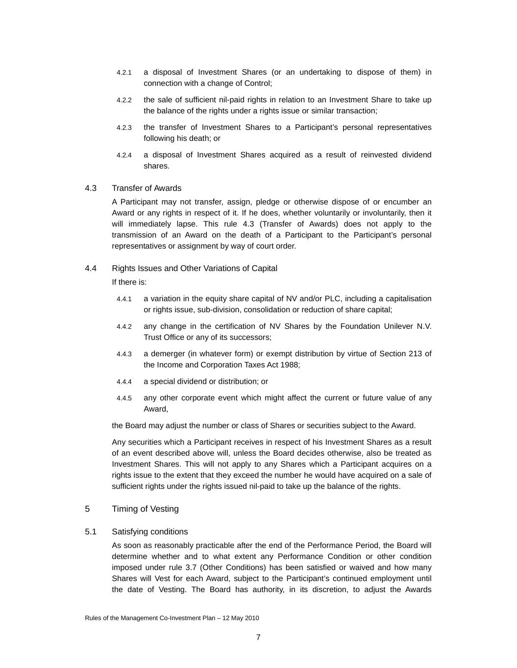 Rules of the Management Co-Investment Plan – 12 May 2010 7 4.2.1 a disposal of Investment Shares (or an undertaking to dispose of them) in connection with a change of Control; 4.2.2 the sale of sufficient nil-paid rights in relation to an Investment Share to take up the balance of the rights under a rights issue or similar transaction; 4.2.3 the transfer of Investment Shares to a Participant’s personal representatives following his death; or 4.2.4 a disposal of Investment Shares acquired as a result of reinvested dividend shares. 4.3 Transfer of Awards A Participant may not transfer, assign, pledge or otherwise dispose of or encumber an Award or any rights in respect of it. If he does, whether voluntarily or involuntarily, then it will immediately lapse. This rule 4.3 (Transfer of Awards) does not apply to the transmission of an Award on the death of a Participant to the Participant’s personal representatives or assignment by way of court order. 4.4 Rights Issues and Other Variations of Capital If there is: 4.4.1 a variation in the equity share capital of NV and/or PLC, including a capitalisation or rights issue, sub-division, consolidation or reduction of share capital; 4.4.2 any change in the certification of NV Shares by the Foundation Unilever N.V. Trust Office or any of its successors; 4.4.3 a demerger (in whatever form) or exempt distribution by virtue of Section 213 of the Income and Corporation Taxes Act 1988; 4.4.4 a special dividend or distribution; or 4.4.5 any other corporate event which might affect the current or future value of any Award, the Board may adjust the number or class of Shares or securities subject to the Award. Any securities which a Participant receives in respect of his Investment Shares as a result of an event described above will, unless the Board decides otherwise, also be treated as Investment Shares. This will not apply to any Shares which a Participant acquires on a rights issue to the extent that they exceed the number he would have acquired on a sale of sufficient rights under the rights issued nil-paid to take up the balance of the rights. 5 Timing of Vesting 5.1 Satisfying conditions As soon as reasonably practicable after the end of the Performance Period, the Board will determine whether and to what extent any Performance Condition or other condition imposed under rule 3.7 (Other Conditions) has been satisfied or waived and how many Shares will Vest for each Award, subject to the Participant’s continued employment until the date of Vesting. The Board has authority, in its discretion, to adjust the Awards