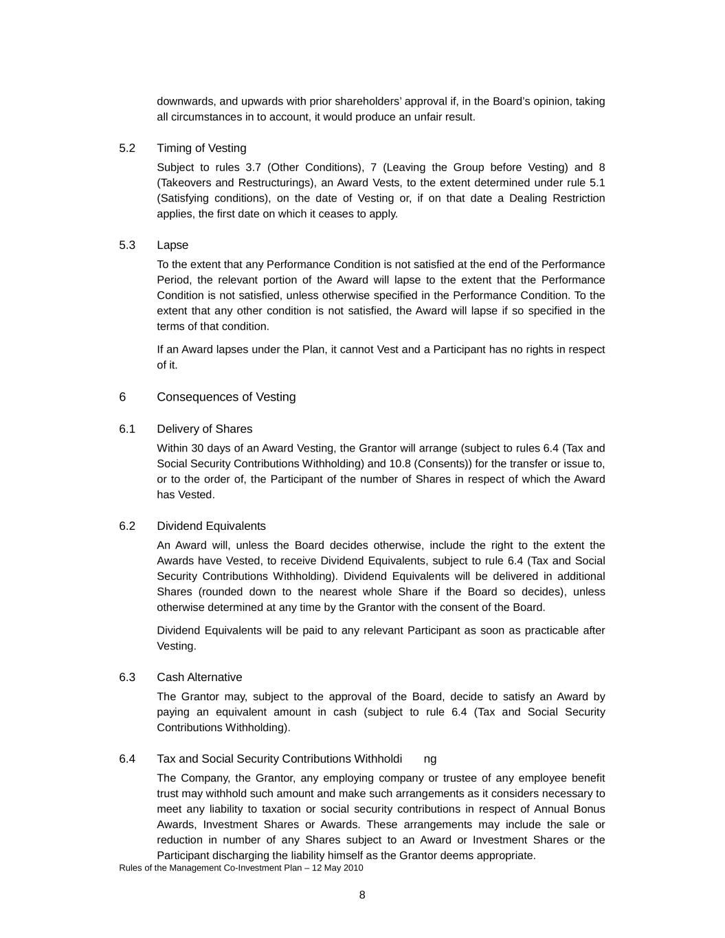 Rules of the Management Co-Investment Plan – 12 May 2010 8 downwards, and upwards with prior shareholders’ approval if, in the Board’s opinion, taking all circumstances in to account, it would produce an unfair result. 5.2 Timing of Vesting Subject to rules 3.7 (Other Conditions), 7 (Leaving the Group before Vesting) and 8 (Takeovers and Restructurings), an Award Vests, to the extent determined under rule 5.1 (Satisfying conditions), on the date of Vesting or, if on that date a Dealing Restriction applies, the first date on which it ceases to apply. 5.3 Lapse To the extent that any Performance Condition is not satisfied at the end of the Performance Period, the relevant portion of the Award will lapse to the extent that the Performance Condition is not satisfied, unless otherwise specified in the Performance Condition. To the extent that any other condition is not satisfied, the Award will lapse if so specified in the terms of that condition. If an Award lapses under the Plan, it cannot Vest and a Participant has no rights in respect of it. 6 Consequences of Vesting 6.1 Delivery of Shares Within 30 days of an Award Vesting, the Grantor will arrange (subject to rules 6.4 (Tax and Social Security Contributions Withholding) and 10.8 (Consents)) for the transfer or issue to, or to the order of, the Participant of the number of Shares in respect of which the Award has Vested. 6.2 Dividend Equivalents An Award will, unless the Board decides otherwise, include the right to the extent the Awards have Vested, to receive Dividend Equivalents, subject to rule 6.4 (Tax and Social Security Contributions Withholding). Dividend Equivalents will be delivered in additional Shares (rounded down to the nearest whole Share if the Board so decides), unless otherwise determined at any time by the Grantor with the consent of the Board. Dividend Equivalents will be paid to any relevant Participant as soon as practicable after Vesting. 6.3 Cash Alternative The Grantor may, subject to the approval of the Board, decide to satisfy an Award by paying an equivalent amount in cash (subject to rule 6.4 (Tax and Social Security Contributions Withholding). 6.4 Tax and Social Security Contributions Withholdi ng The Company, the Grantor, any employing company or trustee of any employee benefit trust may withhold such amount and make such arrangements as it considers necessary to meet any liability to taxation or social security contributions in respect of Annual Bonus Awards, Investment Shares or Awards. These arrangements may include the sale or reduction in number of any Shares subject to an Award or Investment Shares or the Participant discharging the liability himself as the Grantor deems appropriate.