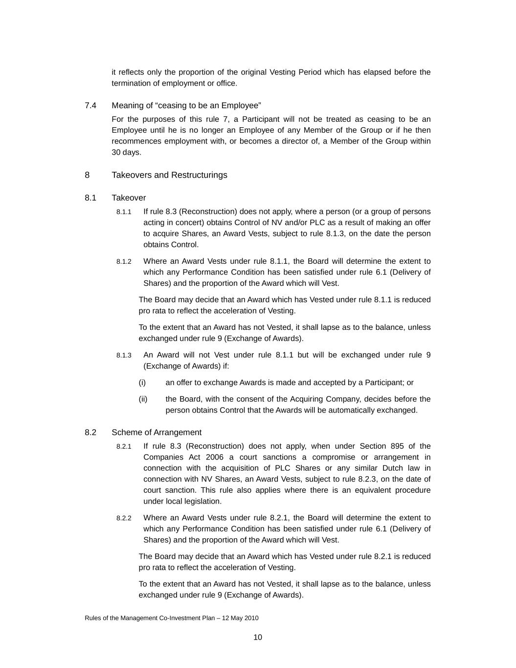 Rules of the Management Co-Investment Plan – 12 May 2010 10 it reflects only the proportion of the original Vesting Period which has elapsed before the termination of employment or office. 7.4 Meaning of “ceasing to be an Employee” For the purposes of this rule 7, a Participant will not be treated as ceasing to be an Employee until he is no longer an Employee of any Member of the Group or if he then recommences employment with, or becomes a director of, a Member of the Group within 30 days. 8 Takeovers and Restructurings 8.1 Takeover 8.1.1 If rule 8.3 (Reconstruction) does not apply, where a person (or a group of persons acting in concert) obtains Control of NV and/or PLC as a result of making an offer to acquire Shares, an Award Vests, subject to rule 8.1.3, on the date the person obtains Control. 8.1.2 Where an Award Vests under rule 8.1.1, the Board will determine the extent to which any Performance Condition has been satisfied under rule 6.1 (Delivery of Shares) and the proportion of the Award which will Vest. The Board may decide that an Award which has Vested under rule 8.1.1 is reduced pro rata to reflect the acceleration of Vesting. To the extent that an Award has not Vested, it shall lapse as to the balance, unless exchanged under rule 9 (Exchange of Awards). 8.1.3 An Award will not Vest under rule 8.1.1 but will be exchanged under rule 9 (Exchange of Awards) if: (i) an offer to exchange Awards is made and accepted by a Participant; or (ii) the Board, with the consent of the Acquiring Company, decides before the person obtains Control that the Awards will be automatically exchanged. 8.2 Scheme of Arrangement 8.2.1 If rule 8.3 (Reconstruction) does not apply, when under Section 895 of the Companies Act 2006 a court sanctions a compromise or arrangement in connection with the acquisition of PLC Shares or any similar Dutch law in connection with NV Shares, an Award Vests, subject to rule 8.2.3, on the date of court sanction. This rule also applies where there is an equivalent procedure under local legislation. 8.2.2 Where an Award Vests under rule 8.2.1, the Board will determine the extent to which any Performance Condition has been satisfied under rule 6.1 (Delivery of Shares) and the proportion of the Award which will Vest. The Board may decide that an Award which has Vested under rule 8.2.1 is reduced pro rata to reflect the acceleration of Vesting. To the extent that an Award has not Vested, it shall lapse as to the balance, unless exchanged under rule 9 (Exchange of Awards).