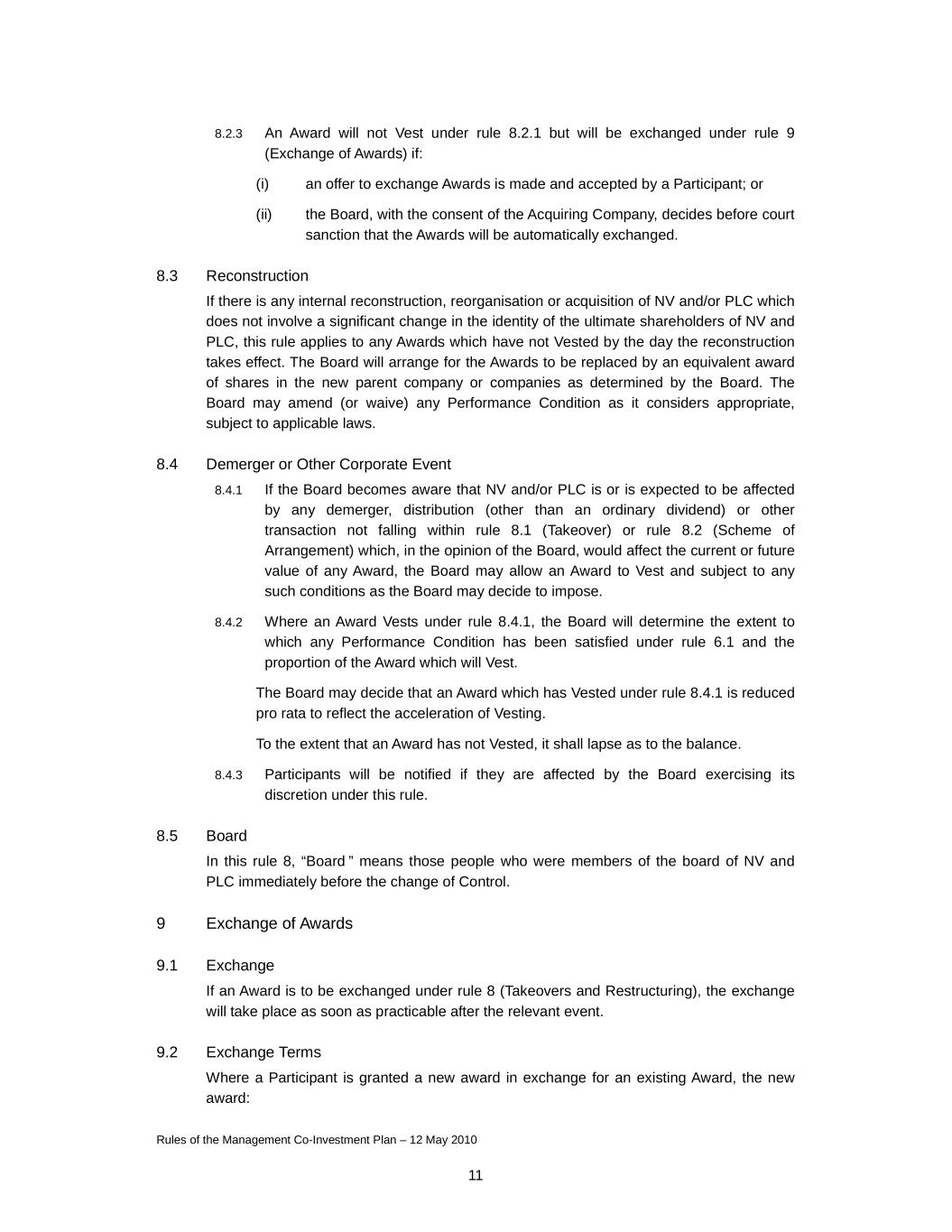 Rules of the Management Co-Investment Plan – 12 May 2010 11 8.2.3 An Award will not Vest under rule 8.2.1 but will be exchanged under rule 9 (Exchange of Awards) if: (i) an offer to exchange Awards is made and accepted by a Participant; or (ii) the Board, with the consent of the Acquiring Company, decides before court sanction that the Awards will be automatically exchanged. 8.3 Reconstruction If there is any internal reconstruction, reorganisation or acquisition of NV and/or PLC which does not involve a significant change in the identity of the ultimate shareholders of NV and PLC, this rule applies to any Awards which have not Vested by the day the reconstruction takes effect. The Board will arrange for the Awards to be replaced by an equivalent award of shares in the new parent company or companies as determined by the Board. The Board may amend (or waive) any Performance Condition as it considers appropriate, subject to applicable laws. 8.4 Demerger or Other Corporate Event 8.4.1 If the Board becomes aware that NV and/or PLC is or is expected to be affected by any demerger, distribution (other than an ordinary dividend) or other transaction not falling within rule 8.1 (Takeover) or rule 8.2 (Scheme of Arrangement) which, in the opinion of the Board, would affect the current or future value of any Award, the Board may allow an Award to Vest and subject to any such conditions as the Board may decide to impose. 8.4.2 Where an Award Vests under rule 8.4.1, the Board will determine the extent to which any Performance Condition has been satisfied under rule 6.1 and the proportion of the Award which will Vest. The Board may decide that an Award which has Vested under rule 8.4.1 is reduced pro rata to reflect the acceleration of Vesting. To the extent that an Award has not Vested, it shall lapse as to the balance. 8.4.3 Participants will be notified if they are affected by the Board exercising its discretion under this rule. 8.5 Board In this rule 8, “Board ” means those people who were members of the board of NV and PLC immediately before the change of Control. 9 Exchange of Awards 9.1 Exchange If an Award is to be exchanged under rule 8 (Takeovers and Restructuring), the exchange will take place as soon as practicable after the relevant event. 9.2 Exchange Terms Where a Participant is granted a new award in exchange for an existing Award, the new award: