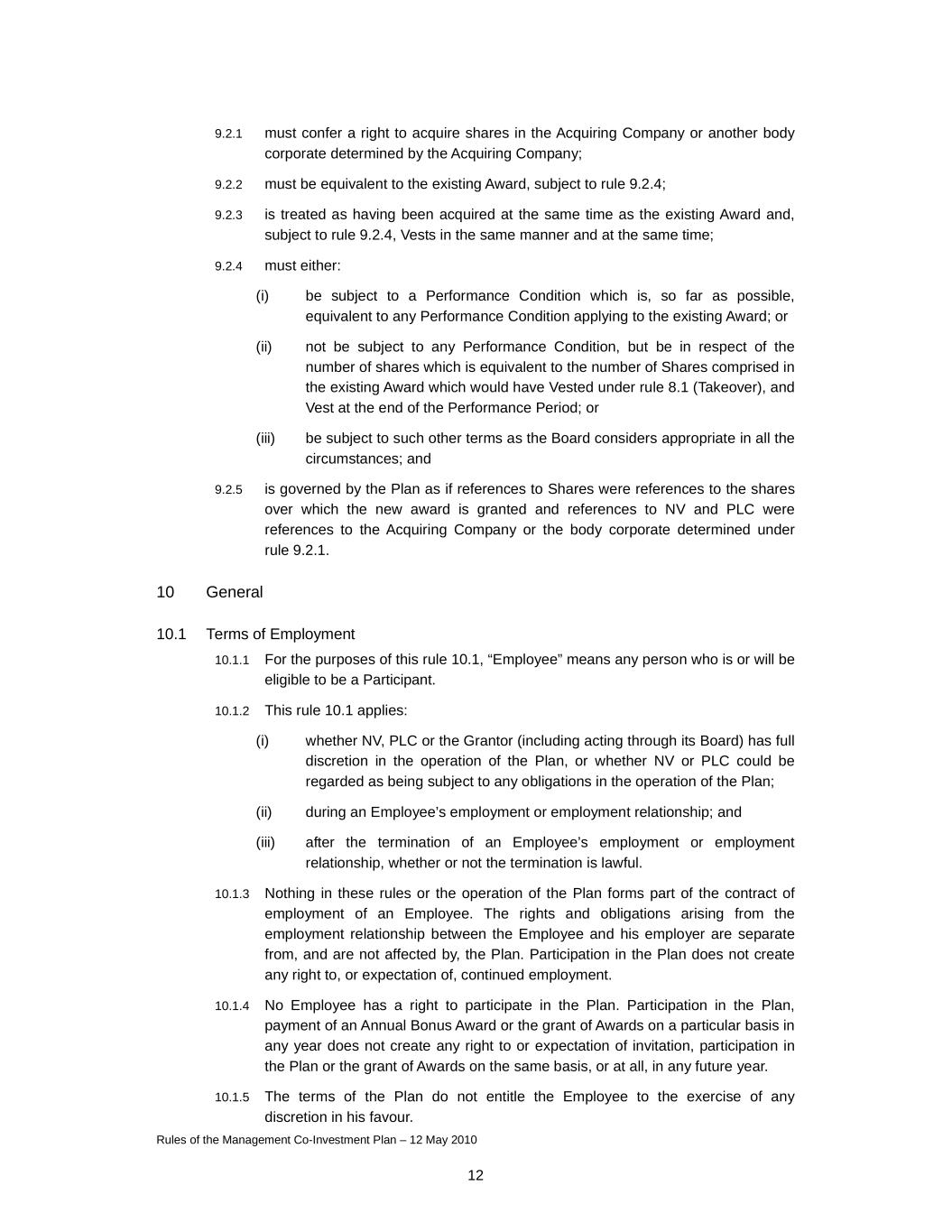 Rules of the Management Co-Investment Plan – 12 May 2010 12 9.2.1 must confer a right to acquire shares in the Acquiring Company or another body corporate determined by the Acquiring Company; 9.2.2 must be equivalent to the existing Award, subject to rule 9.2.4; 9.2.3 is treated as having been acquired at the same time as the existing Award and, subject to rule 9.2.4, Vests in the same manner and at the same time; 9.2.4 must either: (i) be subject to a Performance Condition which is, so far as possible, equivalent to any Performance Condition applying to the existing Award; or (ii) not be subject to any Performance Condition, but be in respect of the number of shares which is equivalent to the number of Shares comprised in the existing Award which would have Vested under rule 8.1 (Takeover), and Vest at the end of the Performance Period; or (iii) be subject to such other terms as the Board considers appropriate in all the circumstances; and 9.2.5 is governed by the Plan as if references to Shares were references to the shares over which the new award is granted and references to NV and PLC were references to the Acquiring Company or the body corporate determined under rule 9.2.1. 10 General 10.1 Terms of Employment 10.1.1 For the purposes of this rule 10.1, “Employee” means any person who is or will be eligible to be a Participant. 10.1.2 This rule 10.1 applies: (i) whether NV, PLC or the Grantor (including acting through its Board) has full discretion in the operation of the Plan, or whether NV or PLC could be regarded as being subject to any obligations in the operation of the Plan; (ii) during an Employee’s employment or employment relationship; and (iii) after the termination of an Employee’s employment or employment relationship, whether or not the termination is lawful. 10.1.3 Nothing in these rules or the operation of the Plan forms part of the contract of employment of an Employee. The rights and obligations arising from the employment relationship between the Employee and his employer are separate from, and are not affected by, the Plan. Participation in the Plan does not create any right to, or expectation of, continued employment. 10.1.4 No Employee has a right to participate in the Plan. Participation in the Plan, payment of an Annual Bonus Award or the grant of Awards on a particular basis in any year does not create any right to or expectation of invitation, participation in the Plan or the grant of Awards on the same basis, or at all, in any future year. 10.1.5 The terms of the Plan do not entitle the Employee to the exercise of any discretion in his favour.