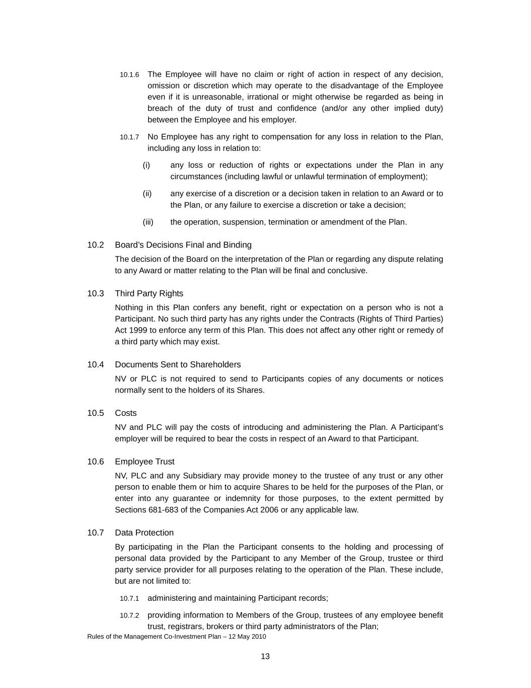 Rules of the Management Co-Investment Plan – 12 May 2010 13 10.1.6 The Employee will have no claim or right of action in respect of any decision, omission or discretion which may operate to the disadvantage of the Employee even if it is unreasonable, irrational or might otherwise be regarded as being in breach of the duty of trust and confidence (and/or any other implied duty) between the Employee and his employer. 10.1.7 No Employee has any right to compensation for any loss in relation to the Plan, including any loss in relation to: (i) any loss or reduction of rights or expectations under the Plan in any circumstances (including lawful or unlawful termination of employment); (ii) any exercise of a discretion or a decision taken in relation to an Award or to the Plan, or any failure to exercise a discretion or take a decision; (iii) the operation, suspension, termination or amendment of the Plan. 10.2 Board’s Decisions Final and Binding The decision of the Board on the interpretation of the Plan or regarding any dispute relating to any Award or matter relating to the Plan will be final and conclusive. 10.3 Third Party Rights Nothing in this Plan confers any benefit, right or expectation on a person who is not a Participant. No such third party has any rights under the Contracts (Rights of Third Parties) Act 1999 to enforce any term of this Plan. This does not affect any other right or remedy of a third party which may exist. 10.4 Documents Sent to Shareholders NV or PLC is not required to send to Participants copies of any documents or notices normally sent to the holders of its Shares. 10.5 Costs NV and PLC will pay the costs of introducing and administering the Plan. A Participant’s employer will be required to bear the costs in respect of an Award to that Participant. 10.6 Employee Trust NV, PLC and any Subsidiary may provide money to the trustee of any trust or any other person to enable them or him to acquire Shares to be held for the purposes of the Plan, or enter into any guarantee or indemnity for those purposes, to the extent permitted by Sections 681-683 of the Companies Act 2006 or any applicable law. 10.7 Data Protection By participating in the Plan the Participant consents to the holding and processing of personal data provided by the Participant to any Member of the Group, trustee or third party service provider for all purposes relating to the operation of the Plan. These include, but are not limited to: 10.7.1 administering and maintaining Participant records; 10.7.2 providing information to Members of the Group, trustees of any employee benefit trust, registrars, brokers or third party administrators of the Plan;