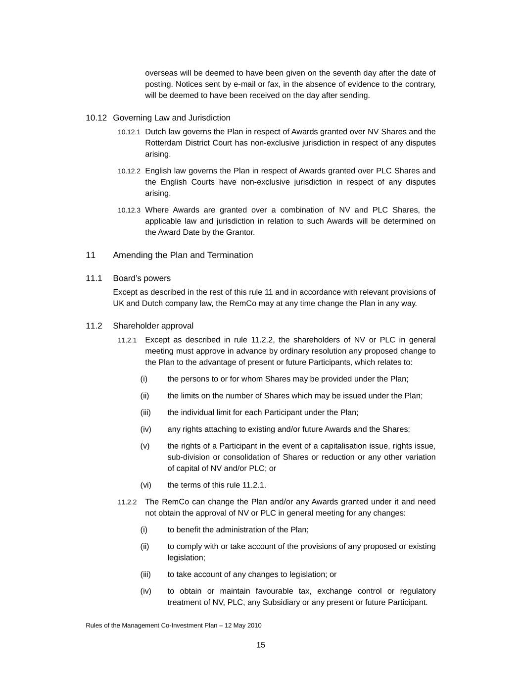 Rules of the Management Co-Investment Plan – 12 May 2010 15 overseas will be deemed to have been given on the seventh day after the date of posting. Notices sent by e-mail or fax, in the absence of evidence to the contrary, will be deemed to have been received on the day after sending. 10.12 Governing Law and Jurisdiction 10.12.1 Dutch law governs the Plan in respect of Awards granted over NV Shares and the Rotterdam District Court has non-exclusive jurisdiction in respect of any disputes arising. 10.12.2 English law governs the Plan in respect of Awards granted over PLC Shares and the English Courts have non-exclusive jurisdiction in respect of any disputes arising. 10.12.3 Where Awards are granted over a combination of NV and PLC Shares, the applicable law and jurisdiction in relation to such Awards will be determined on the Award Date by the Grantor. 11 Amending the Plan and Termination 11.1 Board’s powers Except as described in the rest of this rule 11 and in accordance with relevant provisions of UK and Dutch company law, the RemCo may at any time change the Plan in any way. 11.2 Shareholder approval 11.2.1 Except as described in rule 11.2.2, the shareholders of NV or PLC in general meeting must approve in advance by ordinary resolution any proposed change to the Plan to the advantage of present or future Participants, which relates to: (i) the persons to or for whom Shares may be provided under the Plan; (ii) the limits on the number of Shares which may be issued under the Plan; (iii) the individual limit for each Participant under the Plan; (iv) any rights attaching to existing and/or future Awards and the Shares; (v) the rights of a Participant in the event of a capitalisation issue, rights issue, sub-division or consolidation of Shares or reduction or any other variation of capital of NV and/or PLC; or (vi) the terms of this rule 11.2.1. 11.2.2 The RemCo can change the Plan and/or any Awards granted under it and need not obtain the approval of NV or PLC in general meeting for any changes: (i) to benefit the administration of the Plan; (ii) to comply with or take account of the provisions of any proposed or existing legislation; (iii) to take account of any changes to legislation; or (iv) to obtain or maintain favourable tax, exchange control or regulatory treatment of NV, PLC, any Subsidiary or any present or future Participant.