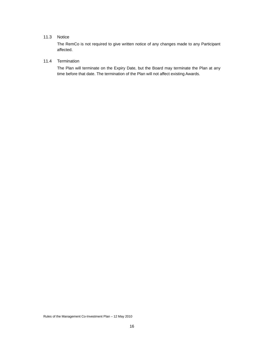 Rules of the Management Co-Investment Plan – 12 May 2010 16 11.3 Notice The RemCo is not required to give written notice of any changes made to any Participant affected. 11.4 Termination The Plan will terminate on the Expiry Date, but the Board may terminate the Plan at any time before that date. The termination of the Plan will not affect existing Awards.