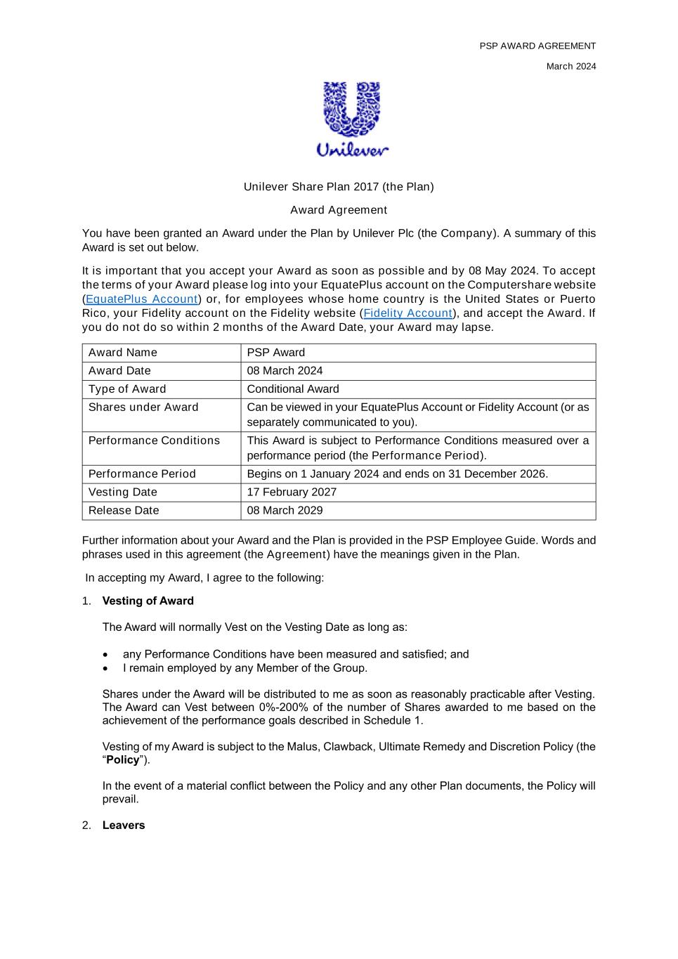 PSP AWARD AGREEMENT March 2024 Unilever Share Plan 2017 (the Plan) Award Agreement You have been granted an Award under the Plan by Unilever Plc (the Company). A summary of this Award is set out below. It is important that you accept your Award as soon as possible and by 08 May 2024. To accept the terms of your Award please log into your EquatePlus account on the Computershare website (EquatePlus Account) or, for employees whose home country is the United States or Puerto Rico, your Fidelity account on the Fidelity website (Fidelity Account), and accept the Award. If you do not do so within 2 months of the Award Date, your Award may lapse. Award Name PSP Award Award Date 08 March 2024 Type of Award Conditional Award Shares under Award Can be viewed in your EquatePlus Account or Fidelity Account (or as separately communicated to you). Performance Conditions This Award is subject to Performance Conditions measured over a performance period (the Performance Period). Performance Period Begins on 1 January 2024 and ends on 31 December 2026. Vesting Date 17 February 2027 Release Date 08 March 2029 Further information about your Award and the Plan is provided in the PSP Employee Guide. Words and phrases used in this agreement (the Agreement) have the meanings given in the Plan. In accepting my Award, I agree to the following: 1. Vesting of Award The Award will normally Vest on the Vesting Date as long as: • any Performance Conditions have been measured and satisfied; and • I remain employed by any Member of the Group. Shares under the Award will be distributed to me as soon as reasonably practicable after Vesting. The Award can Vest between 0%-200% of the number of Shares awarded to me based on the achievement of the performance goals described in Schedule 1. Vesting of my Award is subject to the Malus, Clawback, Ultimate Remedy and Discretion Policy (the “Policy”). In the event of a material conflict between the Policy and any other Plan documents, the Policy will prevail. 2. Leavers