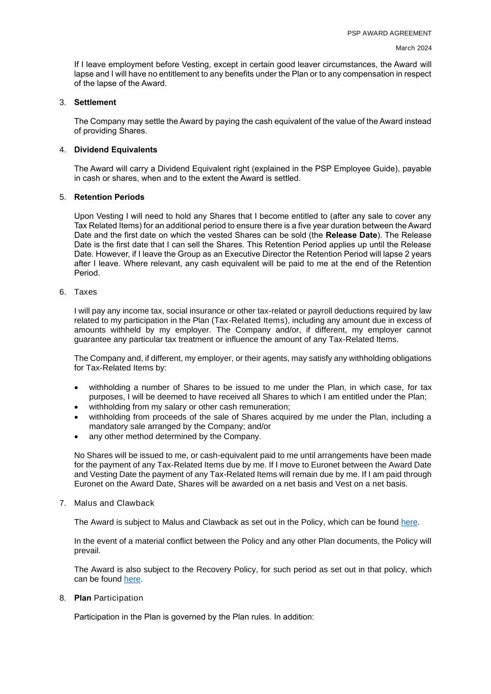 PSP AWARD AGREEMENT March 2024 If I leave employment before Vesting, except in certain good leaver circumstances, the Award will lapse and I will have no entitlement to any benefits under the Plan or to any compensation in respect of the lapse of the Award. 3. Settlement The Company may settle the Award by paying the cash equivalent of the value of the Award instead of providing Shares. 4. Dividend Equivalents The Award will carry a Dividend Equivalent right (explained in the PSP Employee Guide), payable in cash or shares, when and to the extent the Award is settled. 5. Retention Periods Upon Vesting I will need to hold any Shares that I become entitled to (after any sale to cover any Tax Related Items) for an additional period to ensure there is a five year duration between the Award Date and the first date on which the vested Shares can be sold (the Release Date). The Release Date is the first date that I can sell the Shares. This Retention Period applies up until the Release Date. However, if I leave the Group as an Executive Director the Retention Period will lapse 2 years after I leave. Where relevant, any cash equivalent will be paid to me at the end of the Retention Period. 6. Taxes I will pay any income tax, social insurance or other tax-related or payroll deductions required by law related to my participation in the Plan (Tax-Related Items), including any amount due in excess of amounts withheld by my employer. The Company and/or, if different, my employer cannot guarantee any particular tax treatment or influence the amount of any Tax-Related Items. The Company and, if different, my employer, or their agents, may satisfy any withholding obligations for Tax-Related Items by: • withholding a number of Shares to be issued to me under the Plan, in which case, for tax purposes, I will be deemed to have received all Shares to which I am entitled under the Plan; • withholding from my salary or other cash remuneration; • withholding from proceeds of the sale of Shares acquired by me under the Plan, including a mandatory sale arranged by the Company; and/or • any other method determined by the Company. No Shares will be issued to me, or cash-equivalent paid to me until arrangements have been made for the payment of any Tax-Related Items due by me. If I move to Euronet between the Award Date and Vesting Date the payment of any Tax-Related Items will remain due by me. If I am paid through Euronet on the Award Date, Shares will be awarded on a net basis and Vest on a net basis. 7. Malus and Clawback The Award is subject to Malus and Clawback as set out in the Policy, which can be found here. In the event of a material conflict between the Policy and any other Plan documents, the Policy will prevail. The Award is also subject to the Recovery Policy, for such period as set out in that policy, which can be found here. 8. Plan Participation Participation in the Plan is governed by the Plan rules. In addition: