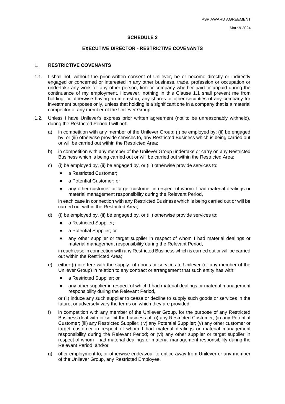 PSP AWARD AGREEMENT March 2024 SCHEDULE 2 EXECUTIVE DIRECTOR - RESTRICTIVE COVENANTS 1. RESTRICTIVE COVENANTS 1.1. I shall not, without the prior written consent of Unilever, be or become directly or indirectly engaged or concerned or interested in any other business, trade, profession or occupation or undertake any work for any other person, firm or company whether paid or unpaid during the continuance of my employment. However, nothing in this Clause 1.1 shall prevent me from holding, or otherwise having an interest in, any shares or other securities of any company for investment purposes only, unless that holding is a significant one in a company that is a material competitor of any member of the Unilever Group. 1.2. Unless I have Unilever's express prior written agreement (not to be unreasonably withheld), during the Restricted Period I will not: a) in competition with any member of the Unilever Group: (i) be employed by; (ii) be engaged by; or (iii) otherwise provide services to, any Restricted Business which is being carried out or will be carried out within the Restricted Area; b) in competition with any member of the Unilever Group undertake or carry on any Restricted Business which is being carried out or will be carried out within the Restricted Area; c) (i) be employed by, (ii) be engaged by, or (iii) otherwise provide services to: • a Restricted Customer; • a Potential Customer; or • any other customer or target customer in respect of whom I had material dealings or material management responsibility during the Relevant Period, in each case in connection with any Restricted Business which is being carried out or will be carried out within the Restricted Area; d) (i) be employed by, (ii) be engaged by, or (iii) otherwise provide services to: • a Restricted Supplier; • a Potential Supplier; or • any other supplier or target supplier in respect of whom I had material dealings or material management responsibility during the Relevant Period, in each case in connection with any Restricted Business which is carried out or will be carried out within the Restricted Area; e) either (i) interfere with the supply of goods or services to Unilever (or any member of the Unilever Group) in relation to any contract or arrangement that such entity has with: • a Restricted Supplier; or • any other supplier in respect of which I had material dealings or material management responsibility during the Relevant Period, or (ii) induce any such supplier to cease or decline to supply such goods or services in the future, or adversely vary the terms on which they are provided; f) in competition with any member of the Unilever Group, for the purpose of any Restricted Business deal with or solicit the business of: (i) any Restricted Customer; (ii) any Potential Customer; (iii) any Restricted Supplier; (iv) any Potential Supplier; (v) any other customer or target customer in respect of whom I had material dealings or material management responsibility during the Relevant Period; or (vi) any other supplier or target supplier in respect of whom I had material dealings or material management responsibility during the Relevant Period; and/or g) offer employment to, or otherwise endeavour to entice away from Unilever or any member of the Unilever Group, any Restricted Employee.