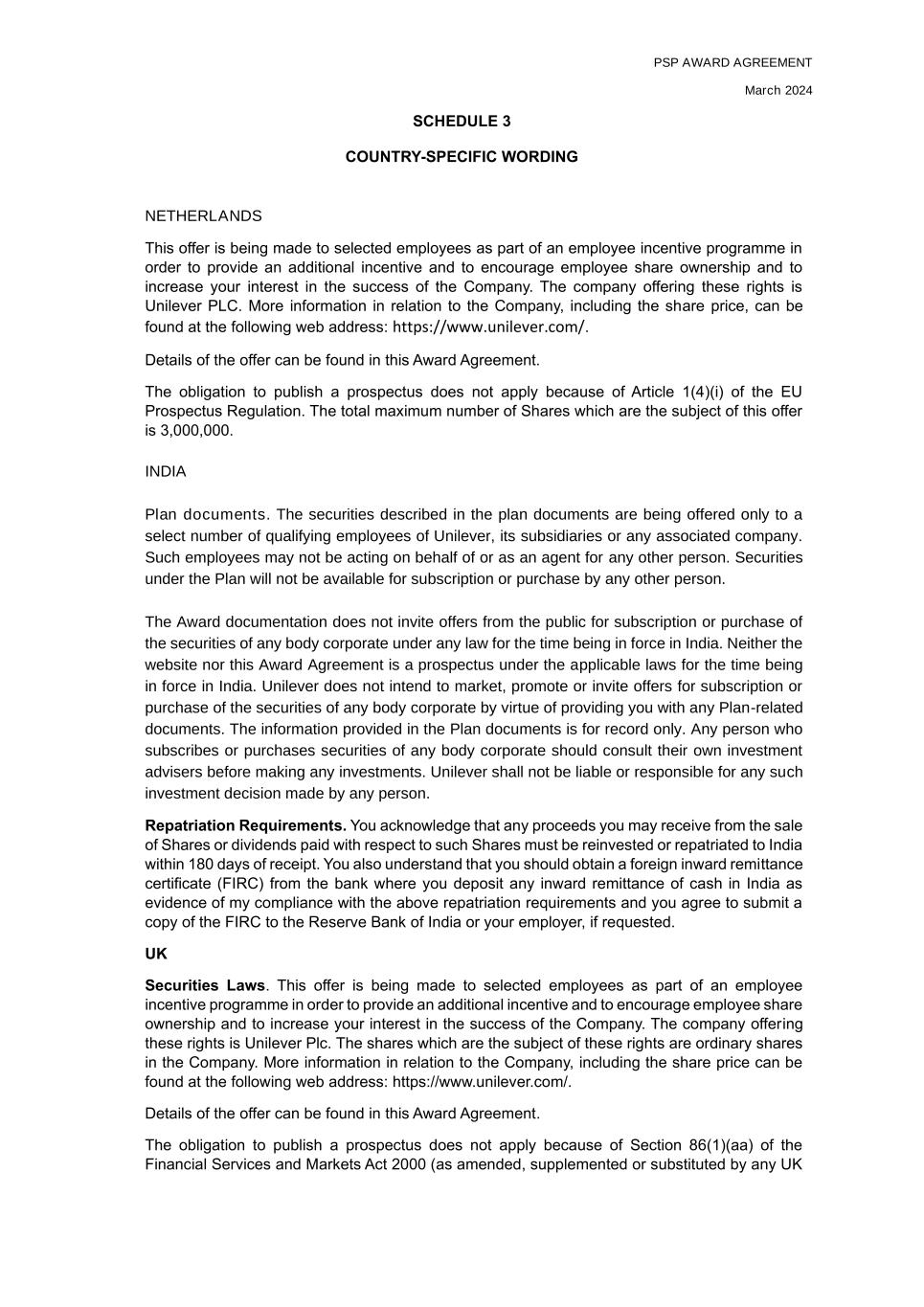PSP AWARD AGREEMENT March 2024 SCHEDULE 3 COUNTRY-SPECIFIC WORDING NETHERLANDS This offer is being made to selected employees as part of an employee incentive programme in order to provide an additional incentive and to encourage employee share ownership and to increase your interest in the success of the Company. The company offering these rights is Unilever PLC. More information in relation to the Company, including the share price, can be found at the following web address: https://www.unilever.com/. Details of the offer can be found in this Award Agreement. The obligation to publish a prospectus does not apply because of Article 1(4)(i) of the EU Prospectus Regulation. The total maximum number of Shares which are the subject of this offer is 3,000,000. INDIA Plan documents. The securities described in the plan documents are being offered only to a select number of qualifying employees of Unilever, its subsidiaries or any associated company. Such employees may not be acting on behalf of or as an agent for any other person. Securities under the Plan will not be available for subscription or purchase by any other person. The Award documentation does not invite offers from the public for subscription or purchase of the securities of any body corporate under any law for the time being in force in India. Neither the website nor this Award Agreement is a prospectus under the applicable laws for the time being in force in India. Unilever does not intend to market, promote or invite offers for subscription or purchase of the securities of any body corporate by virtue of providing you with any Plan-related documents. The information provided in the Plan documents is for record only. Any person who subscribes or purchases securities of any body corporate should consult their own investment advisers before making any investments. Unilever shall not be liable or responsible for any such investment decision made by any person. Repatriation Requirements. You acknowledge that any proceeds you may receive from the sale of Shares or dividends paid with respect to such Shares must be reinvested or repatriated to India within 180 days of receipt. You also understand that you should obtain a foreign inward remittance certificate (FIRC) from the bank where you deposit any inward remittance of cash in India as evidence of my compliance with the above repatriation requirements and you agree to submit a copy of the FIRC to the Reserve Bank of India or your employer, if requested. UK Securities Laws. This offer is being made to selected employees as part of an employee incentive programme in order to provide an additional incentive and to encourage employee share ownership and to increase your interest in the success of the Company. The company offering these rights is Unilever Plc. The shares which are the subject of these rights are ordinary shares in the Company. More information in relation to the Company, including the share price can be found at the following web address: https://www.unilever.com/. Details of the offer can be found in this Award Agreement. The obligation to publish a prospectus does not apply because of Section 86(1)(aa) of the Financial Services and Markets Act 2000 (as amended, supplemented or substituted by any UK