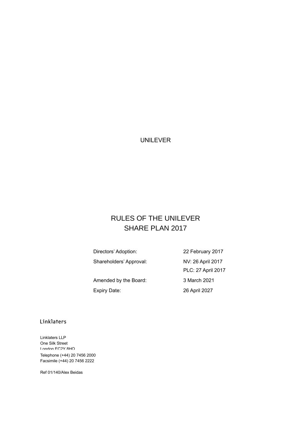 UNILEVER RULES OF THE UNILEVER SHARE PLAN 2017 Directors’ Adoption: 22 February 2017 Shareholders’ Approval: NV: 26 April 2017 PLC: 27 April 2017 Amended by the Board: 3 March 2021 Expiry Date: 26 April 2027 Linklaters LLP One Silk Street London EC2Y 8HQ Telephone (+44) 20 7456 2000 Facsimile (+44) 20 7456 2222 Ref 01/140/Alex Beidas