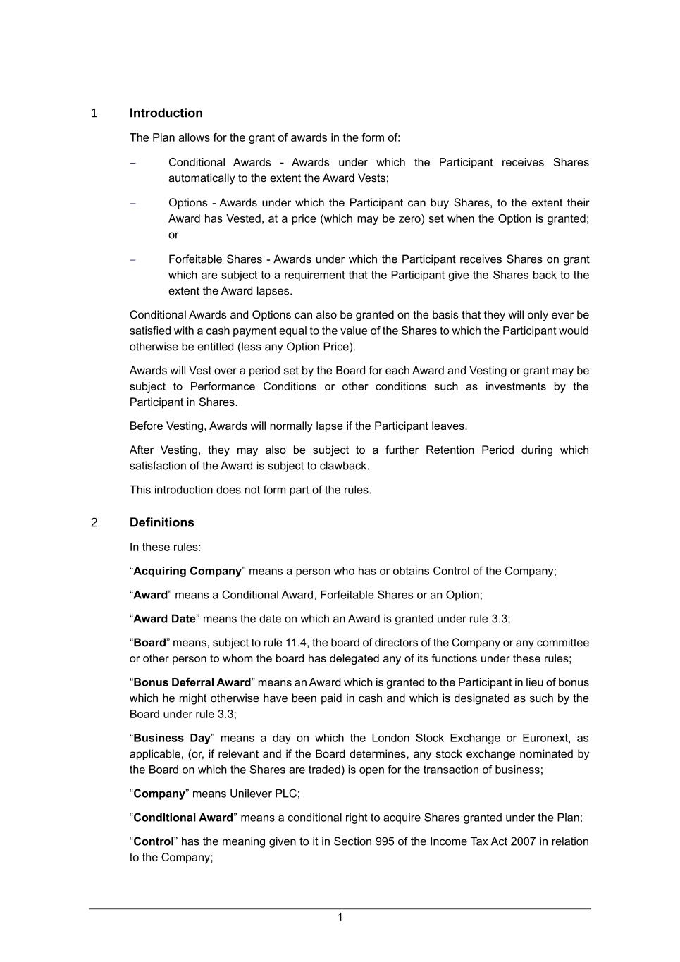 1 1 Introduction The Plan allows for the grant of awards in the form of: − Conditional Awards - Awards under which the Participant receives Shares automatically to the extent the Award Vests; − Options - Awards under which the Participant can buy Shares, to the extent their Award has Vested, at a price (which may be zero) set when the Option is granted; or − Forfeitable Shares - Awards under which the Participant receives Shares on grant which are subject to a requirement that the Participant give the Shares back to the extent the Award lapses. Conditional Awards and Options can also be granted on the basis that they will only ever be satisfied with a cash payment equal to the value of the Shares to which the Participant would otherwise be entitled (less any Option Price). Awards will Vest over a period set by the Board for each Award and Vesting or grant may be subject to Performance Conditions or other conditions such as investments by the Participant in Shares. Before Vesting, Awards will normally lapse if the Participant leaves. After Vesting, they may also be subject to a further Retention Period during which satisfaction of the Award is subject to clawback. This introduction does not form part of the rules. 2 Definitions In these rules: “Acquiring Company” means a person who has or obtains Control of the Company; “Award” means a Conditional Award, Forfeitable Shares or an Option; “Award Date” means the date on which an Award is granted under rule 3.3; “Board” means, subject to rule 11.4, the board of directors of the Company or any committee or other person to whom the board has delegated any of its functions under these rules; “Bonus Deferral Award” means an Award which is granted to the Participant in lieu of bonus which he might otherwise have been paid in cash and which is designated as such by the Board under rule 3.3; “Business Day” means a day on which the London Stock Exchange or Euronext, as applicable, (or, if relevant and if the Board determines, any stock exchange nominated by the Board on which the Shares are traded) is open for the transaction of business; “Company” means Unilever PLC; “Conditional Award” means a conditional right to acquire Shares granted under the Plan; “Control” has the meaning given to it in Section 995 of the Income Tax Act 2007 in relation to the Company;