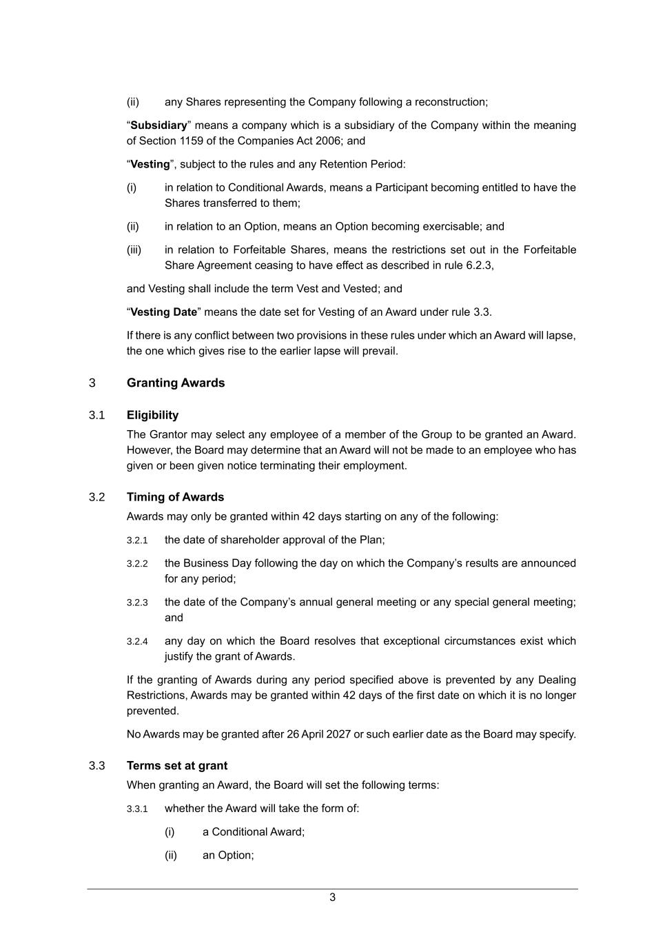 3 (ii) any Shares representing the Company following a reconstruction; “Subsidiary” means a company which is a subsidiary of the Company within the meaning of Section 1159 of the Companies Act 2006; and “Vesting”, subject to the rules and any Retention Period: (i) in relation to Conditional Awards, means a Participant becoming entitled to have the Shares transferred to them; (ii) in relation to an Option, means an Option becoming exercisable; and (iii) in relation to Forfeitable Shares, means the restrictions set out in the Forfeitable Share Agreement ceasing to have effect as described in rule 6.2.3, and Vesting shall include the term Vest and Vested; and “Vesting Date” means the date set for Vesting of an Award under rule 3.3. If there is any conflict between two provisions in these rules under which an Award will lapse, the one which gives rise to the earlier lapse will prevail. 3 Granting Awards 3.1 Eligibility The Grantor may select any employee of a member of the Group to be granted an Award. However, the Board may determine that an Award will not be made to an employee who has given or been given notice terminating their employment. 3.2 Timing of Awards Awards may only be granted within 42 days starting on any of the following: 3.2.1 the date of shareholder approval of the Plan; 3.2.2 the Business Day following the day on which the Company’s results are announced for any period; 3.2.3 the date of the Company’s annual general meeting or any special general meeting; and 3.2.4 any day on which the Board resolves that exceptional circumstances exist which justify the grant of Awards. If the granting of Awards during any period specified above is prevented by any Dealing Restrictions, Awards may be granted within 42 days of the first date on which it is no longer prevented. No Awards may be granted after 26 April 2027 or such earlier date as the Board may specify. 3.3 Terms set at grant When granting an Award, the Board will set the following terms: 3.3.1 whether the Award will take the form of: (i) a Conditional Award; (ii) an Option;