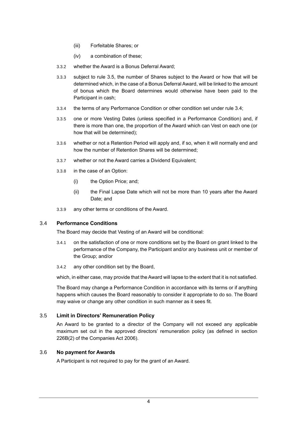 4 (iii) Forfeitable Shares; or (iv) a combination of these; 3.3.2 whether the Award is a Bonus Deferral Award; 3.3.3 subject to rule 3.5, the number of Shares subject to the Award or how that will be determined which, in the case of a Bonus Deferral Award, will be linked to the amount of bonus which the Board determines would otherwise have been paid to the Participant in cash; 3.3.4 the terms of any Performance Condition or other condition set under rule 3.4; 3.3.5 one or more Vesting Dates (unless specified in a Performance Condition) and, if there is more than one, the proportion of the Award which can Vest on each one (or how that will be determined); 3.3.6 whether or not a Retention Period will apply and, if so, when it will normally end and how the number of Retention Shares will be determined; 3.3.7 whether or not the Award carries a Dividend Equivalent; 3.3.8 in the case of an Option: (i) the Option Price; and; (ii) the Final Lapse Date which will not be more than 10 years after the Award Date; and 3.3.9 any other terms or conditions of the Award. 3.4 Performance Conditions The Board may decide that Vesting of an Award will be conditional: 3.4.1 on the satisfaction of one or more conditions set by the Board on grant linked to the performance of the Company, the Participant and/or any business unit or member of the Group; and/or 3.4.2 any other condition set by the Board, which, in either case, may provide that the Award will lapse to the extent that it is not satisfied. The Board may change a Performance Condition in accordance with its terms or if anything happens which causes the Board reasonably to consider it appropriate to do so. The Board may waive or change any other condition in such manner as it sees fit. 3.5 Limit in Directors’ Remuneration Policy An Award to be granted to a director of the Company will not exceed any applicable maximum set out in the approved directors’ remuneration policy (as defined in section 226B(2) of the Companies Act 2006). 3.6 No payment for Awards A Participant is not required to pay for the grant of an Award.