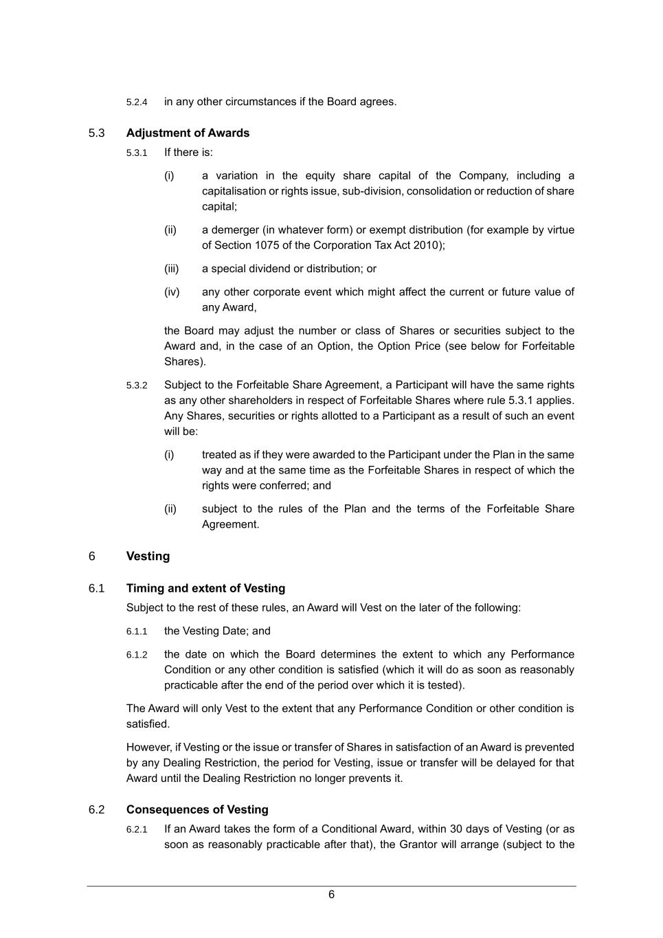 6 5.2.4 in any other circumstances if the Board agrees. 5.3 Adjustment of Awards 5.3.1 If there is: (i) a variation in the equity share capital of the Company, including a capitalisation or rights issue, sub-division, consolidation or reduction of share capital; (ii) a demerger (in whatever form) or exempt distribution (for example by virtue of Section 1075 of the Corporation Tax Act 2010); (iii) a special dividend or distribution; or (iv) any other corporate event which might affect the current or future value of any Award, the Board may adjust the number or class of Shares or securities subject to the Award and, in the case of an Option, the Option Price (see below for Forfeitable Shares). 5.3.2 Subject to the Forfeitable Share Agreement, a Participant will have the same rights as any other shareholders in respect of Forfeitable Shares where rule 5.3.1 applies. Any Shares, securities or rights allotted to a Participant as a result of such an event will be: (i) treated as if they were awarded to the Participant under the Plan in the same way and at the same time as the Forfeitable Shares in respect of which the rights were conferred; and (ii) subject to the rules of the Plan and the terms of the Forfeitable Share Agreement. 6 Vesting 6.1 Timing and extent of Vesting Subject to the rest of these rules, an Award will Vest on the later of the following: 6.1.1 the Vesting Date; and 6.1.2 the date on which the Board determines the extent to which any Performance Condition or any other condition is satisfied (which it will do as soon as reasonably practicable after the end of the period over which it is tested). The Award will only Vest to the extent that any Performance Condition or other condition is satisfied. However, if Vesting or the issue or transfer of Shares in satisfaction of an Award is prevented by any Dealing Restriction, the period for Vesting, issue or transfer will be delayed for that Award until the Dealing Restriction no longer prevents it. 6.2 Consequences of Vesting 6.2.1 If an Award takes the form of a Conditional Award, within 30 days of Vesting (or as soon as reasonably practicable after that), the Grantor will arrange (subject to the
