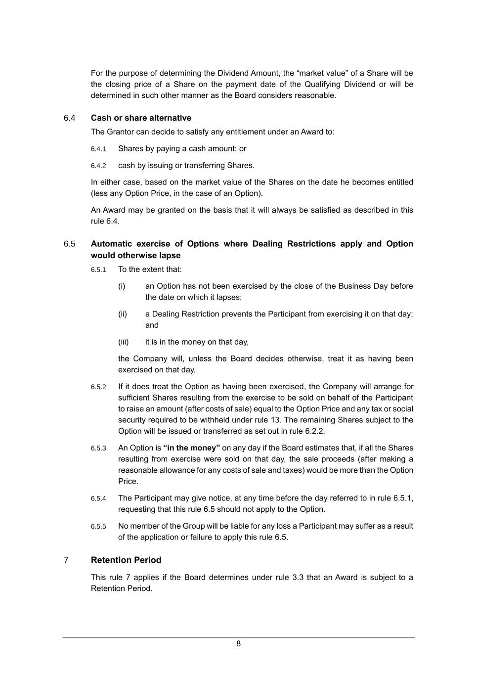 8 For the purpose of determining the Dividend Amount, the “market value” of a Share will be the closing price of a Share on the payment date of the Qualifying Dividend or will be determined in such other manner as the Board considers reasonable. 6.4 Cash or share alternative The Grantor can decide to satisfy any entitlement under an Award to: 6.4.1 Shares by paying a cash amount; or 6.4.2 cash by issuing or transferring Shares. In either case, based on the market value of the Shares on the date he becomes entitled (less any Option Price, in the case of an Option). An Award may be granted on the basis that it will always be satisfied as described in this rule 6.4. 6.5 Automatic exercise of Options where Dealing Restrictions apply and Option would otherwise lapse 6.5.1 To the extent that: (i) an Option has not been exercised by the close of the Business Day before the date on which it lapses; (ii) a Dealing Restriction prevents the Participant from exercising it on that day; and (iii) it is in the money on that day, the Company will, unless the Board decides otherwise, treat it as having been exercised on that day. 6.5.2 If it does treat the Option as having been exercised, the Company will arrange for sufficient Shares resulting from the exercise to be sold on behalf of the Participant to raise an amount (after costs of sale) equal to the Option Price and any tax or social security required to be withheld under rule 13. The remaining Shares subject to the Option will be issued or transferred as set out in rule 6.2.2. 6.5.3 An Option is “in the money” on any day if the Board estimates that, if all the Shares resulting from exercise were sold on that day, the sale proceeds (after making a reasonable allowance for any costs of sale and taxes) would be more than the Option Price. 6.5.4 The Participant may give notice, at any time before the day referred to in rule 6.5.1, requesting that this rule 6.5 should not apply to the Option. 6.5.5 No member of the Group will be liable for any loss a Participant may suffer as a result of the application or failure to apply this rule 6.5. 7 Retention Period This rule 7 applies if the Board determines under rule 3.3 that an Award is subject to a Retention Period.