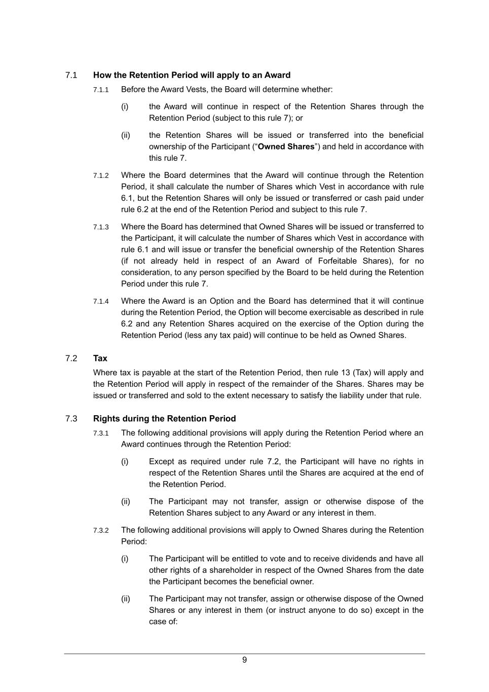 9 7.1 How the Retention Period will apply to an Award 7.1.1 Before the Award Vests, the Board will determine whether: (i) the Award will continue in respect of the Retention Shares through the Retention Period (subject to this rule 7); or (ii) the Retention Shares will be issued or transferred into the beneficial ownership of the Participant (“Owned Shares”) and held in accordance with this rule 7. 7.1.2 Where the Board determines that the Award will continue through the Retention Period, it shall calculate the number of Shares which Vest in accordance with rule 6.1, but the Retention Shares will only be issued or transferred or cash paid under rule 6.2 at the end of the Retention Period and subject to this rule 7. 7.1.3 Where the Board has determined that Owned Shares will be issued or transferred to the Participant, it will calculate the number of Shares which Vest in accordance with rule 6.1 and will issue or transfer the beneficial ownership of the Retention Shares (if not already held in respect of an Award of Forfeitable Shares), for no consideration, to any person specified by the Board to be held during the Retention Period under this rule 7. 7.1.4 Where the Award is an Option and the Board has determined that it will continue during the Retention Period, the Option will become exercisable as described in rule 6.2 and any Retention Shares acquired on the exercise of the Option during the Retention Period (less any tax paid) will continue to be held as Owned Shares. 7.2 Tax Where tax is payable at the start of the Retention Period, then rule 13 (Tax) will apply and the Retention Period will apply in respect of the remainder of the Shares. Shares may be issued or transferred and sold to the extent necessary to satisfy the liability under that rule. 7.3 Rights during the Retention Period 7.3.1 The following additional provisions will apply during the Retention Period where an Award continues through the Retention Period: (i) Except as required under rule 7.2, the Participant will have no rights in respect of the Retention Shares until the Shares are acquired at the end of the Retention Period. (ii) The Participant may not transfer, assign or otherwise dispose of the Retention Shares subject to any Award or any interest in them. 7.3.2 The following additional provisions will apply to Owned Shares during the Retention Period: (i) The Participant will be entitled to vote and to receive dividends and have all other rights of a shareholder in respect of the Owned Shares from the date the Participant becomes the beneficial owner. (ii) The Participant may not transfer, assign or otherwise dispose of the Owned Shares or any interest in them (or instruct anyone to do so) except in the case of: