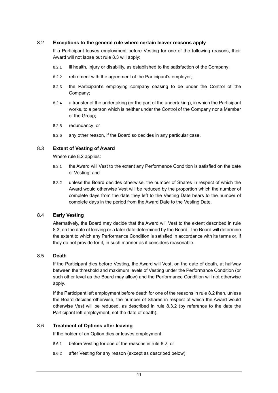 11 8.2 Exceptions to the general rule where certain leaver reasons apply If a Participant leaves employment before Vesting for one of the following reasons, their Award will not lapse but rule 8.3 will apply: 8.2.1 ill health, injury or disability, as established to the satisfaction of the Company; 8.2.2 retirement with the agreement of the Participant’s employer; 8.2.3 the Participant’s employing company ceasing to be under the Control of the Company; 8.2.4 a transfer of the undertaking (or the part of the undertaking), in which the Participant works, to a person which is neither under the Control of the Company nor a Member of the Group; 8.2.5 redundancy; or 8.2.6 any other reason, if the Board so decides in any particular case. 8.3 Extent of Vesting of Award Where rule 8.2 applies: 8.3.1 the Award will Vest to the extent any Performance Condition is satisfied on the date of Vesting; and 8.3.2 unless the Board decides otherwise, the number of Shares in respect of which the Award would otherwise Vest will be reduced by the proportion which the number of complete days from the date they left to the Vesting Date bears to the number of complete days in the period from the Award Date to the Vesting Date. 8.4 Early Vesting Alternatively, the Board may decide that the Award will Vest to the extent described in rule 8.3, on the date of leaving or a later date determined by the Board. The Board will determine the extent to which any Performance Condition is satisfied in accordance with its terms or, if they do not provide for it, in such manner as it considers reasonable. 8.5 Death If the Participant dies before Vesting, the Award will Vest, on the date of death, at halfway between the threshold and maximum levels of Vesting under the Performance Condition (or such other level as the Board may allow) and the Performance Condition will not otherwise apply. If the Participant left employment before death for one of the reasons in rule 8.2 then, unless the Board decides otherwise, the number of Shares in respect of which the Award would otherwise Vest will be reduced, as described in rule 8.3.2 (by reference to the date the Participant left employment, not the date of death). 8.6 Treatment of Options after leaving If the holder of an Option dies or leaves employment: 8.6.1 before Vesting for one of the reasons in rule 8.2; or 8.6.2 after Vesting for any reason (except as described below)