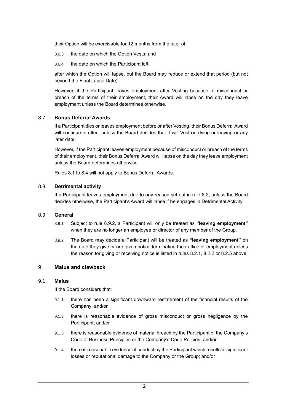 12 their Option will be exercisable for 12 months from the later of: 8.6.3 the date on which the Option Vests; and 8.6.4 the date on which the Participant left, after which the Option will lapse, but the Board may reduce or extend that period (but not beyond the Final Lapse Date). However, if the Participant leaves employment after Vesting because of misconduct or breach of the terms of their employment, their Award will lapse on the day they leave employment unless the Board determines otherwise. 8.7 Bonus Deferral Awards If a Participant dies or leaves employment before or after Vesting, their Bonus Deferral Award will continue in effect unless the Board decides that it will Vest on dying or leaving or any later date. However, if the Participant leaves employment because of misconduct or breach of the terms of their employment, their Bonus Deferral Award will lapse on the day they leave employment unless the Board determines otherwise. Rules 8.1 to 8.4 will not apply to Bonus Deferral Awards. 8.8 Detrimental activity If a Participant leaves employment due to any reason set out in rule 8.2, unless the Board decides otherwise, the Participant’s Award will lapse if he engages in Detrimental Activity. 8.9 General 8.9.1 Subject to rule 8.9.2, a Participant will only be treated as “leaving employment” when they are no longer an employee or director of any member of the Group. 8.9.2 The Board may decide a Participant will be treated as “leaving employment” on the date they give or are given notice terminating their office or employment unless the reason for giving or receiving notice is listed in rules 8.2.1, 8.2.2 or 8.2.5 above. 9 Malus and clawback 9.1 Malus If the Board considers that: 9.1.1 there has been a significant downward restatement of the financial results of the Company; and/or 9.1.2 there is reasonable evidence of gross misconduct or gross negligence by the Participant; and/or 9.1.3 there is reasonable evidence of material breach by the Participant of the Company’s Code of Business Principles or the Company’s Code Policies; and/or 9.1.4 there is reasonable evidence of conduct by the Participant which results in significant losses or reputational damage to the Company or the Group; and/or