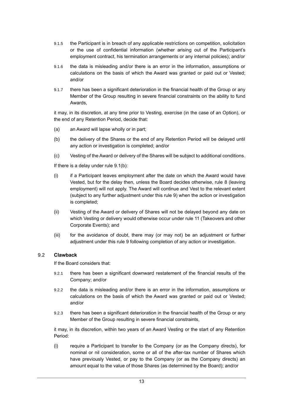13 9.1.5 the Participant is in breach of any applicable restrictions on competition, solicitation or the use of confidential information (whether arising out of the Participant’s employment contract, his termination arrangements or any internal policies); and/or 9.1.6 the data is misleading and/or there is an error in the information, assumptions or calculations on the basis of which the Award was granted or paid out or Vested; and/or 9.1.7 there has been a significant deterioration in the financial health of the Group or any Member of the Group resulting in severe financial constraints on the ability to fund Awards, it may, in its discretion, at any time prior to Vesting, exercise (in the case of an Option), or the end of any Retention Period, decide that: (a) an Award will lapse wholly or in part; (b) the delivery of the Shares or the end of any Retention Period will be delayed until any action or investigation is completed; and/or (c) Vesting of the Award or delivery of the Shares will be subject to additional conditions. If there is a delay under rule 9.1(b): (i) if a Participant leaves employment after the date on which the Award would have Vested, but for the delay then, unless the Board decides otherwise, rule 8 (leaving employment) will not apply. The Award will continue and Vest to the relevant extent (subject to any further adjustment under this rule 9) when the action or investigation is completed; (ii) Vesting of the Award or delivery of Shares will not be delayed beyond any date on which Vesting or delivery would otherwise occur under rule 11 (Takeovers and other Corporate Events); and (iii) for the avoidance of doubt, there may (or may not) be an adjustment or further adjustment under this rule 9 following completion of any action or investigation. 9.2 Clawback If the Board considers that: 9.2.1 there has been a significant downward restatement of the financial results of the Company; and/or 9.2.2 the data is misleading and/or there is an error in the information, assumptions or calculations on the basis of which the Award was granted or paid out or Vested; and/or 9.2.3 there has been a significant deterioration in the financial health of the Group or any Member of the Group resulting in severe financial constraints, it may, in its discretion, within two years of an Award Vesting or the start of any Retention Period: (i) require a Participant to transfer to the Company (or as the Company directs), for nominal or nil consideration, some or all of the after-tax number of Shares which have previously Vested, or pay to the Company (or as the Company directs) an amount equal to the value of those Shares (as determined by the Board); and/or