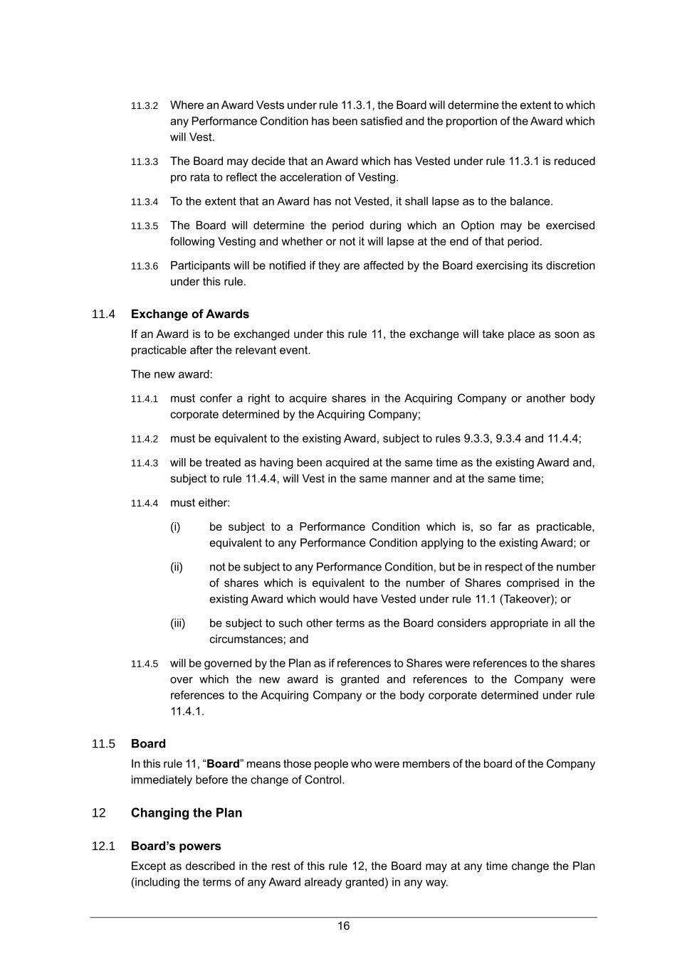 16 11.3.2 Where an Award Vests under rule 11.3.1, the Board will determine the extent to which any Performance Condition has been satisfied and the proportion of the Award which will Vest. 11.3.3 The Board may decide that an Award which has Vested under rule 11.3.1 is reduced pro rata to reflect the acceleration of Vesting. 11.3.4 To the extent that an Award has not Vested, it shall lapse as to the balance. 11.3.5 The Board will determine the period during which an Option may be exercised following Vesting and whether or not it will lapse at the end of that period. 11.3.6 Participants will be notified if they are affected by the Board exercising its discretion under this rule. 11.4 Exchange of Awards If an Award is to be exchanged under this rule 11, the exchange will take place as soon as practicable after the relevant event. The new award: 11.4.1 must confer a right to acquire shares in the Acquiring Company or another body corporate determined by the Acquiring Company; 11.4.2 must be equivalent to the existing Award, subject to rules 9.3.3, 9.3.4 and 11.4.4; 11.4.3 will be treated as having been acquired at the same time as the existing Award and, subject to rule 11.4.4, will Vest in the same manner and at the same time; 11.4.4 must either: (i) be subject to a Performance Condition which is, so far as practicable, equivalent to any Performance Condition applying to the existing Award; or (ii) not be subject to any Performance Condition, but be in respect of the number of shares which is equivalent to the number of Shares comprised in the existing Award which would have Vested under rule 11.1 (Takeover); or (iii) be subject to such other terms as the Board considers appropriate in all the circumstances; and 11.4.5 will be governed by the Plan as if references to Shares were references to the shares over which the new award is granted and references to the Company were references to the Acquiring Company or the body corporate determined under rule 11.4.1. 11.5 Board In this rule 11, “Board” means those people who were members of the board of the Company immediately before the change of Control. 12 Changing the Plan 12.1 Board’s powers Except as described in the rest of this rule 12, the Board may at any time change the Plan (including the terms of any Award already granted) in any way.