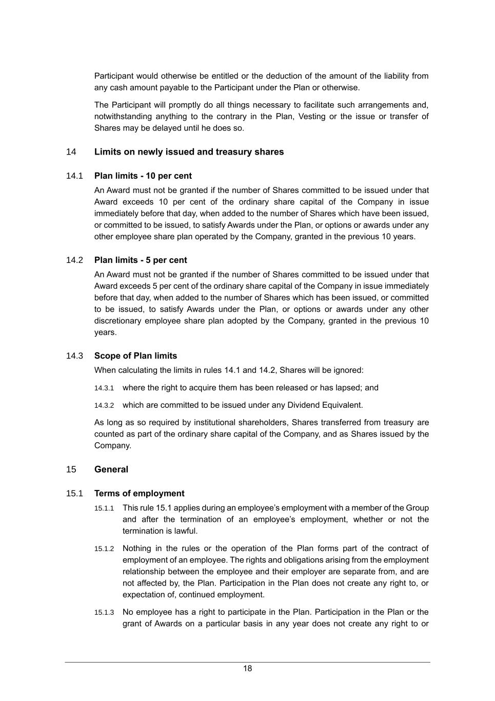 18 Participant would otherwise be entitled or the deduction of the amount of the liability from any cash amount payable to the Participant under the Plan or otherwise. The Participant will promptly do all things necessary to facilitate such arrangements and, notwithstanding anything to the contrary in the Plan, Vesting or the issue or transfer of Shares may be delayed until he does so. 14 Limits on newly issued and treasury shares 14.1 Plan limits - 10 per cent An Award must not be granted if the number of Shares committed to be issued under that Award exceeds 10 per cent of the ordinary share capital of the Company in issue immediately before that day, when added to the number of Shares which have been issued, or committed to be issued, to satisfy Awards under the Plan, or options or awards under any other employee share plan operated by the Company, granted in the previous 10 years. 14.2 Plan limits - 5 per cent An Award must not be granted if the number of Shares committed to be issued under that Award exceeds 5 per cent of the ordinary share capital of the Company in issue immediately before that day, when added to the number of Shares which has been issued, or committed to be issued, to satisfy Awards under the Plan, or options or awards under any other discretionary employee share plan adopted by the Company, granted in the previous 10 years. 14.3 Scope of Plan limits When calculating the limits in rules 14.1 and 14.2, Shares will be ignored: 14.3.1 where the right to acquire them has been released or has lapsed; and 14.3.2 which are committed to be issued under any Dividend Equivalent. As long as so required by institutional shareholders, Shares transferred from treasury are counted as part of the ordinary share capital of the Company, and as Shares issued by the Company. 15 General 15.1 Terms of employment 15.1.1 This rule 15.1 applies during an employee’s employment with a member of the Group and after the termination of an employee’s employment, whether or not the termination is lawful. 15.1.2 Nothing in the rules or the operation of the Plan forms part of the contract of employment of an employee. The rights and obligations arising from the employment relationship between the employee and their employer are separate from, and are not affected by, the Plan. Participation in the Plan does not create any right to, or expectation of, continued employment. 15.1.3 No employee has a right to participate in the Plan. Participation in the Plan or the grant of Awards on a particular basis in any year does not create any right to or