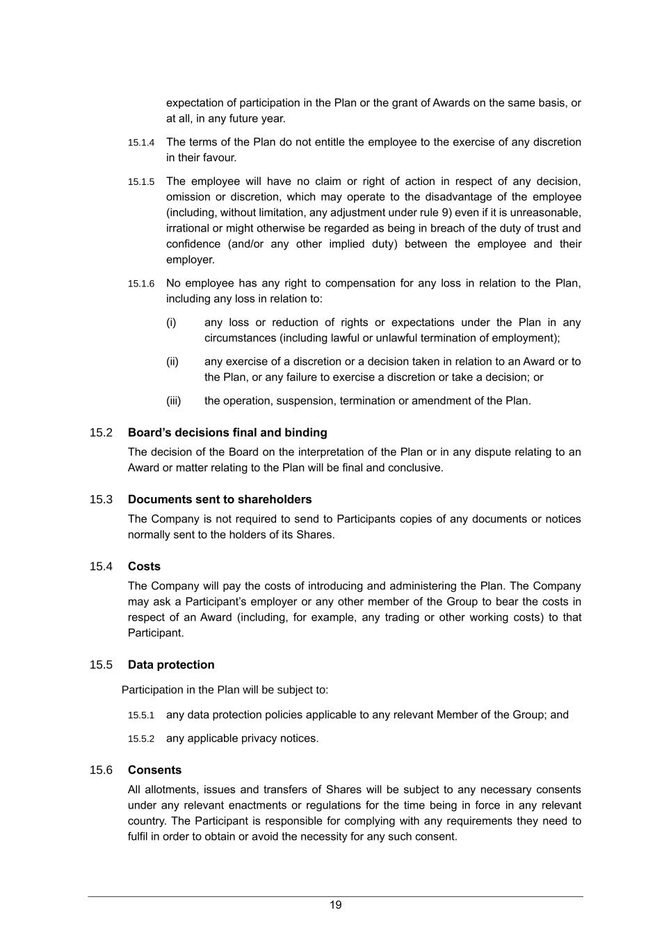 19 expectation of participation in the Plan or the grant of Awards on the same basis, or at all, in any future year. 15.1.4 The terms of the Plan do not entitle the employee to the exercise of any discretion in their favour. 15.1.5 The employee will have no claim or right of action in respect of any decision, omission or discretion, which may operate to the disadvantage of the employee (including, without limitation, any adjustment under rule 9) even if it is unreasonable, irrational or might otherwise be regarded as being in breach of the duty of trust and confidence (and/or any other implied duty) between the employee and their employer. 15.1.6 No employee has any right to compensation for any loss in relation to the Plan, including any loss in relation to: (i) any loss or reduction of rights or expectations under the Plan in any circumstances (including lawful or unlawful termination of employment); (ii) any exercise of a discretion or a decision taken in relation to an Award or to the Plan, or any failure to exercise a discretion or take a decision; or (iii) the operation, suspension, termination or amendment of the Plan. 15.2 Board’s decisions final and binding The decision of the Board on the interpretation of the Plan or in any dispute relating to an Award or matter relating to the Plan will be final and conclusive. 15.3 Documents sent to shareholders The Company is not required to send to Participants copies of any documents or notices normally sent to the holders of its Shares. 15.4 Costs The Company will pay the costs of introducing and administering the Plan. The Company may ask a Participant’s employer or any other member of the Group to bear the costs in respect of an Award (including, for example, any trading or other working costs) to that Participant. 15.5 Data protection Participation in the Plan will be subject to: 15.5.1 any data protection policies applicable to any relevant Member of the Group; and 15.5.2 any applicable privacy notices. 15.6 Consents All allotments, issues and transfers of Shares will be subject to any necessary consents under any relevant enactments or regulations for the time being in force in any relevant country. The Participant is responsible for complying with any requirements they need to fulfil in order to obtain or avoid the necessity for any such consent.