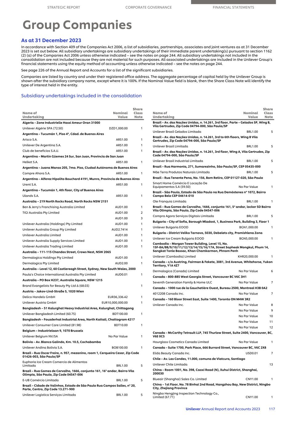 As at 31 December 2023 In accordance with Section 409 of the Companies Act 2006, a list of subsidiaries, partnerships, associates and joint ventures as at 31 December 2023 is set out below. All subsidiary undertakings are subsidiary undertakings of their immediate parent undertaking(s) pursuant to section 1162 (2) (a) of the Companies Act 2006 unless otherwise indicated – see the notes on page 244. All subsidiary undertakings not included in the consolidation are not included because they are not material for such purposes. All associated undertakings are included in the Unilever Group’s financial statements using the equity method of accounting unless otherwise indicated – see the notes on page 244. See page 226 of the Annual Report and Accounts for a list of the significant subsidiaries. Companies are listed by country and under their registered office address. The aggregate percentage of capital held by the Unilever Group is shown after the subsidiary company name, except where it is 100%. If the Nominal Value field is blank, then the Share Class Note will identify the type of interest held in the entity. Subsidiary undertakings included in the consolidation Algeria – Zone Industrielle Hassi Ameur Oran 31000 Unilever Algérie SPA (72.50) DZD1,000.00 1 Argentina – Tucumán 1, Piso 4°, Cdad. de Buenos Aires Arisco S.A. ARS1.00 1 Unilever De Argentina S.A. ARS1.00 1 Club de beneficios S.A.U. ARS1.00 1 Argentina – Martín Güemes 24 Sur, San Juan, Provincia de San Juan Helket S.A. ARS1.00 1 Argentina – Juana Manso 205, 7mo. Piso, Ciudad Autónoma de Buenos Aires Compre Ahora S.A. ARS1.00 1 Argentina – Alferez Hipolito Bouchard 4191, Munro, Provincia de Buenos Aires Urent S.A. ARS1.00 1 Argentina – Tucumán 1, 4th floor, City of Buenos Aires Ulands S.A. ARS1.00 1 Australia – 219 North Rocks Road, North Rocks NSW 2151 Ben & Jerry’s Franchising Australia Limited AUD1.00 1 TIGI Australia Pty Limited AUD1.00 2 AUD1.00 3 Unilever Australia (Holdings) Pty Limited AUD1.00 1 Unilever Australia Group Pty Limited AUD2.7414 1 Unilever Australia Limited AUD1.00 1 Unilever Australia Supply Services Limited AUD1.00 1 Unilever Australia Trading Limited AUD1.00 1 Australia – 111-115 Chandos Street, Crows Nest, NSW 2065 Dermalogica Holdings Pty Limited AUD1.00 1 Dermalogica Pty Limited AUD2.00 1 Australia – Level 12, 60 Castlereagh Street, Sydney, New South Wales, 2000 Paula's Choice International Australia Pty Limited AUD0.01 1 Australia – PO Box H237, Australia Square, NSW 1215 Brand Evangelists for Beauty Pty Ltd ∆ (68.03) 1 Austria – Jakov-Lind-Straße 5, 1020 Wien Delico Handels GmbH EUR36,336.42 1 Unilever Austria GmbH EUR10,000,000.00 1 Bangladesh – 51 Kalurghat Heavy Industrial Area, Kalurghat, Chittagong Unilever Bangladesh Limited (60.75) BDT100.00 1 Bangladesh – Fouzderhat Industrial Area, North Kattali, Chattogram 4217 Unilever Consumer Care Limited (81.98) BDT10.00 1 Belgium – Industrielaan 9, 1070 Brussels Unilever Belgium NV/SA No Par Value 1 Bolivia – Av. Blanco Galindo, Km. 10.5, Cochabamba Unilever Andina Bolivia S.A. BOB100.00 1 Brazil – Rua Oscar Freire, n. 957, mezanino, room 1, Cerqueira Cesar, Zip Code 01426-003, São Paulo/SP Euphoria Ice Cream Comercio de Alimentos Limitada BRL1.00 5 Brazil – Rua Gomes de Carvalho, 1666, conjunto 161, 16ª andar, Bairro Vila Olimpia, São Paulo, Zip Code 04547-006 E-UB Comércio Limitada BRL1.00 5 Brazil – Cidade de Valinhos, Estado de São Paulo Rua Campos Salles, nº 20, Parte, Centro, Zip Code 13.271-900 Unilever Logistica Serviços Limitada BRL1.00 5 Name of Undertaking Nominal Value Share Class Note Brazil – Av. das Nações Unidas, n. 14.261, 3rd floor, Parte – Gelados SP, Wing B, Vila Gertrudes, Zip Code 04794-000, São Paulo/SP Unilever Brasil Gelados Limitada BRL1.00 5 Brazil – Av. das Nações Unidas, n. 14.261, 3rd to 6th floors, Wing B Vila Gertrudes, Zip Code 04794-000, São Paulo/SP Unilever Brasil Limitada BRL1.00 5 Brazil – Av. das Nações Unidas, n. 14.261, 3rd floor, Wing A, Vila Gertrudes, Zip Code 04794-000, São Paulo/SP Unilever Brasil Industrial Limitada BRL1.00 5 Brazil – Rua Harmonia, 271, Sumarezinho, São Paulo/SP, CEP 05435-000 Mãe Terra Produtos Naturais Limitada BRL1.00 5 Brazil – Rua Tenente Pena, No. 156, Bom Retiro, CEP 01127-020, São Paulo Smart Home Comércio E Locação De Equipamentos S.A (59.50) No Par Value 1 Brazil – São Paulo, Estado de São Paulo na Rua Demóstenes nº 1072, Bairro Campo Belo CEP 04614-010 Ole Franquia Limitada BRL1.00 1 Brazil – Rua Gomes de Carvalho, 1666, conjunto 161, 5ª andar, locker 5D Bairro Vila Olimpia, São Paulo, Zip Code 04547-006 Compra Agora Serviços Digitais Limitada BRL1.00 5 Bulgaria – City of Sofia, Borough Mladost, 1, Business Park, Building 3, Floor 1 Unilever Bulgaria EOOD BGN1,000.00 1 Bulgaria – District Veliko Tarnovo, 5030, Debelets city, Promishlena Zona Unilever Ice Cream Bulgaria EOOD BGN5,000.00 1 Cambodia – Morgan Tower Building, Level 15, No. 15F-8A/8B/9/10/11/12/13/14/15/16/17A, Street Sopheak Mongkul, Phum 14, Sangkat Tonle Bassac, Khan Chamkarmon, Phnom Penh Unilever (Cambodia) Limited KHR20,000.00 1 Canada – c/o Austring, Fairman & Fekete, 3081, 3rd Avenue, Whitehorse, Yukon Territory, Y1A 4Z7 Dermalogica (Canada) Limited No Par Value 6 Canada – 800-885 West Georgia Street, Vancouver BC V6C 3H1 Seventh Generation Family & Home ULC No Par Value 7 Canada – 1000 rue de la Gauchetière Ouest, Bureau 2500, Montreal H3B 0A2 4012208 Canada Inc. No Par Value 7 Canada – 160 Bloor Street East, Suite 1400, Toronto ON M4W 3R2 Unilever Canada Inc. No Par Value 8 No Par Value 9 No Par Value 10 No Par Value 11 No Par Value 12 Canada – McCarthy Tetrault LLP, 745 Thurlow Street, Suite 2400, Vancouver, BC, V6E 0C5 Hourglass Cosmetics Canada Limited No Par Value 1 Canada – Suite 1700, Park Place, 666 Burrard Street, Vancouver BC, V6C 2X8 Elida Beauty Canada Inc. USD0.01 7 Chile – Av. Las