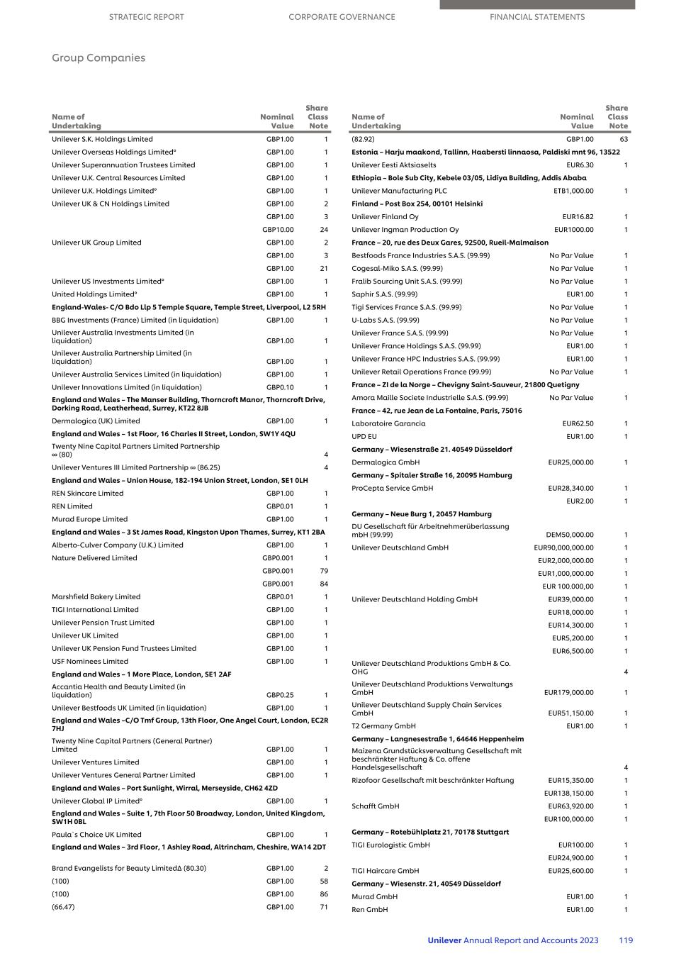 Unilever S.K. Holdings Limited GBP1.00 1 Unilever Overseas Holdings Limited° GBP1.00 1 Unilever Superannuation Trustees Limited GBP1.00 1 Unilever U.K. Central Resources Limited GBP1.00 1 Unilever U.K. Holdings Limited° GBP1.00 1 Unilever UK & CN Holdings Limited GBP1.00 2 GBP1.00 3 GBP10.00 24 Unilever UK Group Limited GBP1.00 2 GBP1.00 3 GBP1.00 21 Unilever US Investments Limited° GBP1.00 1 United Holdings Limited° GBP1.00 1 England-Wales- C/O Bdo Llp 5 Temple Square, Temple Street, Liverpool, L2 5RH BBG Investments (France) Limited (in liquidation) GBP1.00 1 Unilever Australia Investments Limited (in liquidation) GBP1.00 1 Unilever Australia Partnership Limited (in liquidation) GBP1.00 1 Unilever Australia Services Limited (in liquidation) GBP1.00 1 Unilever Innovations Limited (in liquidation) GBP0.10 1 England and Wales – The Manser Building, Thorncroft Manor, Thorncroft Drive, Dorking Road, Leatherhead, Surrey, KT22 8JB Dermalogica (UK) Limited GBP1.00 1 England and Wales – 1st Floor, 16 Charles II Street, London, SW1Y 4QU Twenty Nine Capital Partners Limited Partnership ∞ (80) 4 Unilever Ventures III Limited Partnership ∞ (86.25) 4 England and Wales – Union House, 182-194 Union Street, London, SE1 0LH REN Skincare Limited GBP1.00 1 REN Limited GBP0.01 1 Murad Europe Limited GBP1.00 1 England and Wales – 3 St James Road, Kingston Upon Thames, Surrey, KT1 2BA Alberto-Culver Company (U.K.) Limited GBP1.00 1 Nature Delivered Limited GBP0.001 1 GBP0.001 79 GBP0.001 84 Marshfield Bakery Limited GBP0.01 1 TIGI International Limited GBP1.00 1 Unilever Pension Trust Limited GBP1.00 1 Unilever UK Limited GBP1.00 1 Unilever UK Pension Fund Trustees Limited GBP1.00 1 USF Nominees Limited GBP1.00 1 England and Wales – 1 More Place, London, SE1 2AF Accantia Health and Beauty Limited (in liquidation) GBP0.25 1 Unilever Bestfoods UK Limited (in liquidation) GBP1.00 1 England and Wales –C/O Tmf Group, 13th Floor, One Angel Court, London, EC2R 7HJ Twenty Nine Capital Partners (General Partner) Limited GBP1.00 1 Unilever Ventures Limited GBP1.00 1 Unilever Ventures General Partner Limited GBP1.00 1 England and Wales – Port Sunlight, Wirral, Merseyside, CH62 4ZD Unilever Global IP Limited° GBP1.00 1 England and Wales – Suite 1, 7th Floor 50 Broadway, London, United Kingdom, SW1H 0BL Paula`s Choice UK Limited GBP1.00 1 England and Wales – 3rd Floor, 1 Ashley Road, Altrincham, Cheshire, WA14 2DT Brand Evangelists for Beauty Limited∆ (80.30) GBP1.00 2 (100) GBP1.00 58 (100) GBP1.00 86 (66.47) GBP1.00 71 Name of Undertaking Nominal Value Share Class Note (82.92) GBP1.00 63 Estonia – Harju maakond, Tallinn, Haabersti linnaosa, Paldiski mnt 96, 13522 Unilever Eesti Aktsiaselts EUR6.30 1 Ethiopia – Bole Sub City, Kebele 03/05, Lidiya Building, Addis Ababa Unilever Manufacturing PLC ETB1,000.00 1 Finland – Post Box 254, 00101 Helsinki Unilever Finland Oy EUR16.82 1 Unilever Ingman Production Oy EUR1000.00 1 France – 20, rue des Deux Gares, 92500, Rueil-Malmaison Bestfoods France Industries S.A.S. (99.99) No Par Value 1 Cogesal-Miko S.A.S. (99.99) No Par Value 1 Fralib Sourcing Unit S.A.S. (99.99) No Par Value 1 Saphir S.A.S. (99.99) EUR1.00 1 Tigi Services France S.A.S. (99.99) No Par Value 1 U-Labs S.A.S. (99.99) No Par Value 1 Unilever France S.A.S. (99.99) No Par Value 1 Unilever France Holdings S.A.S. (99.99) EUR1.00 1 Unilever France HPC Industries S.A.S. (99.99) EUR1.00 1 Unilever Retail Operations France (99.99) No Par Value 1 France – ZI de la Norge – Chevigny Saint-Sauveur, 21800 Quetigny Amora Maille Societe Industrielle S.A.S. (99.99) No Par Value 1 France – 42, rue Jean de La Fontaine, Paris, 75016 Laboratoire Garancia EUR62.50 1 UPD EU EUR1.00 1 Germany – Wiesenstraße 21. 40549 Düsseldorf Dermalogica GmbH EUR25,000.00 1 Germany – Spitaler Straße 16, 20095 Hamburg ProCepta Service GmbH EUR28,340.00 1 EUR2.00 1 Germany – Neue Burg 1, 20457 Hamburg DU Gesellschaft für Arbeitnehmerüberlassung mbH (99.99) DEM50,000.00 1 Unilever Deutschland GmbH EUR90,000,000.00 1 EUR2,000,000.00 1 EUR1,000,000.00 1 EUR 100.000,00 1 Unilever Deutschland Holding GmbH EUR39,000.00 1 EUR18,000.00 1 EUR14,300.00 1 EUR5,200.00 1 EUR6,500.00 1 Unilever Deutschland Produktions GmbH & Co. OHG 4 Unilever Deutschland Produktions Verwaltungs GmbH EUR179,000.00 1 Unilever Deutschland Supply Chain Services GmbH EUR51,150.00 1 T2 Germany GmbH EUR1.00 1 Germany – Langnesestraße 1, 64646 Heppenheim Maizena Grundstücksverwaltung Gesellschaft mit beschränkter Haftung & Co. offene Handelsgesellschaft 4 Rizofoor Gesellschaft mit beschränkter Haftung EUR15,350.00 1 EUR138,150.00 1 Schafft GmbH EUR63,920.00 1 EUR100,000.00 1 Germany – Rotebühlplatz 21, 70178 Stuttgart TIGI Eurologistic GmbH EUR100.00 1 EUR24,900.00 1 TIGI Haircare GmbH EUR25,600.00 1 Germany – Wiesenstr. 21, 40549 Düsseldorf Murad GmbH EUR1.00 1 Ren GmbH EUR1.00 1 Name of Undertaking Nominal Value Share Class Note STRATEGIC REPORT CORPORATE GOVERNANCE FINANCIAL STATEMENTS Group Companies Unilever Annual Report and Accounts 2023 119