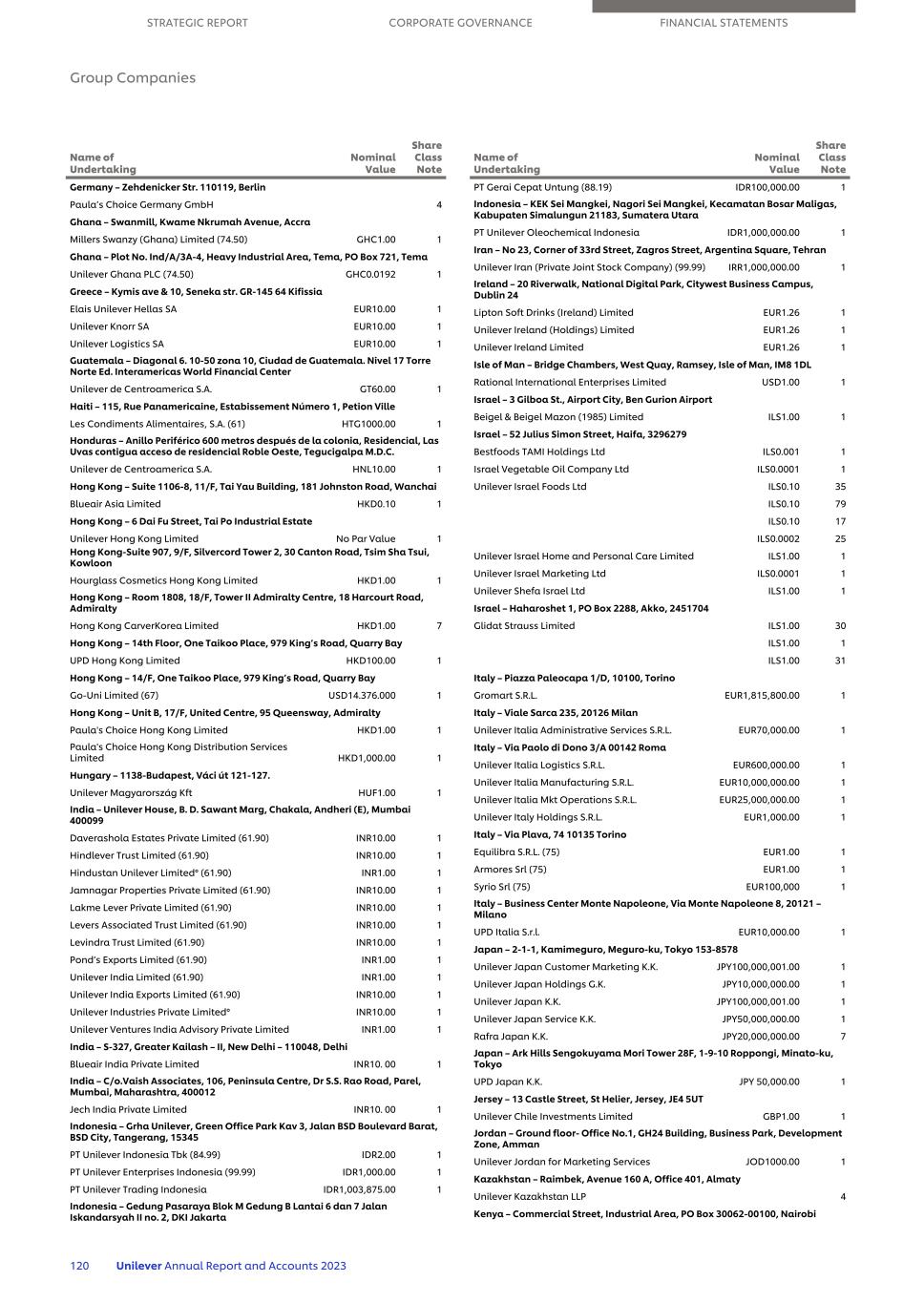 Germany – Zehdenicker Str. 110119, Berlin Paula’s Choice Germany GmbH 4 Ghana – Swanmill, Kwame Nkrumah Avenue, Accra Millers Swanzy (Ghana) Limited (74.50) GHC1.00 1 Ghana – Plot No. Ind/A/3A-4, Heavy Industrial Area, Tema, PO Box 721, Tema Unilever Ghana PLC (74.50) GHC0.0192 1 Greece – Kymis ave & 10, Seneka str. GR-145 64 Kifissia Elais Unilever Hellas SA EUR10.00 1 Unilever Knorr SA EUR10.00 1 Unilever Logistics SA EUR10.00 1 Guatemala – Diagonal 6. 10-50 zona 10, Ciudad de Guatemala. Nivel 17 Torre Norte Ed. Interamericas World Financial Center Unilever de Centroamerica S.A. GT60.00 1 Haiti – 115, Rue Panamericaine, Estabissement Número 1, Petion Ville Les Condiments Alimentaires, S.A. (61) HTG1000.00 1 Honduras – Anillo Periférico 600 metros después de la colonia, Residencial, Las Uvas contigua acceso de residencial Roble Oeste, Tegucigalpa M.D.C. Unilever de Centroamerica S.A. HNL10.00 1 Hong Kong – Suite 1106-8, 11/F, Tai Yau Building, 181 Johnston Road, Wanchai Blueair Asia Limited HKD0.10 1 Hong Kong – 6 Dai Fu Street, Tai Po Industrial Estate Unilever Hong Kong Limited No Par Value 1 Hong Kong-Suite 907, 9/F, Silvercord Tower 2, 30 Canton Road, Tsim Sha Tsui, Kowloon Hourglass Cosmetics Hong Kong Limited HKD1.00 1 Hong Kong – Room 1808, 18/F, Tower II Admiralty Centre, 18 Harcourt Road, Admiralty Hong Kong CarverKorea Limited HKD1.00 7 Hong Kong – 14th Floor, One Taikoo Place, 979 King’s Road, Quarry Bay UPD Hong Kong Limited HKD100.00 1 Hong Kong – 14/F, One Taikoo Place, 979 King’s Road, Quarry Bay Go-Uni Limited (67) USD14.376.000 1 Hong Kong – Unit B, 17/F, United Centre, 95 Queensway, Admiralty Paula's Choice Hong Kong Limited HKD1.00 1 Paula's Choice Hong Kong Distribution Services Limited HKD1,000.00 1 Hungary – 1138-Budapest, Váci út 121-127. Unilever Magyarország Kft HUF1.00 1 India – Unilever House, B. D. Sawant Marg, Chakala, Andheri (E), Mumbai 400099 Daverashola Estates Private Limited (61.90) INR10.00 1 Hindlever Trust Limited (61.90) INR10.00 1 Hindustan Unilever Limited° (61.90) INR1.00 1 Jamnagar Properties Private Limited (61.90) INR10.00 1 Lakme Lever Private Limited (61.90) INR10.00 1 Levers Associated Trust Limited (61.90) INR10.00 1 Levindra Trust Limited (61.90) INR10.00 1 Pond’s Exports Limited (61.90) INR1.00 1 Unilever India Limited (61.90) INR1.00 1 Unilever India Exports Limited (61.90) INR10.00 1 Unilever Industries Private Limited° INR10.00 1 Unilever Ventures India Advisory Private Limited INR1.00 1 India – S-327, Greater Kailash – II, New Delhi – 110048, Delhi Blueair India Private Limited INR10. 00 1 India – C/o.Vaish Associates, 106, Peninsula Centre, Dr S.S. Rao Road, Parel, Mumbai, Maharashtra, 400012 Jech India Private Limited INR10. 00 1 Indonesia – Grha Unilever, Green Office Park Kav 3, Jalan BSD Boulevard Barat, BSD City, Tangerang, 15345 PT Unilever Indonesia Tbk (84.99) IDR2.00 1 PT Unilever Enterprises Indonesia (99.99) IDR1,000.00 1 PT Unilever Trading Indonesia IDR1,003,875.00 1 Indonesia – Gedung Pasaraya Blok M Gedung B Lantai 6 dan 7 Jalan Iskandarsyah II no. 2, DKI Jakarta Name of Undertaking Nominal Value Share Class Note PT Gerai Cepat Untung (88.19) IDR100,000.00 1 Indonesia – KEK Sei Mangkei, Nagori Sei Mangkei, Kecamatan Bosar Maligas, Kabupaten Simalungun 21183, Sumatera Utara PT Unilever Oleochemical Indonesia IDR1,000,000.00 1 Iran – No 23, Corner of 33rd Street, Zagros Street, Argentina Square, Tehran Unilever Iran (Private Joint Stock Company) (99.99) IRR1,000,000.00 1 Ireland – 20 Riverwalk, National Digital Park, Citywest Business Campus, Dublin 24 Lipton Soft Drinks (Ireland) Limited EUR1.26 1 Unilever Ireland (Holdings) Limited EUR1.26 1 Unilever Ireland Limited EUR1.26 1 Isle of Man – Bridge Chambers, West Quay, Ramsey, Isle of Man, IM8 1DL Rational International Enterprises Limited USD1.00 1 Israel – 3 Gilboa St., Airport City, Ben Gurion Airport Beigel & Beigel Mazon (1985) Limited ILS1.00 1 Israel – 52 Julius Simon Street, Haifa, 3296279 Bestfoods TAMI Holdings Ltd ILS0.001 1 Israel Vegetable Oil Company Ltd ILS0.0001 1 Unilever Israel Foods Ltd ILS0.10 35 ILS0.10 79 ILS0.10 17 ILS0.0002 25 Unilever Israel Home and Personal Care Limited ILS1.00 1 Unilever Israel Marketing Ltd ILS0.0001 1 Unilever Shefa Israel Ltd ILS1.00 1 Israel – Haharoshet 1, PO Box 2288, Akko, 2451704 Glidat Strauss Limited ILS1.00 30 ILS1.00 1 ILS1.00 31 Italy – Piazza Paleocapa 1/D, 10100, Torino Gromart S.R.L. EUR1,815,800.00 1 Italy – Viale Sarca 235, 20126 Milan Unilever Italia Administrative Services S.R.L. EUR70,000.00 1 Italy – Via Paolo di Dono 3/A 00142 Roma Unilever Italia Logistics S.R.L. EUR600,000.00 1 Unilever Italia Manufacturing S.R.L. EUR10,000,000.00 1 Unilever Italia Mkt Operations S.R.L. EUR25,000,000.00 1 Unilever Italy Holdings S.R.L. EUR1,000.00 1 Italy – Via Plava, 74 10135 Torino Equilibra S.R.L. (75) EUR1.00 1 Armores Srl (75) EUR1.00 1 Syrio Srl (75) EUR100,000 1 Italy – Business Center Monte Napoleone, Via Monte Napoleone 8, 20121 – Milano UPD Italia S.r.l. EUR10,000.00 1 Japan – 2-1-1, Kamimeguro, Meguro-ku, Tokyo 153-8578 Unilever Japan Customer Marketing K.K. JPY100,000,001.00 1 Unilever Japan Holdings G.K. JPY10,000,000.00 1 Unilever Japan K.K. JPY100,000,001.00 1 Unilever Japan Service K.K. JPY50,000,000.00 1 Rafra Japan K.K. JPY20,000,000.00 7 Japan – Ark Hills Sengokuyama Mori Tower 28F, 1-9-10 Roppongi, Minato-ku, Tokyo UPD Japan K.K. JPY 50,000.00 1 Jersey – 13 Castle Street, St Helier, Jersey, JE4 5UT Unilever Chile Investments Limited GBP1.00 1 Jordan – Ground floor- Office No.1, GH24 Building, Business Park, Development Zone, Amman Unilever Jordan for Marketing Services JOD1000.00 1 Kazakhstan – Raimbek, Avenue 160 A, Office 401, Almaty Unilever Kazakhstan LLP 4 Kenya – Commercial Street, Industrial Area, PO Box 30062-00100, Nairobi Name of Undertaking Nominal Value Share Class Note STRATEGIC REPORT CORP
