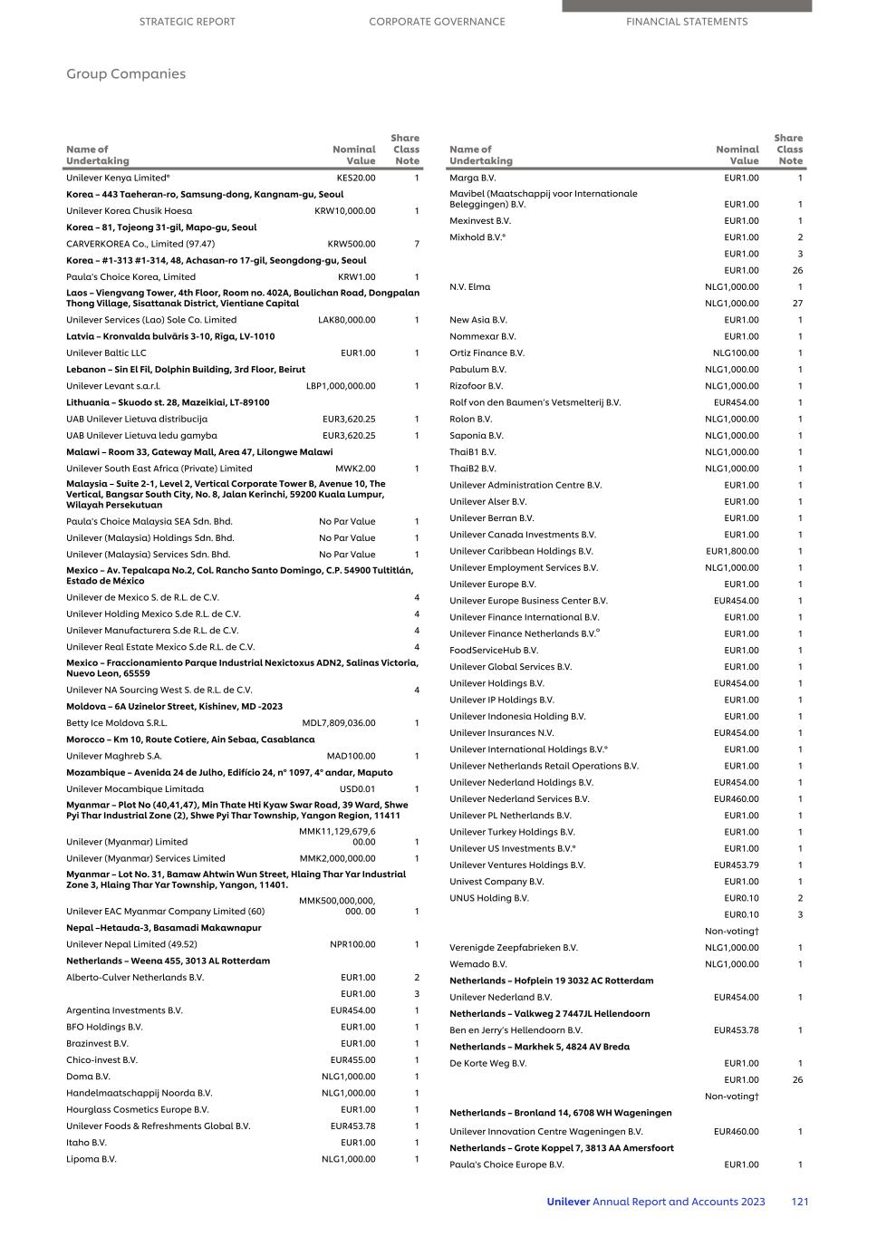 Unilever Kenya Limited° KES20.00 1 Korea – 443 Taeheran-ro, Samsung-dong, Kangnam-gu, Seoul Unilever Korea Chusik Hoesa KRW10,000.00 1 Korea – 81, Tojeong 31-gil, Mapo-gu, Seoul CARVERKOREA Co., Limited (97.47) KRW500.00 7 Korea – #1-313 #1-314, 48, Achasan-ro 17-gil, Seongdong-gu, Seoul Paula's Choice Korea, Limited KRW1.00 1 Laos – Viengvang Tower, 4th Floor, Room no. 402A, Boulichan Road, Dongpalan Thong Village, Sisattanak District, Vientiane Capital Unilever Services (Lao) Sole Co. Limited LAK80,000.00 1 Latvia – Kronvalda bulvāris 3-10, Rīga, LV-1010 Unilever Baltic LLC EUR1.00 1 Lebanon – Sin El Fil, Dolphin Building, 3rd Floor, Beirut Unilever Levant s.a.r.l. LBP1,000,000.00 1 Lithuania – Skuodo st. 28, Mazeikiai, LT-89100 UAB Unilever Lietuva distribucija EUR3,620.25 1 UAB Unilever Lietuva ledu gamyba EUR3,620.25 1 Malawi – Room 33, Gateway Mall, Area 47, Lilongwe Malawi Unilever South East Africa (Private) Limited MWK2.00 1 Malaysia – Suite 2-1, Level 2, Vertical Corporate Tower B, Avenue 10, The Vertical, Bangsar South City, No. 8, Jalan Kerinchi, 59200 Kuala Lumpur, Wilayah Persekutuan Paula's Choice Malaysia SEA Sdn. Bhd. No Par Value 1 Unilever (Malaysia) Holdings Sdn. Bhd. No Par Value 1 Unilever (Malaysia) Services Sdn. Bhd. No Par Value 1 Mexico – Av. Tepalcapa No.2, Col. Rancho Santo Domingo, C.P. 54900 Tultitlán, Estado de México Unilever de Mexico S. de R.L. de C.V. 4 Unilever Holding Mexico S.de R.L. de C.V. 4 Unilever Manufacturera S.de R.L. de C.V. 4 Unilever Real Estate Mexico S.de R.L. de C.V. 4 Mexico – Fraccionamiento Parque Industrial Nexictoxus ADN2, Salinas Victoria, Nuevo Leon, 65559 Unilever NA Sourcing West S. de R.L. de C.V. 4 Moldova – 6A Uzinelor Street, Kishinev, MD -2023 Betty Ice Moldova S.R.L. MDL7,809,036.00 1 Morocco – Km 10, Route Cotiere, Ain Sebaa, Casablanca Unilever Maghreb S.A. MAD100.00 1 Mozambique – Avenida 24 de Julho, Edifício 24, nº 1097, 4º andar, Maputo Unilever Mocambique Limitada USD0.01 1 Myanmar – Plot No (40,41,47), Min Thate Hti Kyaw Swar Road, 39 Ward, Shwe Pyi Thar Industrial Zone (2), Shwe Pyi Thar Township, Yangon Region, 11411 Unilever (Myanmar) Limited MMK11,129,679,6 00.00 1 Unilever (Myanmar) Services Limited MMK2,000,000.00 1 Myanmar – Lot No. 31, Bamaw Ahtwin Wun Street, Hlaing Thar Yar Industrial Zone 3, Hlaing Thar Yar Township, Yangon, 11401. Unilever EAC Myanmar Company Limited (60) MMK500,000,000, 000. 00 1 Nepal –Hetauda-3, Basamadi Makawnapur Unilever Nepal Limited (49.52) NPR100.00 1 Netherlands – Weena 455, 3013 AL Rotterdam Alberto-Culver Netherlands B.V. EUR1.00 2 EUR1.00 3 Argentina Investments B.V. EUR454.00 1 BFO Holdings B.V. EUR1.00 1 Brazinvest B.V. EUR1.00 1 Chico-invest B.V. EUR455.00 1 Doma B.V. NLG1,000.00 1 Handelmaatschappij Noorda B.V. NLG1,000.00 1 Hourglass Cosmetics Europe B.V. EUR1.00 1 Unilever Foods & Refreshments Global B.V. EUR453.78 1 Itaho B.V. EUR1.00 1 Lipoma B.V. NLG1,000.00 1 Name of Undertaking Nominal Value Share Class Note Marga B.V. EUR1.00 1 Mavibel (Maatschappij voor Internationale Beleggingen) B.V. EUR1.00 1 Mexinvest B.V. EUR1.00 1 Mixhold B.V.° EUR1.00 2 EUR1.00 3 EUR1.00 26 N.V. Elma NLG1,000.00 1 NLG1,000.00 27 New Asia B.V. EUR1.00 1 Nommexar B.V. EUR1.00 1 Ortiz Finance B.V. NLG100.00 1 Pabulum B.V. NLG1,000.00 1 Rizofoor B.V. NLG1,000.00 1 Rolf von den Baumen’s Vetsmelterij B.V. EUR454.00 1 Rolon B.V. NLG1,000.00 1 Saponia B.V. NLG1,000.00 1 ThaiB1 B.V. NLG1,000.00 1 ThaiB2 B.V. NLG1,000.00 1 Unilever Administration Centre B.V. EUR1.00 1 Unilever Alser B.V. EUR1.00 1 Unilever Berran B.V. EUR1.00 1 Unilever Canada Investments B.V. EUR1.00 1 Unilever Caribbean Holdings B.V. EUR1,800.00 1 Unilever Employment Services B.V. NLG1,000.00 1 Unilever Europe B.V. EUR1.00 1 Unilever Europe Business Center B.V. EUR454.00 1 Unilever Finance International B.V. EUR1.00 1 Unilever Finance Netherlands B.V.o EUR1.00 1 FoodServiceHub B.V. EUR1.00 1 Unilever Global Services B.V. EUR1.00 1 Unilever Holdings B.V. EUR454.00 1 Unilever IP Holdings B.V. EUR1.00 1 Unilever Indonesia Holding B.V. EUR1.00 1 Unilever Insurances N.V. EUR454.00 1 Unilever International Holdings B.V.° EUR1.00 1 Unilever Netherlands Retail Operations B.V. EUR1.00 1 Unilever Nederland Holdings B.V. EUR454.00 1 Unilever Nederland Services B.V. EUR460.00 1 Unilever PL Netherlands B.V. EUR1.00 1 Unilever Turkey Holdings B.V. EUR1.00 1 Unilever US Investments B.V.° EUR1.00 1 Unilever Ventures Holdings B.V. EUR453.79 1 Univest Company B.V. EUR1.00 1 UNUS Holding B.V. EUR0.10 2 EUR0.10 3 Non-voting† Verenigde Zeepfabrieken B.V. NLG1,000.00 1 Wemado B.V. NLG1,000.00 1 Netherlands – Hofplein 19 3032 AC Rotterdam Unilever Nederland B.V. EUR454.00 1 Netherlands – Valkweg 2 7447JL Hellendoorn Ben en Jerry’s Hellendoorn B.V. EUR453.78 1 Netherlands – Markhek 5, 4824 AV Breda De Korte Weg B.V. EUR1.00 1 EUR1.00 26 Non-voting† Netherlands – Bronland 14, 6708 WH Wageningen Unilever Innovation Centre Wageningen B.V. EUR460.00 1 Netherlands – Grote Koppel 7, 3813 AA Amersfoort Paula's Choice Europe B.V. EUR1.00 1 Name of Undertaking Nominal Value Share Class Note STRATEGIC REPORT CORPORATE GOVERNANCE FINANCIAL STATEMENTS Group Companies Unilever Annual Report and Accounts 2023 121