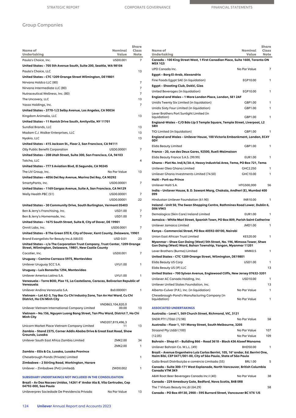Premium Exports Ceylon (Private) Limited No Par Value 1 R.O. Mennell & Co. (Ceylon) (Private) Limited No Par Value 1 Unilever Ceylon Services (Private) Limited No Par Value 1 Unilever Lanka Consumer Limited No Par Value 1 Unilever Sri Lanka Limited° No Par Value 1 Sudan – Property no. 125, block 2, Industrial Area, Kafuri District, Bahri, Kafori Unilever Sudanese Investment Company SDG10,000.00 1 Sweden – Box 1056, Svetsarvägen 15, 171 22, Solna Stockholm Alberto Culver AB SEK100.00 1 Unilever Holding AB SEK100.00 1 Unilever Produktion AB SEK50.00 1 Unilever Sverige AB SEK100.00 1 Sweden – Karlavagen 108, 115 26 Stockholm Blueair AB SEK100.00 1 Sweden – Karlavagen 108, 115 26, Stockholm Jonborsten AB SEK1000.00 1 Sweden – Nordenskioldgatan 19, 413 09 Goteborg Nature Delivered Sweden AB SEK1.00 1 Switzerland – Bahnhofstrasse 19, CH 8240 Thayngen Knorr-Nährmittel Aktiengesellschaft CHF1,000.00 1 Unilever Schweiz GmbH CHF100,000.00 1 Switzerland – Spitalstrasse 5, 8200, Schaffhausen Helmsman Capital AG CHF1,000.00 1 Unilever Supply Chain Company AG CHF1,000.00 1 Unilever ASCC AG CHF1,000.00 1 Unilever Finance International AG CHF1,000.00 1 Unilever Business and Marketing Support AG CHF1,000.00 1 Unilever Overseas Holdings AG CHF1,000.00 1 Unilever Schaffhausen Service AG CHF1,000.00 1 Unilever Swiss Holdings AG CHF1,000.00 1 Switzerland – Hinterbergstr. 30, CH-6312 Steinhausen Oswald Nahrungsmittel GmbH CHF800,000.00 1 Taiwan – 15F, No. 39, Sec. 2, Dunhua S. Road, Da’an District, Taipei City Unilever Taiwan Limited (99.92) TWD10.00 1 Taiwan – 8 F-1 & 8F-2, No. 186, Sec. 1, Zhangmei Rd., Changhua City, Changhua County 50062, Taiwan (R.O.C.) Paula's Choice Taiwan Co., Limited NTD27.000 1 Tanzania – Plot No. 4A, Nyerere Road, Dar Es Salaam, PO Box 40383 Unilever Tanzania Limited TZS20.00 1 Thailand – 161 Rama 9 Road, Huay Kwang, Bangkok 10310 Unilever Thai Holdings Limited THB100.00 1 Unilever Thai Trading Limited THB100.00 1 Thailand – 12 A Floor Unit B1-B2, Office No. 1225, 989 Siam Piwat Tower, Rama I Road, Pathumwan Sub-district, Pathumwan District, Bangkok 10330 UPD (Thailand) Co. Limited THB100.00 1 Thailand– 21/39 Soi Lardprao 15, Jompol Sub-district, Jatujak District, Bangkok Gronext Technologies (Thailand) Limited THB100.00 1 Trinidad & Tobago – Eastern Main Road, Champs Fleurs Unilever Caribbean Limited (50.01) TTD1.00 1 Tunisia – Z.I. Voie Z4-2014 Mégrine Erriadh – Tunis Unilever Tunisia S.A. (99.78) TND6.00 1 Unilever Maghreb Export S.A. (99.76) TND5.00 1 Tunisia – Z.I. Voie Z4, Megrine Riadh, Tunis, 2014 UTIC Distribution S.A. (99.78) TND10.00 1 Turkey – Saray Mahallesi, Dr. Adnan Büyükdeniz Cad., No.13, 34768 Ümraniye – İstanbul Unilever Gida Sanayi ve Ticaret AŞo (99.98) TRY0.01 1 Unilever Sanayi Ve Ticaret Türk AŞo (99.98) TRY0.01 1 Besan Besin Sanayi ve Ticaret AŞ (99.99) TRY0.01 1 Unilever Hizli Tuketim Urunleri Satis Pazarlama ve Ticaret Anonim Sirketi (99.99) TRY1.00 1 Name of Undertaking Nominal Value Share Class Note Uganda – DFCU Towers, 5th Floor, Plot 26 Kyadondo Road, Industrial Area, PO Box 3515, Kampala Unilever Uganda Limited UGX20.00 1 Ukraine – 04119, 27-T, Letter A, Dehtyarivska Str., Kyiv Unilever Ukraine LLC UAH 1,151,329,851 13 United Arab Emirates – PO Box 17053, Jebel Ali, Dubai Severn Gulf FZCOX (50) AED100,000.00 1 Unilever Gulf FZE AED1,000,000.00 1 United Arab Emirates – Office No. 901 owned by Easa Saleh AlGurg LLC- Deira- Riqqa AlBateeen Unilever Binzagr Gulf General Trading LLCX (50) AED1,000.00 1 Unilever General Trading LLC AED1,000.00 1 United Arab Emirates – Warehouse No. 1.2, Dubai Industrial Park – Seeh Shwaib 2 Unilever Home & Personal Care Products Manufacturing LLCX (49) AED1,000.00 1 United States – 700 Sylvan Avenue, Englewood Cliffs, New Jersey 07632-3201 Alberto-Culver Company No Par Value 1 Alberto-Culver International, Inc. USD1.00 1 Alberto-Culver USA, Inc. No Par Value 1 BC Cadence Holdings, Inc. USD0.01 1 Ben & Jerry’s Gift Card, LLC 13 Conopco, Inc. USD1.00 7 Kate Somerville Holdings, LLC 13 Kate Somerville Skincare LLC 13 Kensington & Sons, LLC No Par Value 13 Kirei Intermediate Holdings, LLC 13 Living Proof, Inc. USD0.01 7 Pantresse, Inc. USD120.00 1 Skin Health Experts, LLC 13 St. Ives Laboratories, Inc. USD0.01 1 The Laundress, LLC 13 TIGI Linea Corp No Par Value 1 Unilever Bestfoods (Holdings) LLC 13 Unilever Capital Corporation USD1.00 1 Unilever North America Supply Chain Company, LLC 13 Unilever United States, Inc. USD0.3333 7 USD73.50 22 Unilever Ventures Advisory LLC 13 US Health & Wellbeing LLC No Par Value 13 Yasso, Inc. USD0.01 7 United States – 1535 Beachey Pl Carson, CA 90746 Dermalogica, LLC 13 United States – 2121 Park Place, First Floor El Segundo, CA 90245 Murad LLC 13 United States – 1090 King Georges Post Road, Suite 505 Edison, NJ 08837 REN USA Inc. No Par Value 7 United States – 125 S Clark, Suite 2000, Chicago, IL 60603 Blueair Inc. No Par Value 1 United States – 2816 S. Kilbourne Avenue, Chicago IL 60624 Unilever Illinois Manufacturing, LLC 13 United States – 2900 W. Truman Boulevard, Jefferson City, MO 65109 Unilever Manufacturing (US), Inc. No Par Value 7 United States – 40 Merritt Boulevard, Trumbull, CT 06611 Unilever Trumbull Holdings, Inc. USD1.00 7 Unilever Trumbull Research Services, Inc. USD1.00 1 United States – 60 Lake Street, Suite 3N, Burlington, VT 05401 Seventh Generation Canada, Inc. No Par Value 7 Seventh Generation, Inc. USD0.001 7 United States – 2711 Centerville Road, Suite 400, Wilmington, DE 19808 Name of Undertaking Nominal Value Share Class Note STRATEGIC REPORT CORPORATE GOVERNANCE FINANCIAL STATEMENTS Group Companies Unilever Annual Report and Accounts 2023 123