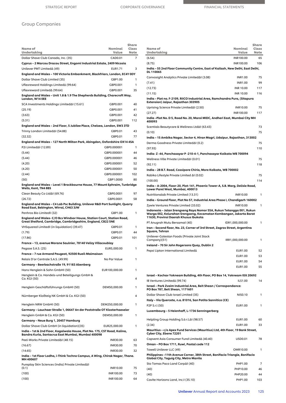 Dollar Shave Club Canada, Inc. (35) CAD0.01 7 Cyprus – 2 Marcou Dracou Street, Engomi Industrial Estate, 2409 Nicosia Unilever PMT Limited∆ (49) EUR1.71 3 England and Wales – 100 Victoria Embankment, Blackfriars, London, EC4Y 0DY Dollar Shave Club Limited (35) GBP1.00 1 Uflexreward Holdings LimitedΔ (99.64) GBP0.001 1 Uflexreward LimitedΔ (99.64) GBP0.001 35 England and Wales – Unit 1.8 & 1.9 The Shepherds Building, Charecroft Way, London, W14 0EE SCA Investments Holdings Limited∆◊ (15.61) GBP0.001 40 (25.19) GBP0.001 41 (3.63) GBP0.001 42 (5.31) GBP0.001 112 England and Wales – 2nd Floor, 5 Jubilee Place, Chelsea, London, SW3 3TD Trinny London Limited∆◊ (54.88) GBP0.01 43 (32.32) GBP0.01 77 England and Wales – 127 North Milton Park, Abingdon, Oxfordshire OX14 4SA P2i Limited∆◊ (12.89) GBP0.000001 1 (5.44) GBP0.000001 44 (5.44) GBP0.000001 46 (4.20) GBP0.000001 52 (4.20) GBP0.000001 50 (2.44) GBP0.000001 102 (50) GBP1.0000 80 England and Wales – Level 1 Brockbourne House, 77 Mount Ephraim, Tunbridge Wells, Kent, TN4 8BS Clean Beauty Co Ltd∆◊ (69.76) GBP0.0001 97 (26.72) GBP0.0001 58 England and Wales – C4 Lab Psc Building, Unilever R&D Port Sunlight, Quarry Road East, Bebington, Wirral, CH63 3JW Penhros Bio Limited◊ (32) GBP1.00 1 England and Wales- C/O Bcs Windsor House, Station Court, Station Road, Great Shelford, Cambridge, Cambridgeshire, England, CB22 5NE VHSquared Limited◊ (in liquidation) (39.47) GBP0.01 1 (1.79) GBP0.01 44 (17.86) GBP0.01 101 France – 13, avenue Morane Saulnier, 78140 Velizy Villacoublay Pegase S.A.S. (25) EUR5,000.00 1 France – 7 rue Armand Peugeot, 92500 Rueil-Malmaison Relais D’or Centrale S.A.S. (49.99) No Par Value 1 Germany – Beerbachstraße 19, 91183 Abenberg Hans Henglein & Sohn GmbH◊ (50) EUR100,000.00 1 Henglein & Co. Handels-und Beteiligungs GmbH & Co. KG◊ (50) 4 Henglein Geschäftsführungs GmbH◊ (50) DEM50,000.00 1 Nürnberger Kloßteig NK GmbH & Co. KG◊ (50) 4 Henglein NRW GmbH◊ (50) DEM250,000.00 1 Germany – Lauchaer Straße 1, 06647 An der Poststraße OT Klosterhaeseler Henglein GmbH & Co. KG◊ (50) DEM50,000.00 1 Germany – Neue Burg 1, 20457 Hamburg Dollar Shave Club GmbH (in liquidation)(35) EUR25,000.00 1 India – 1st & 2nd Floor, Kagalwala House, Plot No. 175, CST Road, Kalina, Bandra Kurla, Santacruz East Mumbai, Mumbai 400098 Peel-Works Private Limited∆◊ (48.15) INR30.00 63 (16.67) INR30.00 70 (14.65) INR30.00 32 India – 1st Floor Lodha, i-Think Techno Campus, A Wing, Chirak Nagar, Thane. MH 400607 Pureplay Skin Sciences (India) Private Limited∆◊ (0.1) INR10.00 75 (100) INR100.00 73 (100) INR100.00 64 Name of Undertaking Nominal Value Share Class Note (6.54) INR100.00 65 (8.75) INR100.00 106 India – 55 2nd Floor Community Centre, East of Kailash, New Delhi, East Delhi, DL 110065 Convosight Analytics Private Limited∆◊ (3.08) INR1.00 75 (7.41) INR1.00 99 (12.73) INR 10.00 117 (11.15) INR 10.00 116 India – Plot no. F-2109, RIICO Industrial Area, Ramchandra Pura, (Sitapura Extension) Jaipur, Rajasthan 303905 Uprising Science Private Limited∆◊ (2.50) INR10.00 75 (27.27) INR100.00 117 India –Plot No. D 5, Road No. 20, Marol MIDC, Andheri East, Mumbai City MH 400093 Scentials Beautycare & Wellness Ltd∆◊ (63.43) 73 (0.10) 75 India – 15 Ambika Nagar, Sector 4, Hiran Magri, Udaipur, Rajasthan, 313002 Derma Goodness Private Limited∆◊ (0.2) 75 (97.93) 110 India- Z -44, Panchasayar P -210-4-1, Panchasayar Kolkata WB 700094 Wellness Ville Private Limited∆◊ (0.01) 75 (92.11) 118 India – 28 B.T. Road, Cossipore Chiria, More Kolkata, WB 700002 Rabiko Lifestyle Private Limited ∆◊ (0.02) 75 (100.00) 114 India – A-2004, Floor-20, Plot-141, Phoenix Tower-A, S.B. Marg, Delisle Road, Lower Parel West, Mumbai, 400013 Nutritionalab Private Limited (13.31) INR10.00 1 India – Ground Floor, Plot No 57, Industrial Area Phase I, Chandigarh 160002 Zywie Ventures Private Limited (33.02) INR10.00 1 Indonesia – Jalan Srengseng Raya Nomor 55A, Rukun Tetangga 001, Rukun Warga 002, Kelurahan Srengseng, Kecamatan Kembangan, Jakarta Barat 11630, Provinsi Daerah Khusus Ibukota PT Anugrah Mutu Bersama◊ (40) IDR1,000,000.00 1 Iran – Second floor, No. 23, Corner of 3rd Street, Zagros Street, Argentina Square, Tehran Unilever-Golestan Foods (Private Joint Stock Company)(51) IRR1,000,000.00 1 Ireland – 70 Sir John Rogersons Quay, Dublin 2 Pepsi Lipton International Limited∆ EUR1.00 52 EUR1.00 53 EUR1.00 54 EUR1.00 55 Israel – Kochav Yokneam Building, 4th Floor, PO Box 14, Yokneam Illit 20692 IB Ventures Limited∆ (99.74) ILS1.00 14 Israel – Park Zvaim Industrial Area, Beit Shean / Correspondance: PO Box 787, Beit Shean, 1171601 Dollar Shave Club Israel Limited (35) NIS0.10 1 Italy – Via Quercete, n.a. 81016, San Potito Sannitico (CE) P2P S.r.l (50) EUR1.00 1 Luxembourg – 5 Heienhaff, L-1736 Senningerberg Helpling Group Holding S.à r.l.∆◊ (98.57) EUR1.00 60 (2.34) EUR1.00 33 Mauritius – c/o Apex Fund Services (Mauritius) Ltd, 4th Floor, 19 Bank Street, Cyber City, Ebene 72201 Capvent Asia Consumer Fund Limited∆ (40.40) USD0.01 78 Oman – PO Box 1711, Ruwi, Postal code 112 Towell Unilever LLC (49) OMR10.00 1 Philippines –11th Avenue Corner, 38th Street, Bonifacio Triangle, Bonifacio Global City, Taguig City, Metro Manila Sto Tomas Paco Land Corp∆◊ (40) PHP1.00 7 (40) PHP10.00 46 (40) PHP20.00 44 Cavite Horizons Land, Inc.◊ (35.10) PHP1.00 103 Name of Undertaking Nominal Value Share Class Note STRATEGIC REPORT CORPORATE GOVERNANCE FINANCIAL STATEMENTS Group Companies Unilever Annual Report and Accounts 2023 125