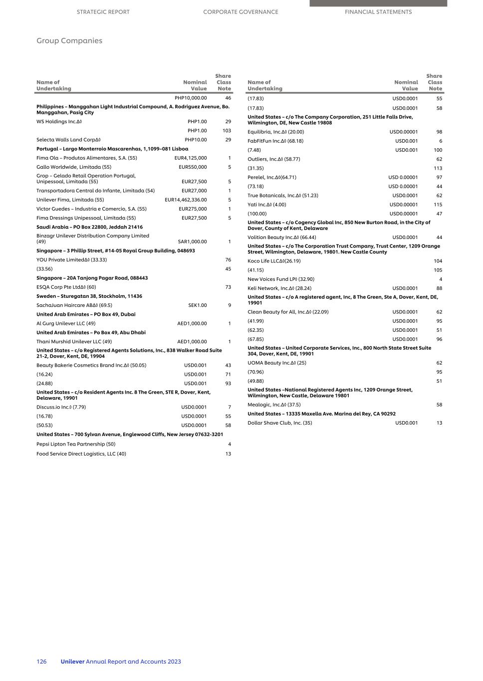 PHP10,000.00 46 Philippines – Manggahan Light Industrial Compound, A. Rodriguez Avenue, Bo. Manggahan, Pasig City WS Holdings Inc.∆◊ PHP1.00 29 PHP1.00 103 Selecta Walls Land Corp∆◊ PHP10.00 29 Portugal – Largo Monterroio Mascarenhas, 1,1099–081 Lisboa Fima Ola – Produtos Alimentares, S.A. (55) EUR4,125,000 1 Gallo Worldwide, Limitada (55) EUR550,000 5 Grop – Gelado Retail Operation Portugal, Unipessoal, Limitada (55) EUR27,500 5 Transportadora Central do Infante, Limitada (54) EUR27,000 1 Unilever Fima, Limitada (55) EUR14,462,336.00 5 Victor Guedes – Industria e Comercio, S.A. (55) EUR275,000 1 Fima Dressings Unipessoal, Limitada (55) EUR27,500 5 Saudi Arabia – PO Box 22800, Jeddah 21416 Binzagr Unilever Distribution Company Limited (49) SAR1,000.00 1 Singapore – 3 Phillip Street, #14-05 Royal Group Building, 048693 YOU Private Limited∆◊ (33.33) 76 (33.56) 45 Singapore – 20A Tanjong Pagar Road, 088443 ESQA Corp Pte Ltd∆◊ (60) 73 Sweden – Sturegatan 38, Stockholm, 11436 SachaJuan Haircare AB∆◊ (69.5) SEK1.00 9 United Arab Emirates – PO Box 49, Dubai Al Gurg Unilever LLC (49) AED1,000.00 1 United Arab Emirates – Po Box 49, Abu Dhabi Thani Murshid Unilever LLC (49) AED1,000.00 1 United States – c/o Registered Agents Solutions, Inc., 838 Walker Road Suite 21-2, Dover, Kent, DE, 19904 Beauty Bakerie Cosmetics Brand Inc.∆◊ (50.05) USD0.001 43 (16.24) USD0.001 71 (24.88) USD0.001 93 United States – c/o Resident Agents Inc. 8 The Green, STE R, Dover, Kent, Delaware, 19901 Discuss.io Inc.◊ (7.79) USD0.0001 7 (16.78) USD0.0001 55 (50.53) USD0.0001 58 United States – 700 Sylvan Avenue, Englewood Cliffs, New Jersey 07632-3201 Pepsi Lipton Tea Partnership (50) 4 Food Service Direct Logistics, LLC (40) 13 Name of Undertaking Nominal Value Share Class Note (17.83) USD0.0001 55 (17.83) USD0.0001 58 United States – c/o The Company Corporation, 251 Little Falls Drive, Wilmington, DE, New Castle 19808 Equilibria, Inc.∆◊ (20.00) USD0.00001 98 FabFitFun Inc.∆◊ (68.18) USD0.001 6 (7.48) USD0.001 100 Outliers, Inc.∆◊ (58.77) 62 (31.35) 113 Perelel, Inc.∆◊(64.71) USD 0.00001 97 (73.18) USD 0.00001 44 True Botanicals, Inc.∆◊ (51.23) USD0.0001 62 Yati Inc.∆◊ (4.00) USD0.00001 115 (100.00) USD0.00001 47 United States – c/o Cogency Global Inc, 850 New Burton Road, in the City of Dover, County of Kent, Delaware Volition Beauty Inc.∆◊ (66.44) USD0.0001 44 United States – c/o The Corporation Trust Company, Trust Center, 1209 Orange Street, Wilmington, Delaware, 19801. New Castle County Koco Life LLC∆◊(26.19) 104 (41.15) 105 New Voices Fund LP◊ (32.90) 4 Keli Network, Inc.∆◊ (28.24) USD0.0001 88 United States – c/o A registered agent, Inc, 8 The Green, Ste A, Dover, Kent, DE, 19901 Clean Beauty for All, Inc.∆◊ (22.09) USD0.0001 62 (41.99) USD0.0001 95 (62.35) USD0.0001 51 (67.85) USD0.0001 96 United States – United Corporate Services, Inc., 800 North State Street Suite 304, Dover, Kent, DE, 19901 UOMA Beauty Inc.∆◊ (25) 62 (70.96) 95 (49.88) 51 United States –National Registered Agents Inc, 1209 Orange Street, Wilmington, New Castle, Delaware 19801 Mealogic, Inc.∆◊ (37.5) 58 United States – 13335 Maxella Ave. Marina del Rey, CA 90292 Dollar Shave Club, Inc. (35) USD0.001 13 Name of Undertaking Nominal Value Share Class Note STRATEGIC REPORT CORPORATE GOVERNANCE FINANCIAL STATEMENTS Group Companies 126 Unilever Annual Report and Accounts 2023
