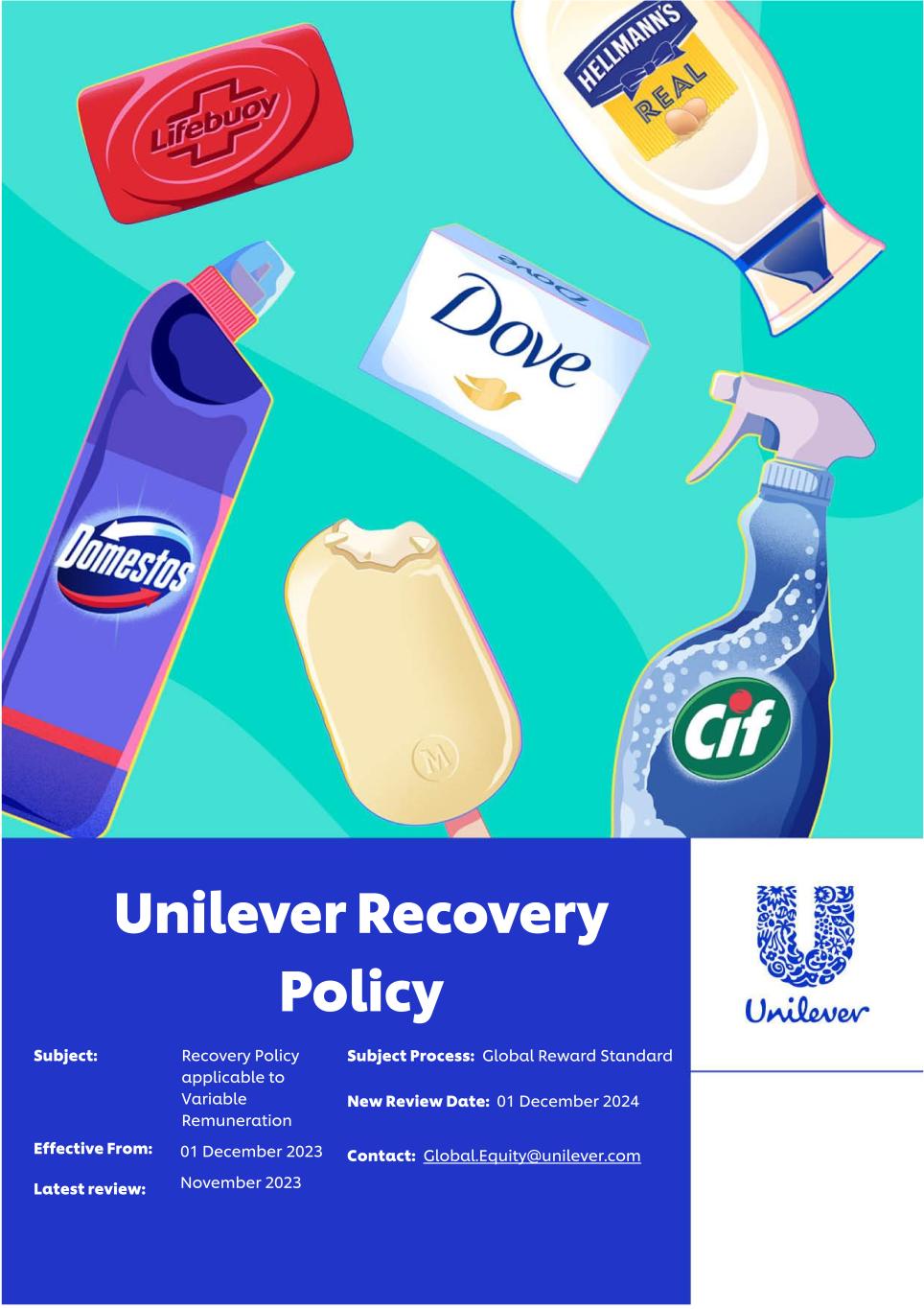 Unilever Recovery Policy Subject: Effective From: Latest review: Recovery Policy applicable to Variable Remuneration 01 December 2023 November 2023 Subject Process: Global Reward Standard New Review Date: 01 December 2024 Contact: Global.Equity@unilever.com