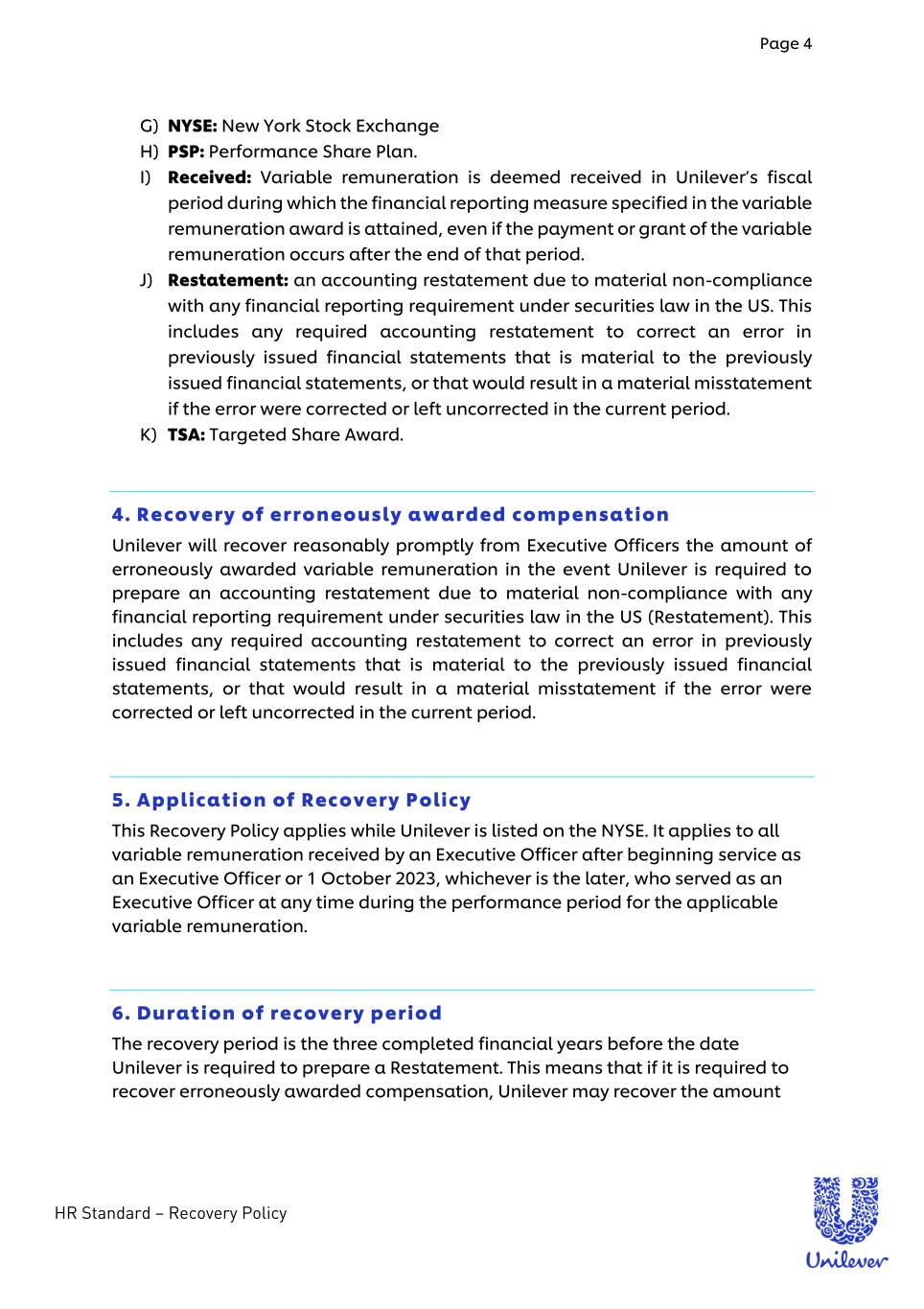 Page 3 HR Standard – Recovery Policy - Recovery Policy 1. Introduction This policy is intended to comply with section 303A.14 of the New York Stock Exchange (NYSE) Listed Company Manual, which requires companies listed on the NYSE to adopt and comply with a written Recovery Policy to recover reasonably promptly the amount of erroneously awarded variable remuneration in the event of a required accounting restatement. 2. Applies to This Recovery Policy applies to former and current members of the Unilever Leadership Executive (ULE) and any other employees as legally required from time to time (Executive Officers). This Recovery Policy applies in addition to the Malus and Clawback Policy, which can be found here: Malus Policy. This Recovery Policy applies to any relevant variable remuneration received by Executive Officers from 1 October 2023 or the date they became Executive Officers, whichever is the later. 3. Definitions A) BDA: Bonus Deferral Award. B) Executive Officers: any current member of the ULE or former member of the ULE (and any other employees as legally required from time to time) within the performance period to which any financial restatement relates. C) Erroneously awarded compensation: the amount of variable remuneration received that exceeds the amount of variable remuneration that otherwise would have been received had it been determined based on the restated amounts. D) Financial reporting measures: are measures that are determined and presented in accordance with the accounting principles used in preparing Unilever’s financial statements, and any measures that are derived wholly or in part from such measures. Stock price and total shareholder return (TSR) are also financial reporting measures. E) Variable remuneration: is any compensation that is granted, earned, or vested based wholly or in part upon the attainment of a financial reporting measure, for example, annual bonus, long-term incentive scheme (including MCIP, PSP, TSA, BDA). F) MCIP: Management Co-Investment Plan.