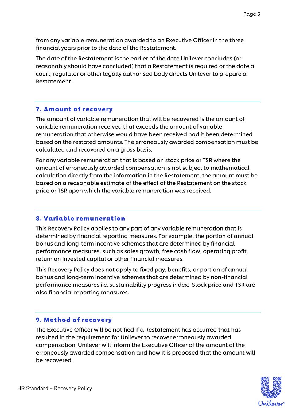Page 5 HR Standard – Recovery Policy - from any variable remuneration awarded to an Executive Officer in the three financial years prior to the date of the Restatement. The date of the Restatement is the earlier of the date Unilever concludes (or reasonably should have concluded) that a Restatement is required or the date a court, regulator or other legally authorised body directs Unilever to prepare a Restatement. 7. Amount of recovery The amount of variable remuneration that will be recovered is the amount of variable remuneration received that exceeds the amount of variable remuneration that otherwise would have been received had it been determined based on the restated amounts. The erroneously awarded compensation must be calculated and recovered on a gross basis. For any variable remuneration that is based on stock price or TSR where the amount of erroneously awarded compensation is not subject to mathematical calculation directly from the information in the Restatement, the amount must be based on a reasonable estimate of the effect of the Restatement on the stock price or TSR upon which the variable remuneration was received. 8. Variable remuneration This Recovery Policy applies to any part of any variable remuneration that is determined by financial reporting measures. For example, the portion of annual bonus and long-term incentive schemes that are determined by financial performance measures, such as sales growth, free cash flow, operating profit, return on invested capital or other financial measures. This Recovery Policy does not apply to fixed pay, benefits, or portion of annual bonus and long-term incentive schemes that are determined by non-financial performance measures i.e. sustainability progress index. Stock price and TSR are also financial reporting measures. 9. Method of recovery The Executive Officer will be notified if a Restatement has occurred that has resulted in the requirement for Unilever to recover erroneously awarded compensation. Unilever will inform the Executive Officer of the amount of the erroneously awarded compensation and how it is proposed that the amount will be recovered.