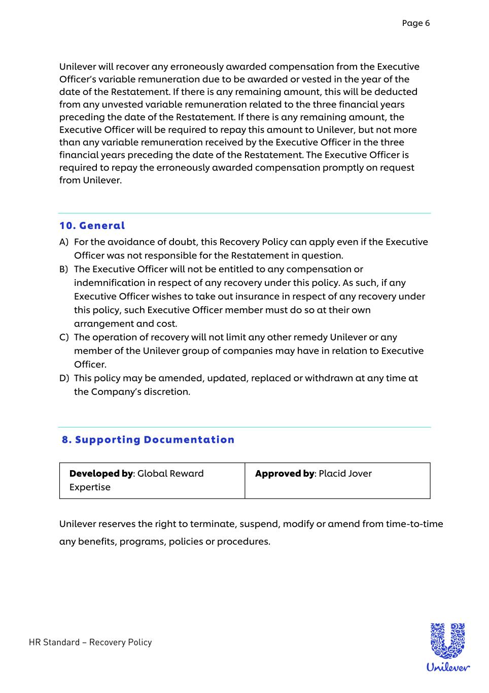 Page 6 HR Standard – Recovery Policy - Unilever will recover any erroneously awarded compensation from the Executive Officer’s variable remuneration due to be awarded or vested in the year of the date of the Restatement. If there is any remaining amount, this will be deducted from any unvested variable remuneration related to the three financial years preceding the date of the Restatement. If there is any remaining amount, the Executive Officer will be required to repay this amount to Unilever, but not more than any variable remuneration received by the Executive Officer in the three financial years preceding the date of the Restatement. The Executive Officer is required to repay the erroneously awarded compensation promptly on request from Unilever. 10. General A) For the avoidance of doubt, this Recovery Policy can apply even if the Executive Officer was not responsible for the Restatement in question. B) The Executive Officer will not be entitled to any compensation or indemnification in respect of any recovery under this policy. As such, if any Executive Officer wishes to take out insurance in respect of any recovery under this policy, such Executive Officer member must do so at their own arrangement and cost. C) The operation of recovery will not limit any other remedy Unilever or any member of the Unilever group of companies may have in relation to Executive Officer. D) This policy may be amended, updated, replaced or withdrawn at any time at the Company’s discretion. 8. Supporting Documentation Developed by: Global Reward Expertise Approved by: Placid Jover Unilever reserves the right to terminate, suspend, modify or amend from time-to-time any benefits, programs, policies or procedures.