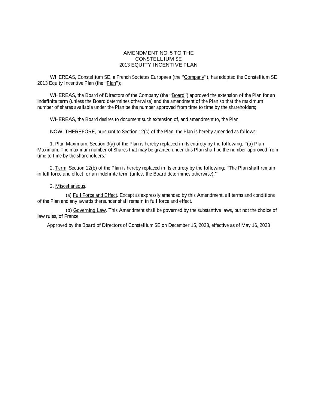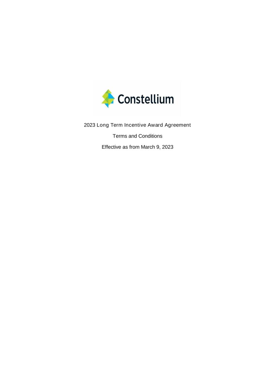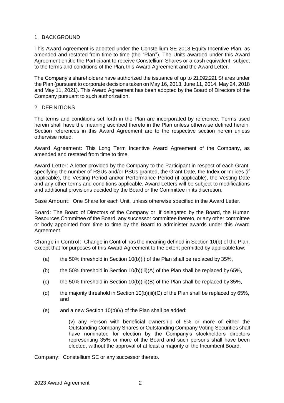 2023 Award Agreement 2 1. BACKGROUND This Award Agreement is adopted under the Constellium SE 2013 Equity Incentive Plan, as amended and restated from time to time (the “Plan”). The Units awarded under this Award Agreement entitle the Participant to receive Constellium Shares or a cash equivalent, subject to the terms and conditions of the Plan, this Award Agreement and the Award Letter. The Company’s shareholders have authorized the issuance of up to 21,092,291 Shares under the Plan (pursuant to corporate decisions taken on May 16, 2013, June 11, 2014, May 24, 2018 and May 11, 2021). This Award Agreement has been adopted by the Board of Directors of the Company pursuant to such authorization. 2. DEFINITIONS The terms and conditions set forth in the Plan are incorporated by reference. Terms used herein shall have the meaning ascribed thereto in the Plan unless otherwise defined herein. Section references in this Award Agreement are to the respective section herein unless otherwise noted. Award Agreement: This Long Term Incentive Award Agreement of the Company, as amended and restated from time to time. Award Letter: A letter provided by the Company to the Participant in respect of each Grant, specifying the number of RSUs and/or PSUs granted, the Grant Date, the Index or Indices (if applicable), the Vesting Period and/or Performance Period (if applicable), the Vesting Date and any other terms and conditions applicable. Award Letters will be subject to modifications and additional provisions decided by the Board or the Committee in its discretion. Base Amount: One Share for each Unit, unless otherwise specified in the Award Letter. Board: The Board of Directors of the Company or, if delegated by the Board, the Human Resources Committee of the Board, any successor committee thereto, or any other committee or body appointed from time to time by the Board to administer awards under this Award Agreement. Change in Control: Change in Control has the meaning defined in Section 10(b) of the Plan, except that for purposes of this Award Agreement to the extent permitted by applicable law: (a) the 50% threshold in Section 10(b)(i) of the Plan shall be replaced by 35%, (b) the 50% threshold in Section 10(b)(iii)(A) of the Plan shall be replaced by 65%, (c) the 50% threshold in Section 10(b)(iii)(B) of the Plan shall be replaced by 35%, (d) the majority threshold in Section 10(b)(iii)(C) of the Plan shall be replaced by 65%, and (e) and a new Section 10(b)(v) of the Plan shall be added: (v) any Person with beneficial ownership of 5% or more of either the Outstanding Company Shares or Outstanding Company Voting Securities shall have nominated for election by the Company’s stockholders directors representing 35% or more of the Board and such persons shall have been elected, without the approval of at least a majority of the Incumbent Board. Company: Constellium SE or any successor thereto.