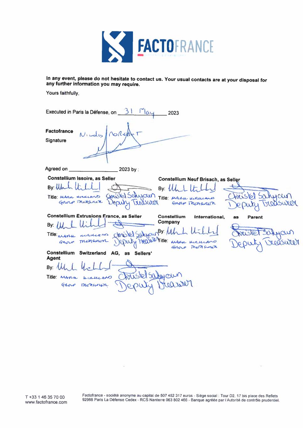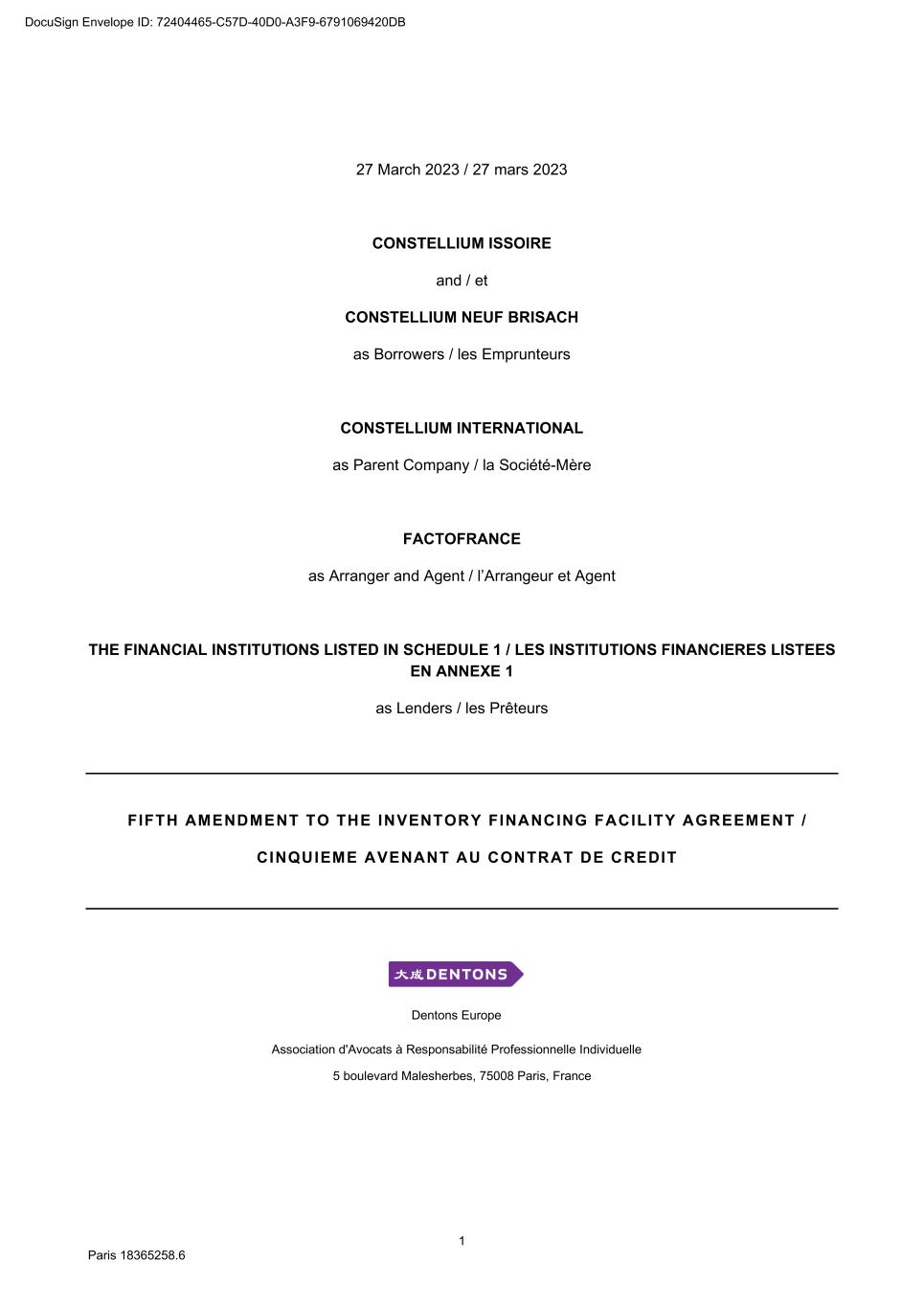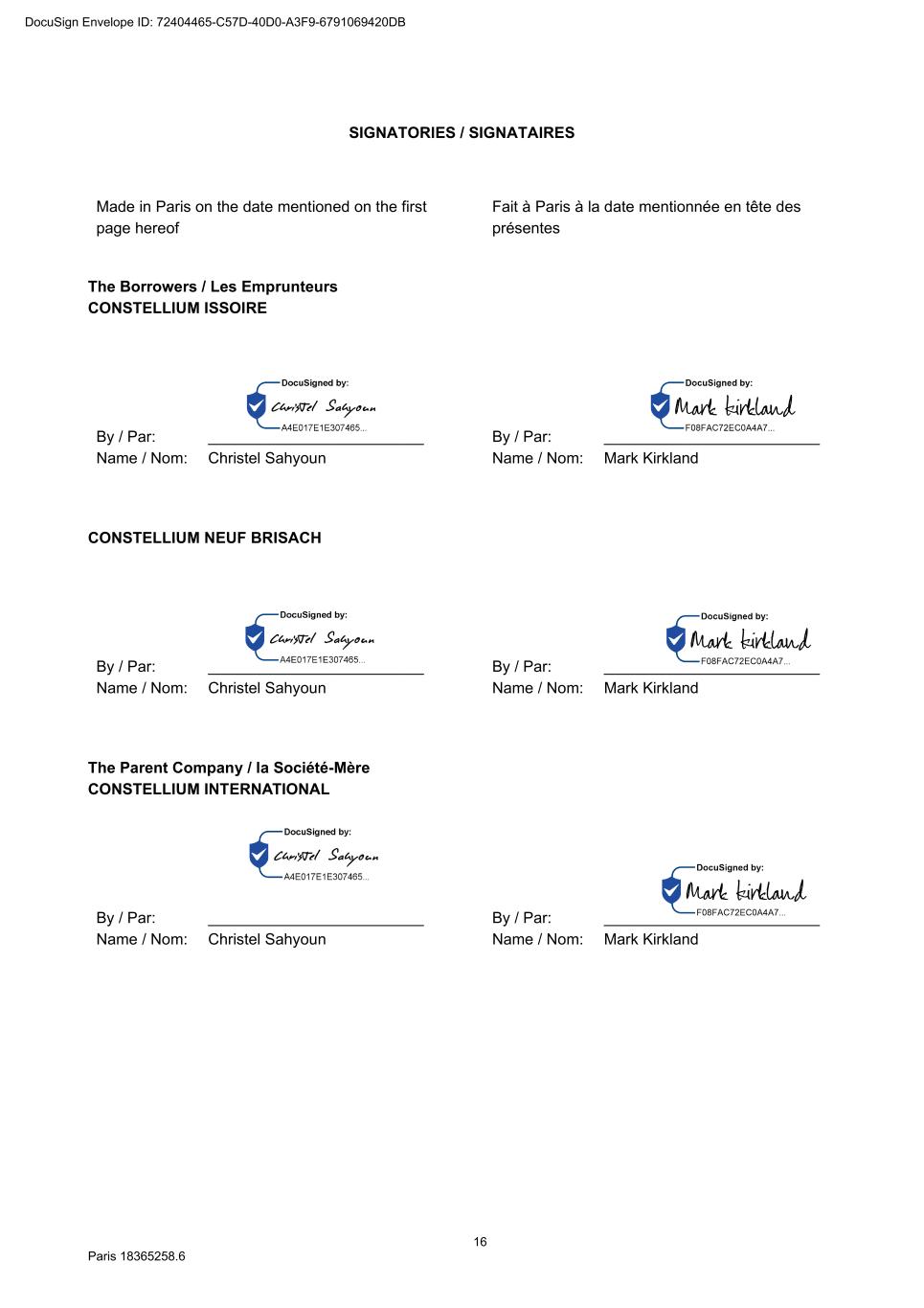 16 Paris 18365258.6 SIGNATORIES / SIGNATAIRES Made in Paris on the date mentioned on the first page hereof Fait à Paris à la date mentionnée en tête des présentes The Borrowers / Les Emprunteurs CONSTELLIUM ISSOIRE By / Par: _________________________ Name / Nom: Christel Sahyoun By / Par: _________________________ Name / Nom: Mark Kirkland CONSTELLIUM NEUF BRISACH By / Par: _________________________ Name / Nom: Christel Sahyoun By / Par: _________________________ Name / Nom: Mark Kirkland The Parent Company / la Société-Mère CONSTELLIUM INTERNATIONAL By / Par: _________________________ Name / Nom: Christel Sahyoun By / Par: _________________________ Name / Nom: Mark Kirkland DocuSign Envelope ID: 72404465-C57D-40D0-A3F9-6791069420DB