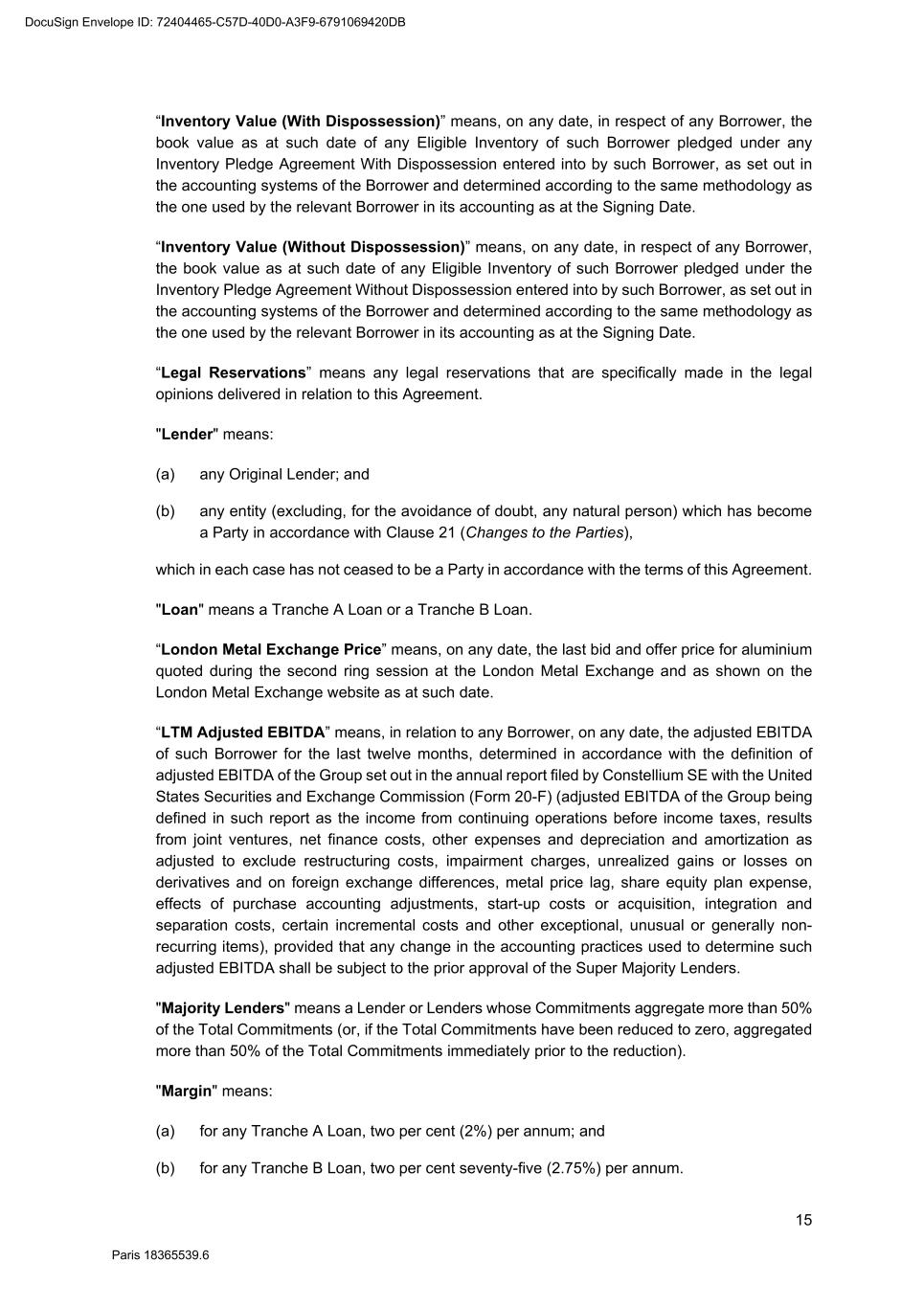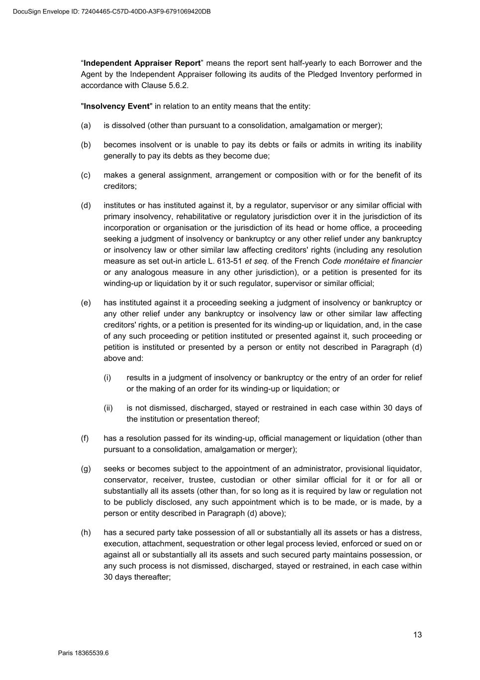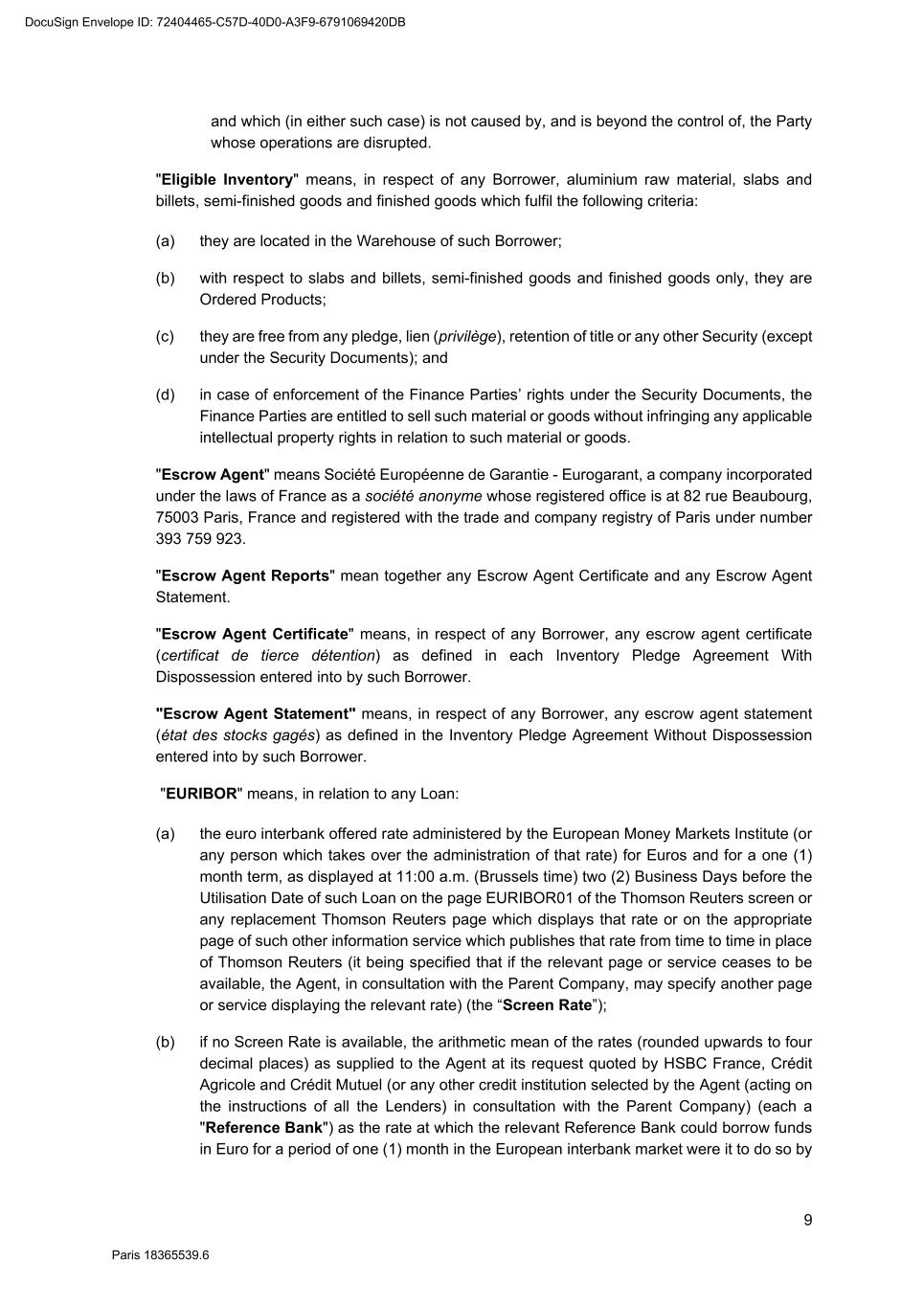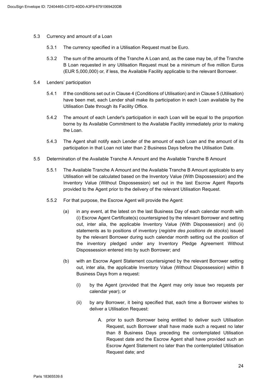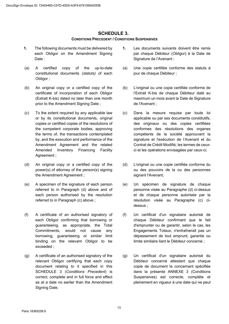 82 Paris 18365539.6 (c) Legal opinion by Dentons Europe in respect of the validity and enforceability of the Finance Documents to be executed on the Signing Date drafted by them. 3. Other documents and evidence (a) Execution of this Agreement and the Fee Letters. (b) Report from the Escrow Agent satisfactory to the Agent. (c) All costs and expenses (including the Agent’s and the Arranger’s legal costs, to the extent invoiced in due time) then due and payable by each Obligor under the Finance Documents have been paid. Part 2 – Conditions Precedent at the first Utilisation Date 1. Documents and evidence (a) Execution of the Security Documents substantially in the form set out in SCHEDULE 10 (Form of Security Documents) or in such other form as may be agreed between the Agent (acting on the instructions of all the Lenders) and the Parent Company, provided that the Agent may request to be provided by each Borrower, on or before the execution of such Security Documents, with the following documents: (i) a certified copy of the up-to-date constitutional documents (statuts) of each Borrower if such constitutional documents have been modified since the Signing Date; (ii) an original copy or a certified copy of the certificate of incorporation of each Borrower (Extrait K-bis) if the certificate of incorporation of such Borrower delivered to the Agent as condition precedent to the Signing Date is more than two months old; (iii) an original copy or a certified copy of a statement of charges over assets and encumbrances (état des inscriptions et nantissements), including a statement as to pledges without dispossession (gages sans dépossession), in relation to each Borrower, if the statement of charges over assets and encumbrances of such Borrower delivered to the Agent as condition precedent to the Signing Date is more than two months old; and (iv) if necessary, original copies or certified copies of the resolutions of the competent corporate bodies, approving the terms of, the transactions contemplated by, and the execution and performance of the Security Documents to be executed by it and an original copy or a certified copy of the power(s) of attorney of the person(s) signing the Security Documents to be executed by it. (b) Execution of any necessary document with the Escrow Agent and the Independent Appraiser. (c) Evidence that an insurance policy complying with the terms of the Finance Documents has been entered into by each Borrower in relation to its Pledged Inventory and that the related premiums have been paid to the insurer. (d) All costs and expenses (including the Agent’s and the Arranger’s legal costs) then due and payable by each Obligor under the Finance Documents have been paid. DocuSign Envelope ID: 72404465-C57D-40D0-A3F9-6791069420DB