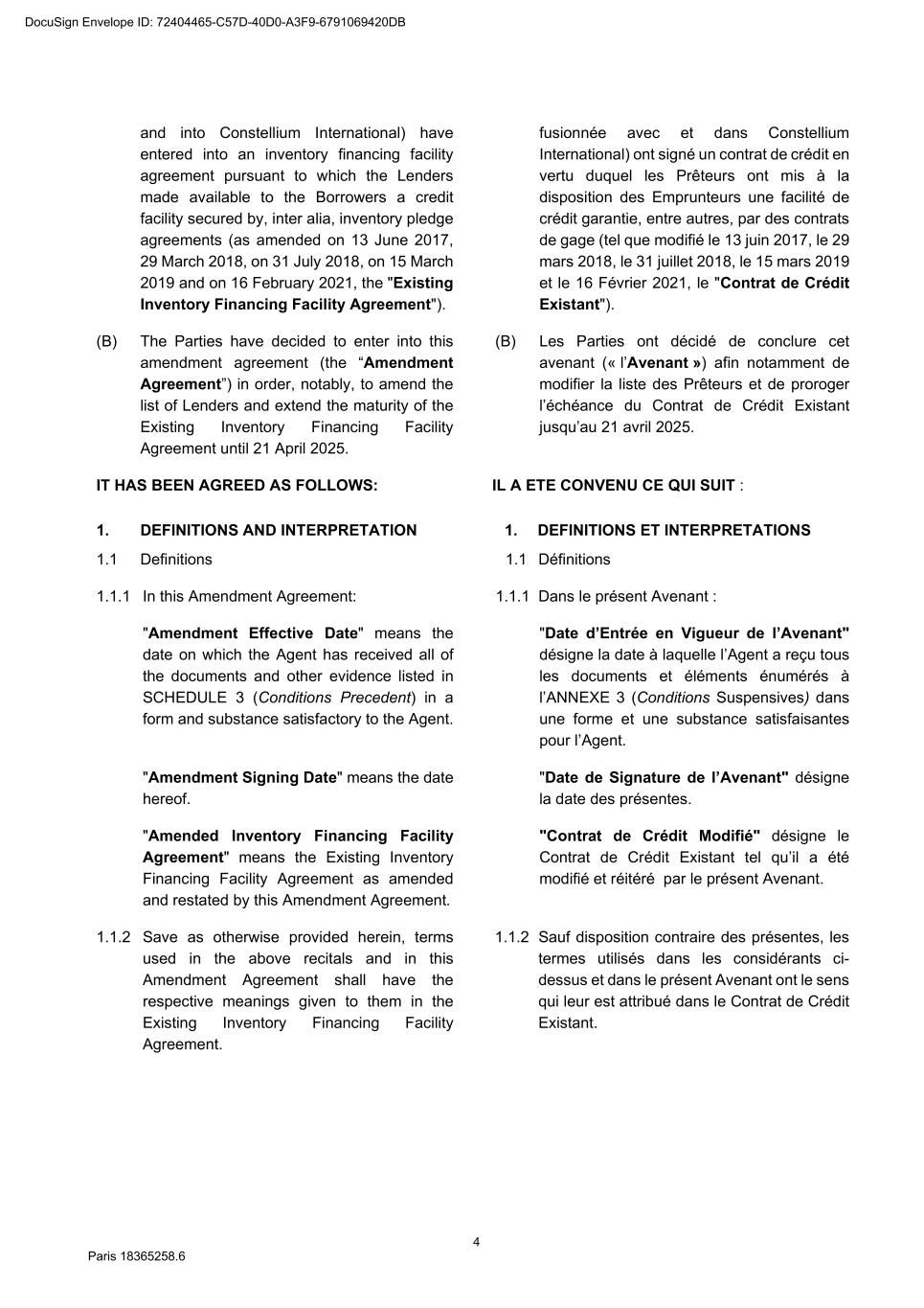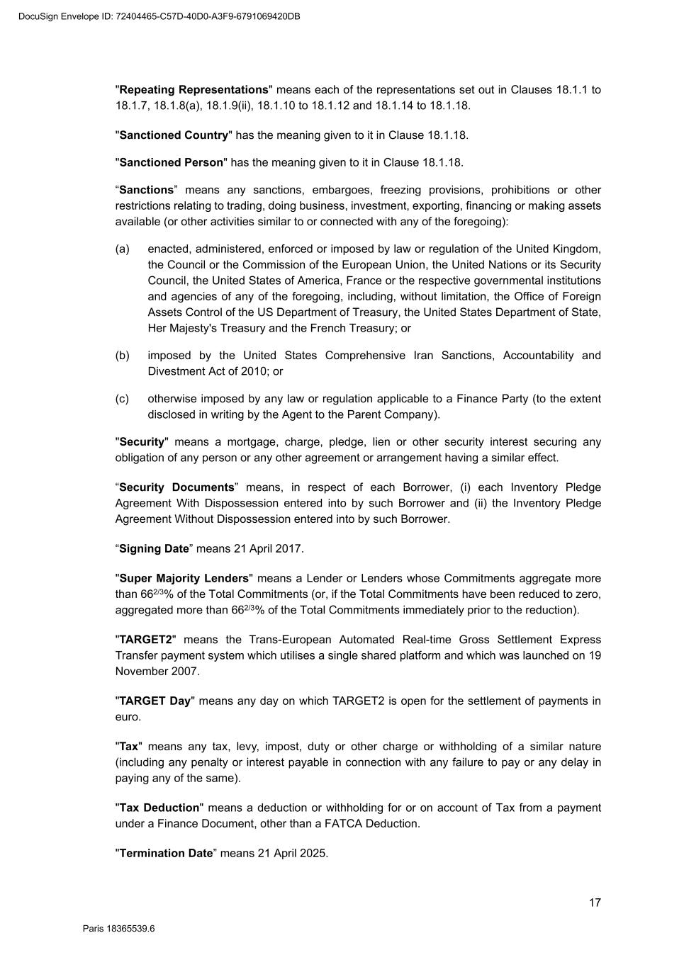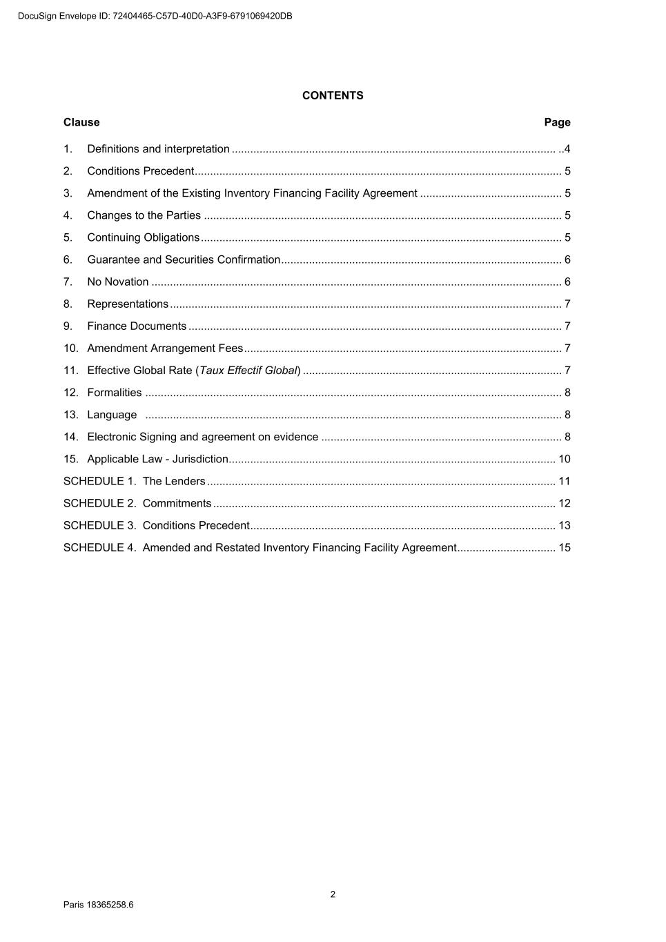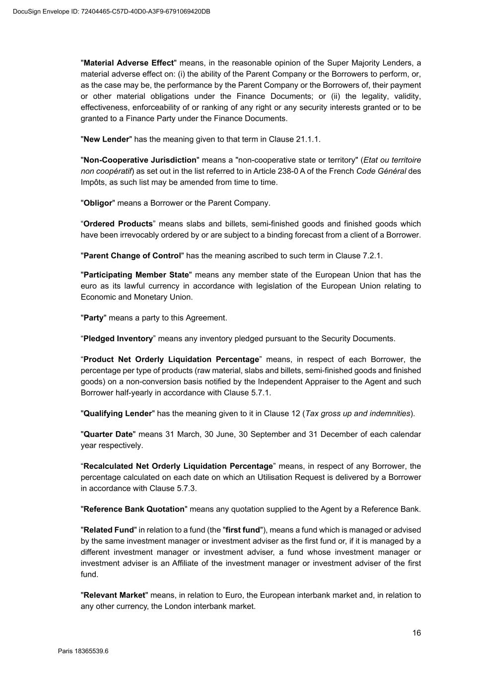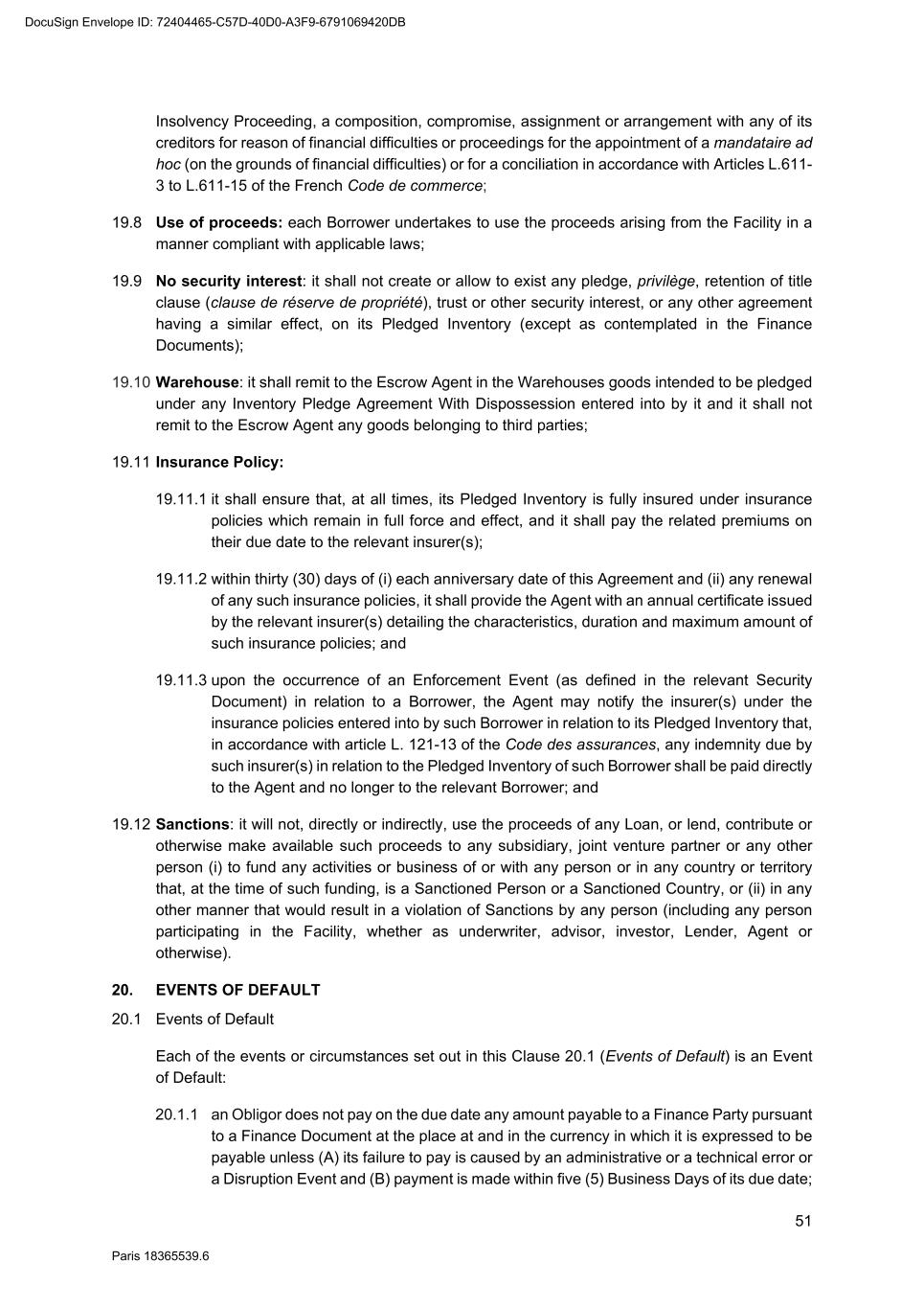 82 Paris 18365539.6 (c) Legal opinion by Dentons Europe in respect of the validity and enforceability of the Finance Documents to be executed on the Signing Date drafted by them. 3. Other documents and evidence (a) Execution of this Agreement and the Fee Letters. (b) Report from the Escrow Agent satisfactory to the Agent. (c) All costs and expenses (including the Agent’s and the Arranger’s legal costs, to the extent invoiced in due time) then due and payable by each Obligor under the Finance Documents have been paid. Part 2 – Conditions Precedent at the first Utilisation Date 1. Documents and evidence (a) Execution of the Security Documents substantially in the form set out in SCHEDULE 10 (Form of Security Documents) or in such other form as may be agreed between the Agent (acting on the instructions of all the Lenders) and the Parent Company, provided that the Agent may request to be provided by each Borrower, on or before the execution of such Security Documents, with the following documents: (i) a certified copy of the up-to-date constitutional documents (statuts) of each Borrower if such constitutional documents have been modified since the Signing Date; (ii) an original copy or a certified copy of the certificate of incorporation of each Borrower (Extrait K-bis) if the certificate of incorporation of such Borrower delivered to the Agent as condition precedent to the Signing Date is more than two months old; (iii) an original copy or a certified copy of a statement of charges over assets and encumbrances (état des inscriptions et nantissements), including a statement as to pledges without dispossession (gages sans dépossession), in relation to each Borrower, if the statement of charges over assets and encumbrances of such Borrower delivered to the Agent as condition precedent to the Signing Date is more than two months old; and (iv) if necessary, original copies or certified copies of the resolutions of the competent corporate bodies, approving the terms of, the transactions contemplated by, and the execution and performance of the Security Documents to be executed by it and an original copy or a certified copy of the power(s) of attorney of the person(s) signing the Security Documents to be executed by it. (b) Execution of any necessary document with the Escrow Agent and the Independent Appraiser. (c) Evidence that an insurance policy complying with the terms of the Finance Documents has been entered into by each Borrower in relation to its Pledged Inventory and that the related premiums have been paid to the insurer. (d) All costs and expenses (including the Agent’s and the Arranger’s legal costs) then due and payable by each Obligor under the Finance Documents have been paid. DocuSign Envelope ID: 72404465-C57D-40D0-A3F9-6791069420DB